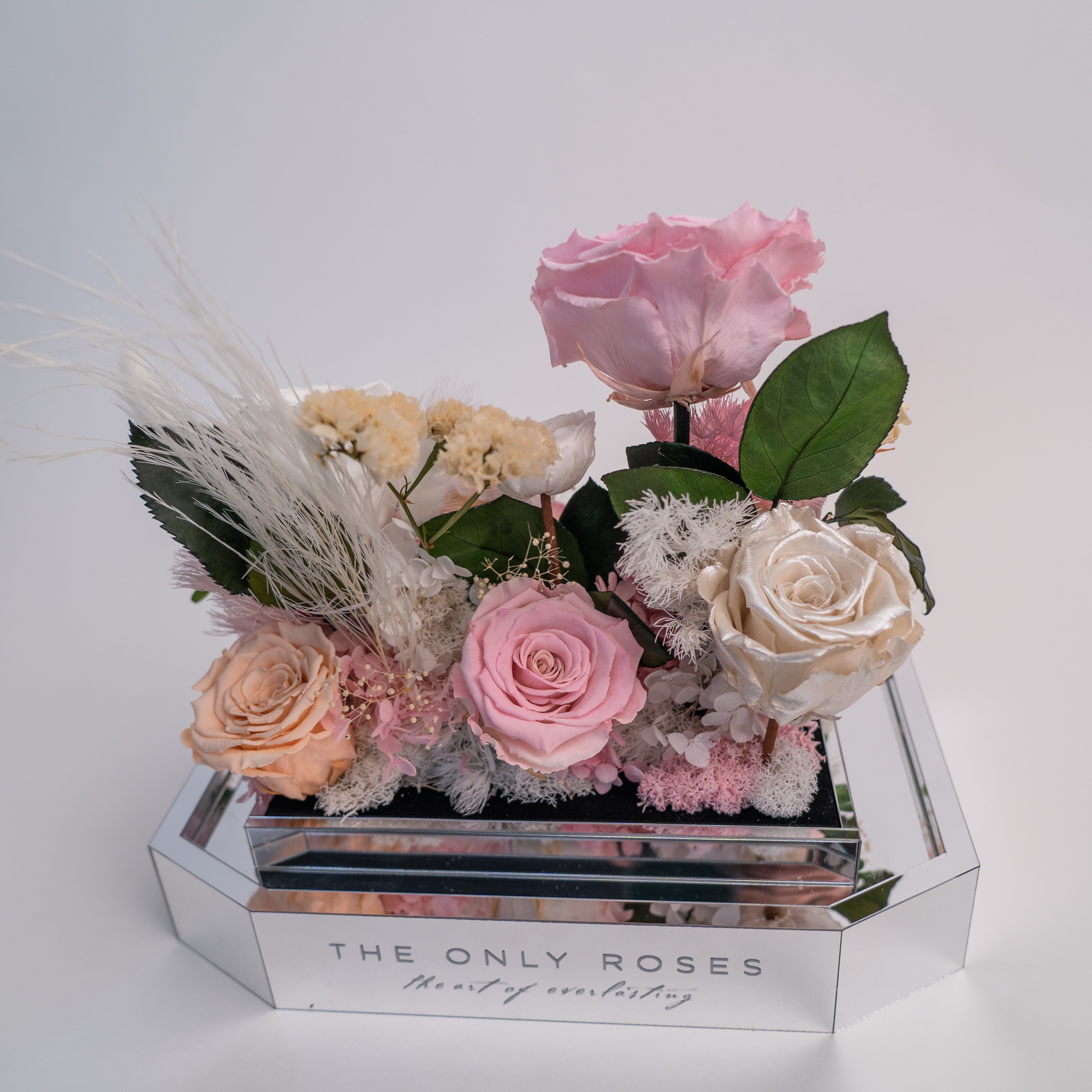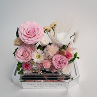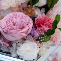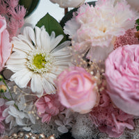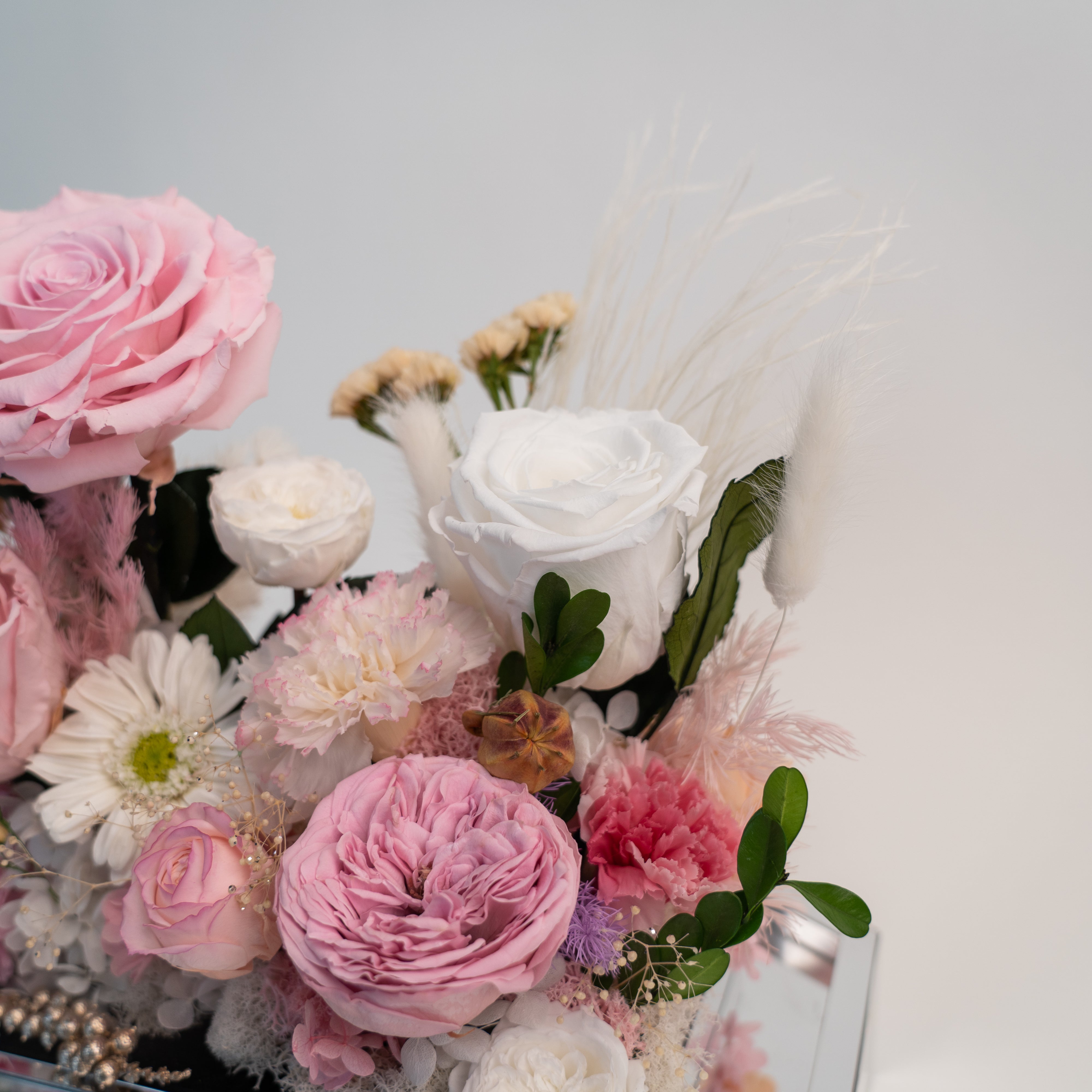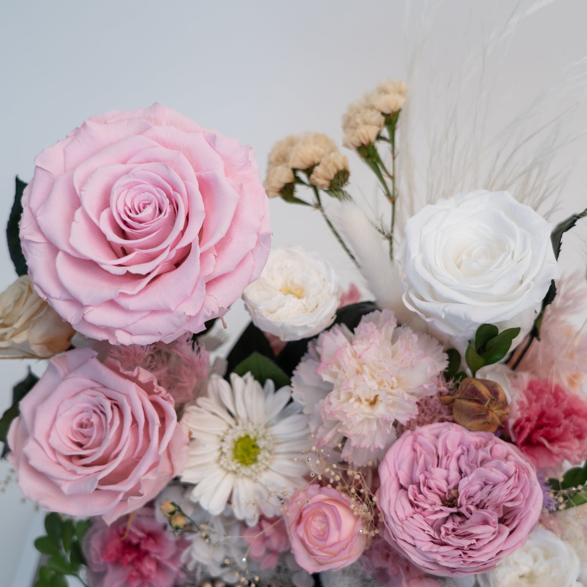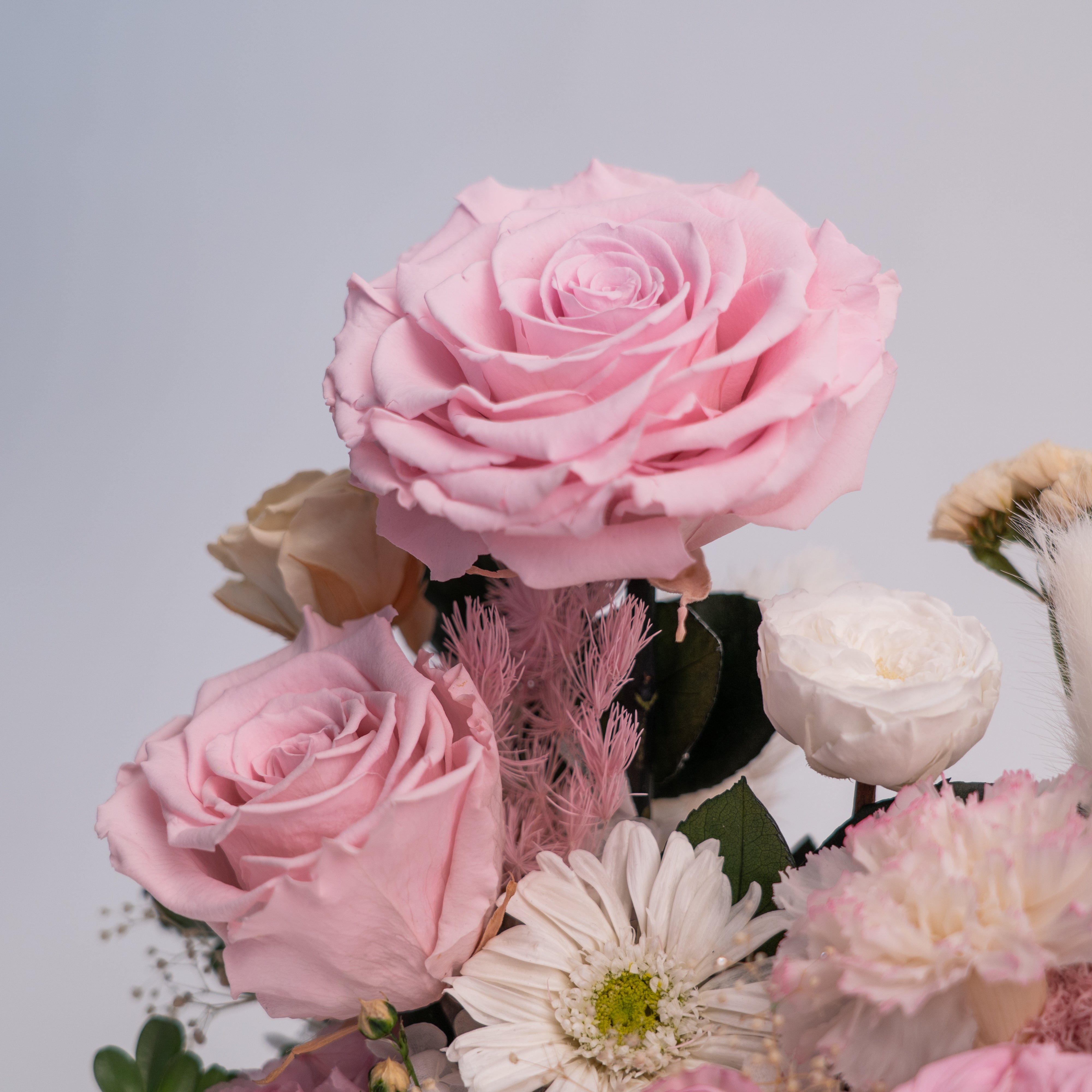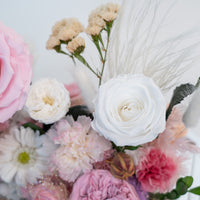 Introducing our exquisite preserved floral arrangement featuring a stunning mix of blush-hued blooms. Expertly crafted by our skilled artisans, this arrangement exudes timeless elegance and grace. Each bloom is carefully preserved to maintain its natural texture and beauty, creating a stunning centerpiece for your home or office. With its delicate shades of pink and soft, velvety petals, this arrangement is perfect for adding a touch of sophistication and charm to any space. Whether as a thoughtful gift or a special treat for yourself, our blush-colored preserved floral arrangement is sure to impress and delight.