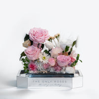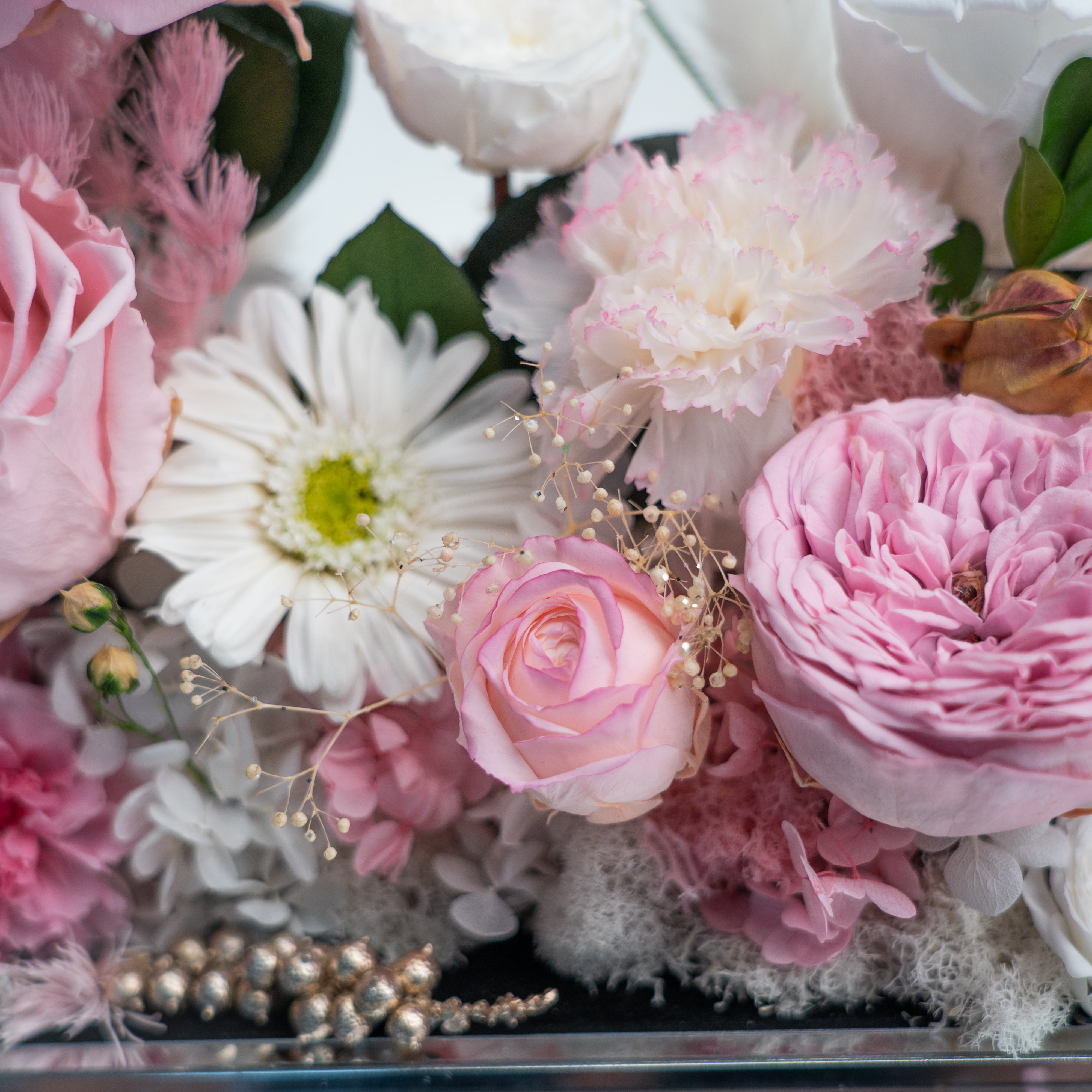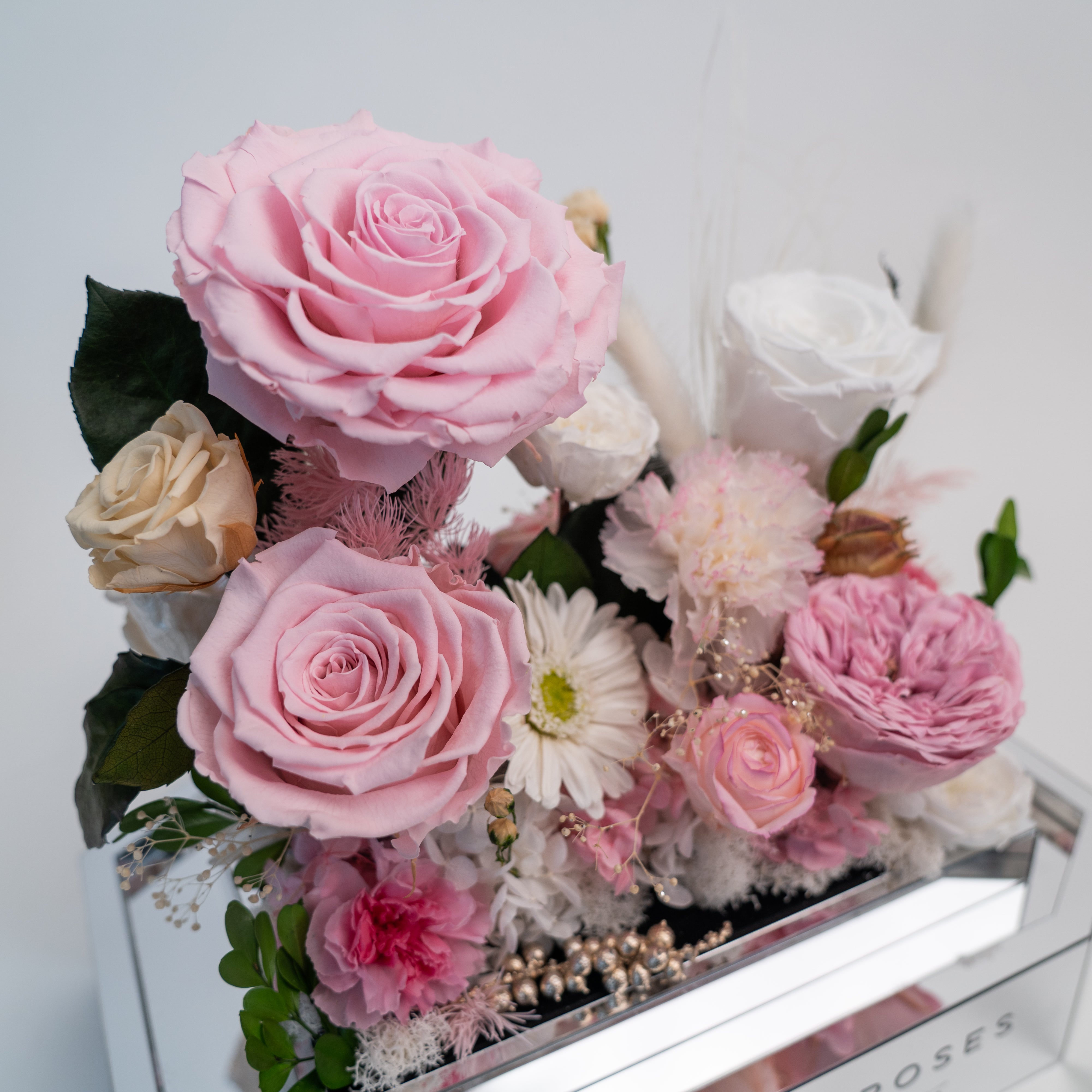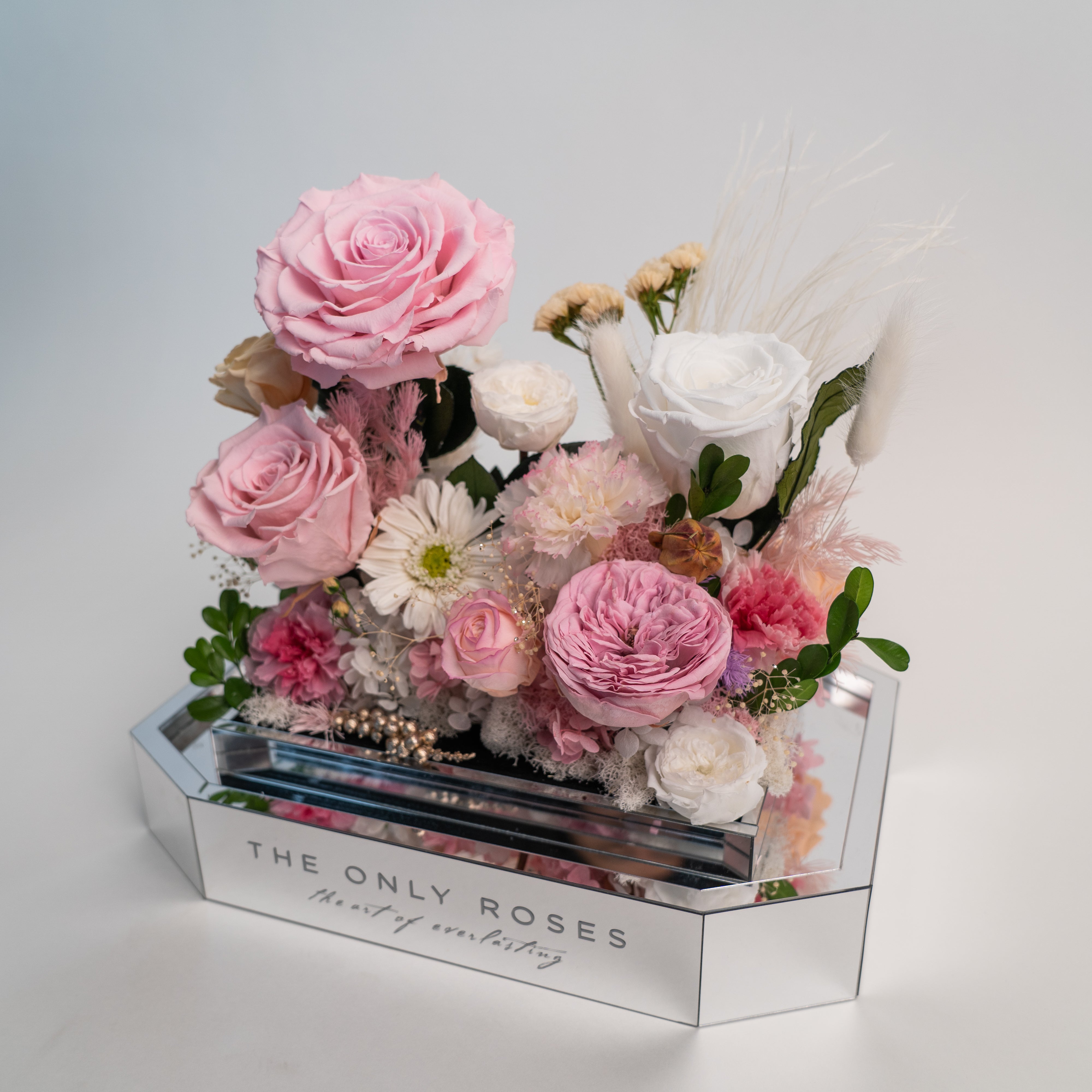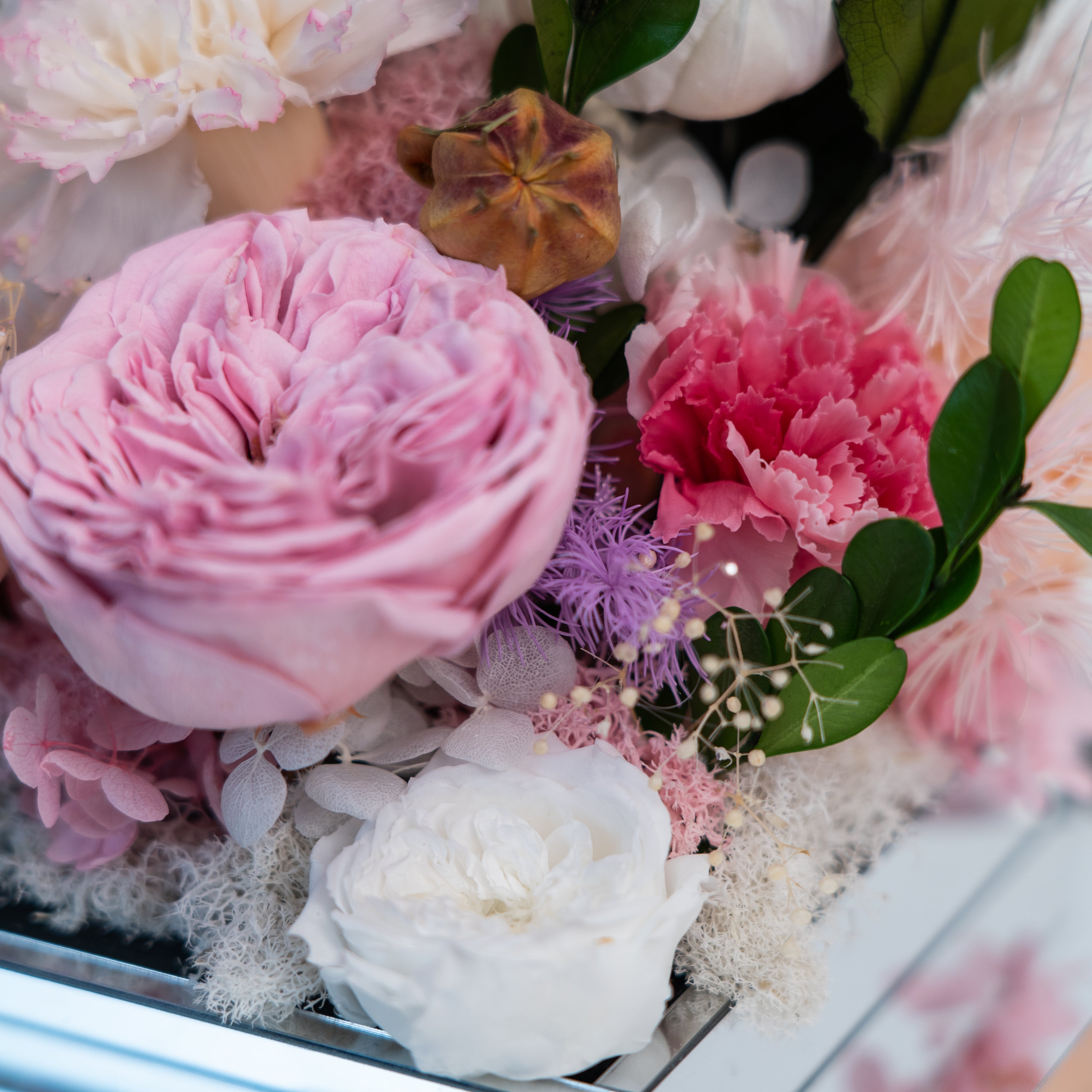 Introducing our exquisite preserved floral arrangement featuring a stunning mix of blush-hued blooms. Expertly crafted by our skilled artisans, this arrangement exudes timeless elegance and grace. Each bloom is carefully preserved to maintain its natural texture and beauty, creating a stunning centerpiece for your home or office. With its delicate shades of pink and soft, velvety petals, this arrangement is perfect for adding a touch of sophistication and charm to any space. Whether as a thoughtful gift or a special treat for yourself, our blush-colored preserved floral arrangement is sure to impress and delight.