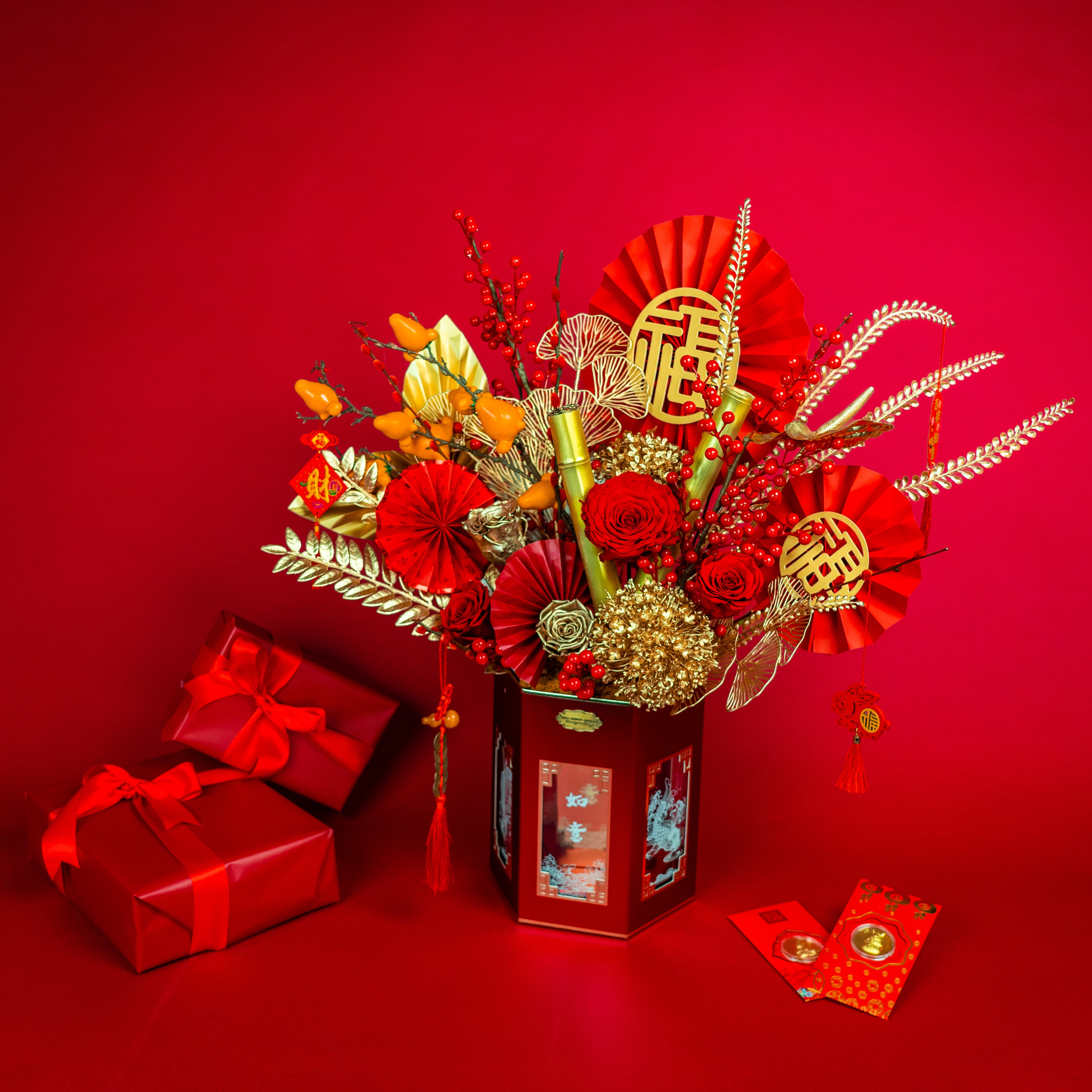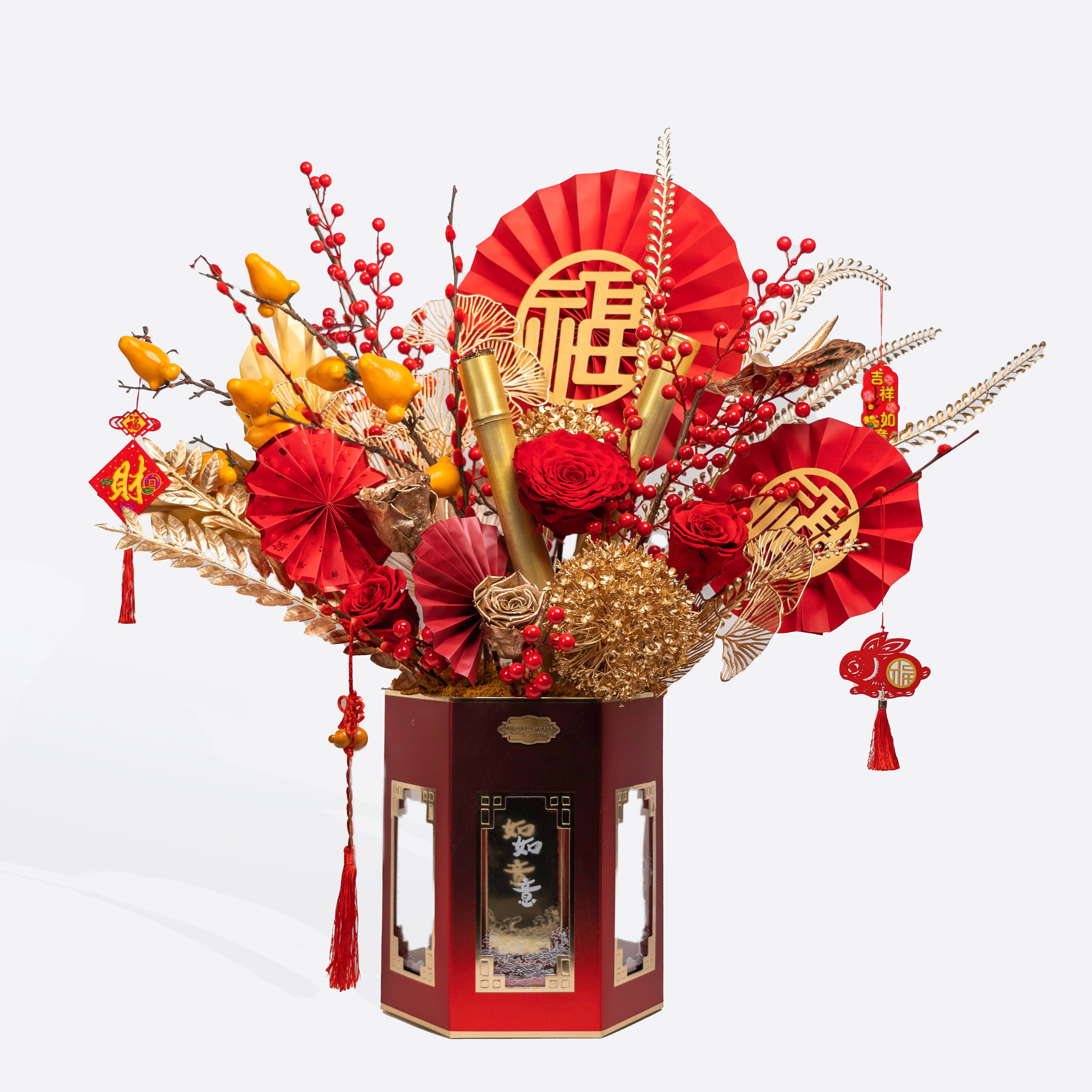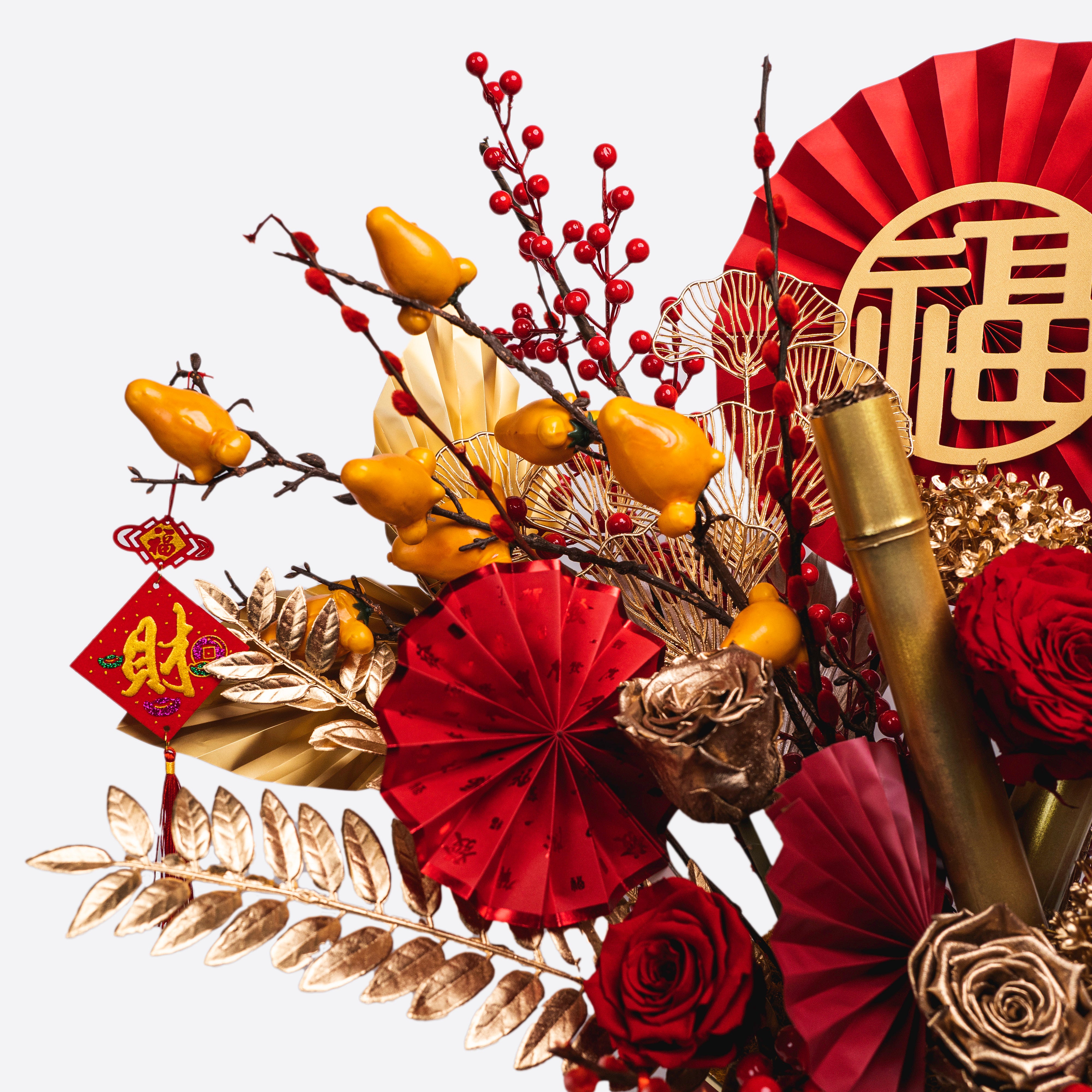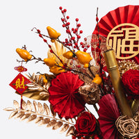 Bring a touch of luck and prosperity to your Lunar New Year celebrations with our Lucky Bamboo floral arrangement. This vibrant design features preserved red and gold roses, golden hydrangeas, and lifelike lucky bamboo shoots, which symbolize strength, resilience, and good fortune. The arrangement is further adorned with festive fan accents, lush berry sprigs, and delicate golden leaves, creating a harmonious and luxurious display.