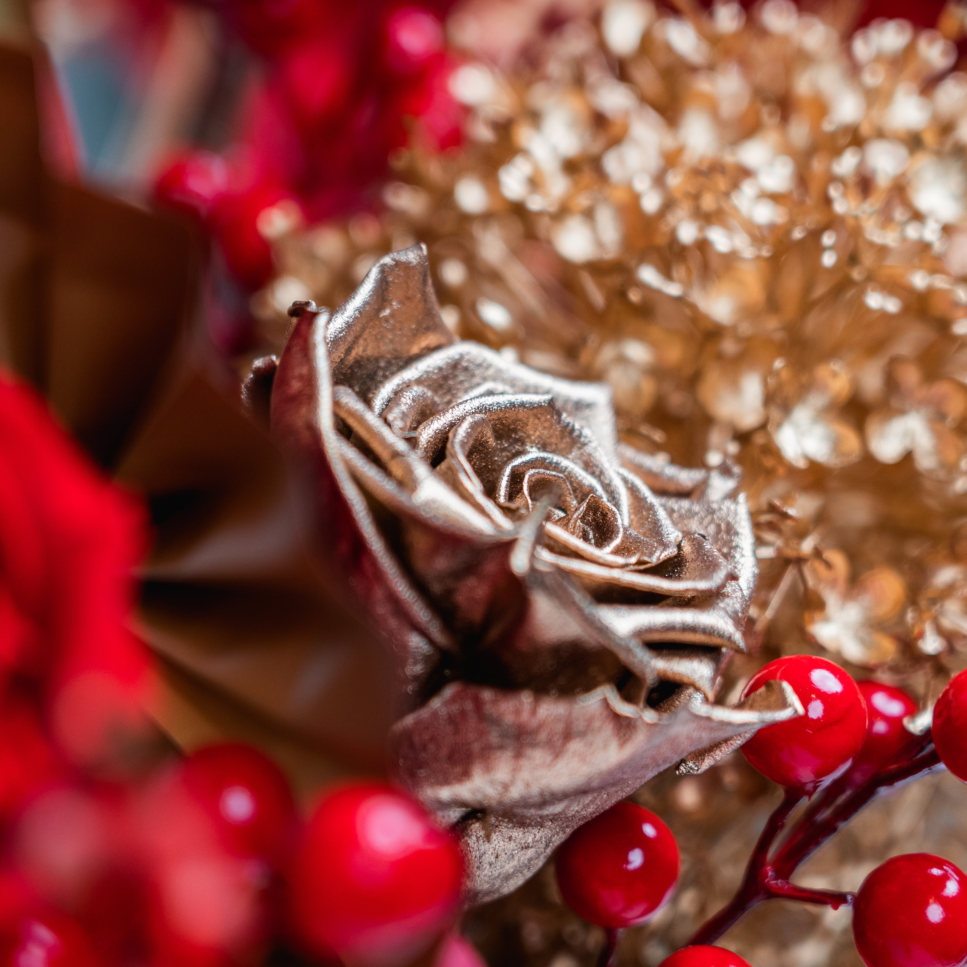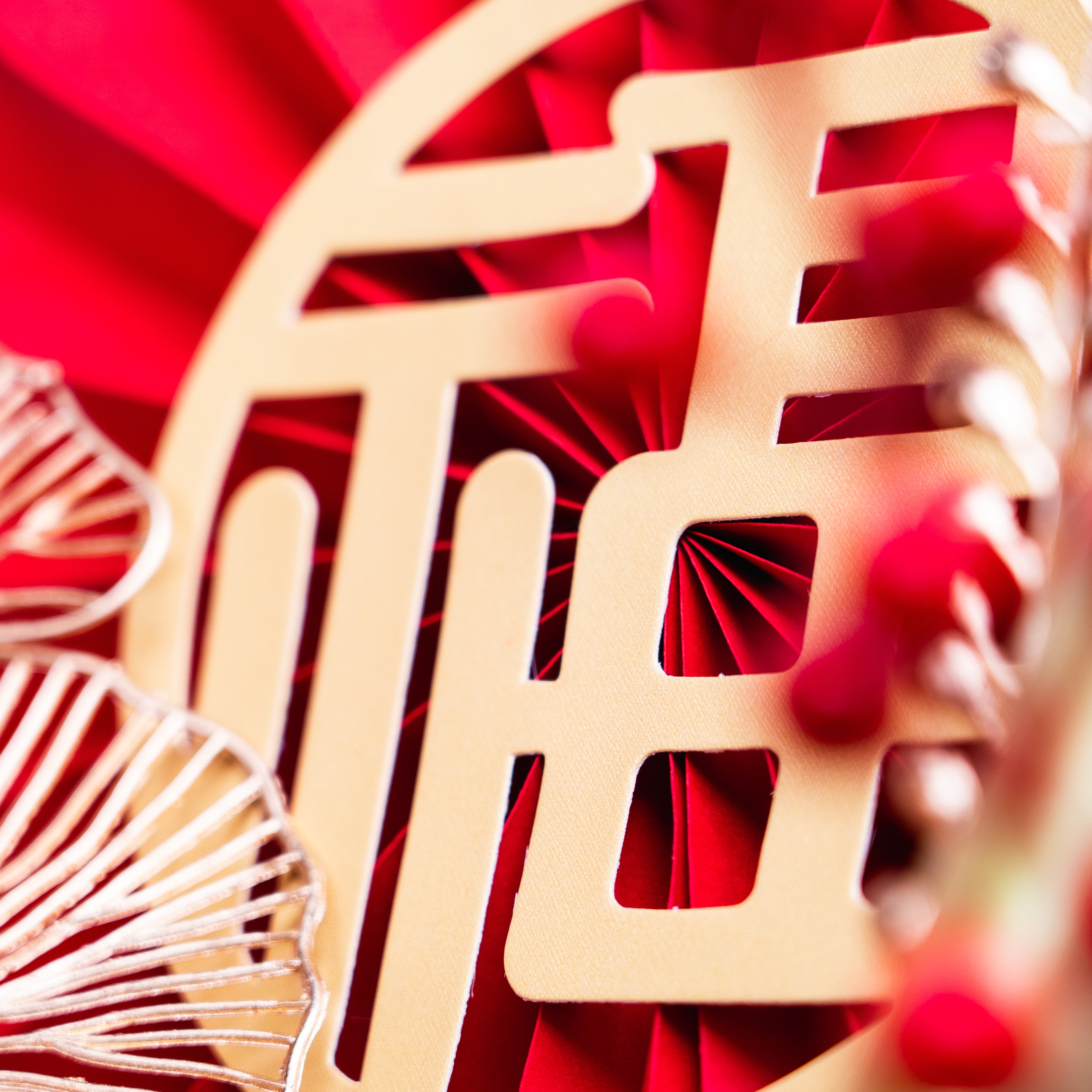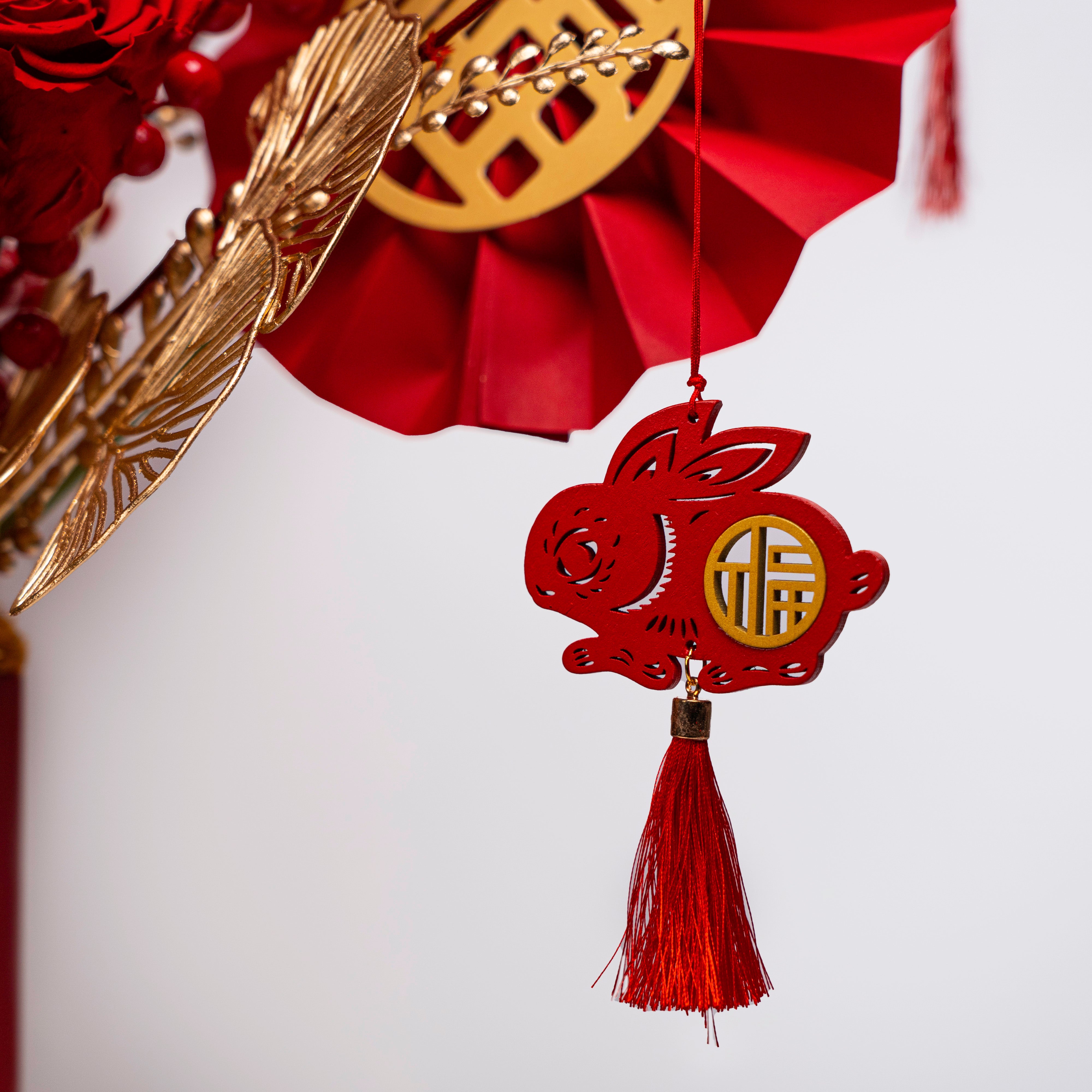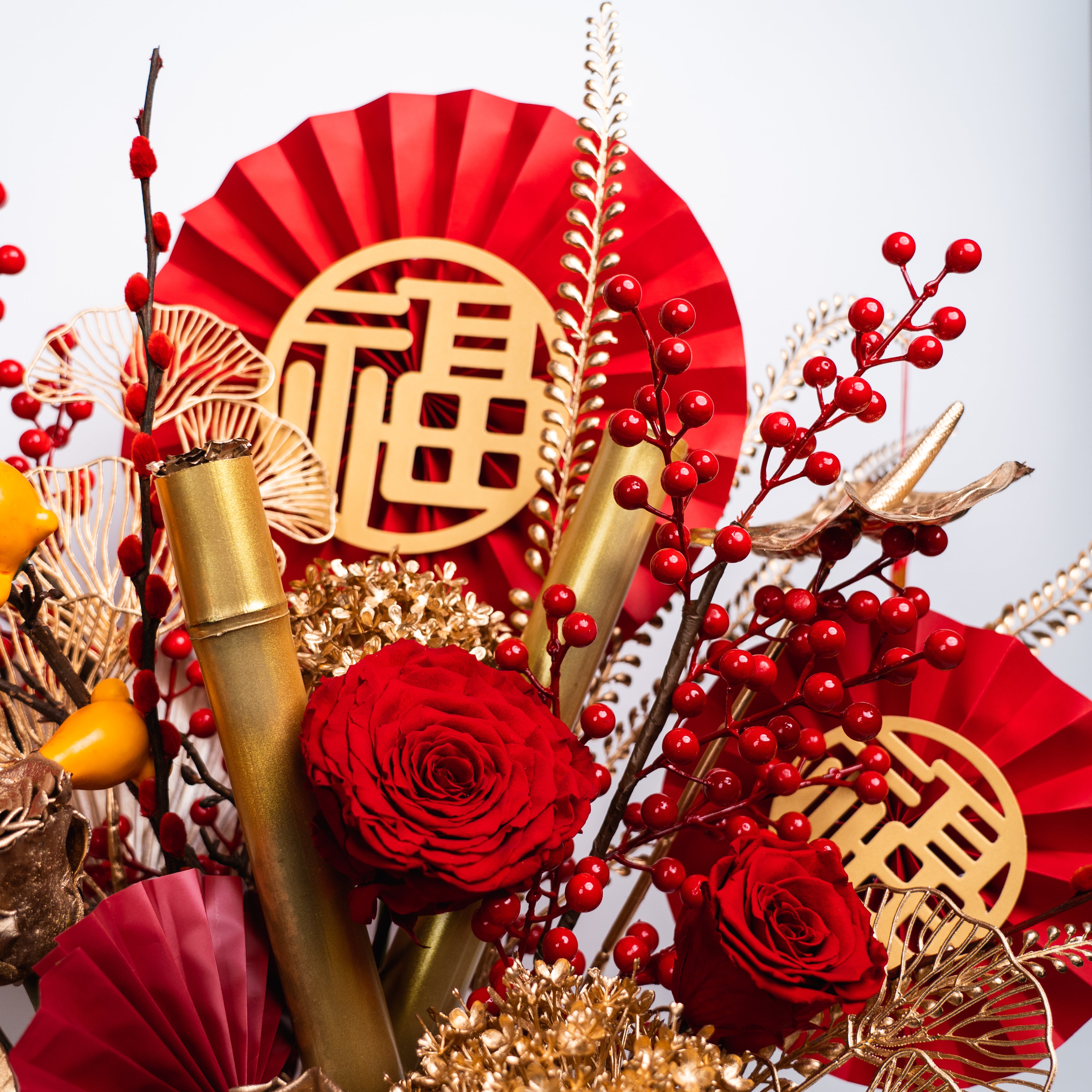 Bring a touch of luck and prosperity to your Lunar New Year celebrations with our Lucky Bamboo floral arrangement. This vibrant design features preserved red and gold roses, golden hydrangeas, and lifelike lucky bamboo shoots, which symbolize strength, resilience, and good fortune. The arrangement is further adorned with festive fan accents, lush berry sprigs, and delicate golden leaves, creating a harmonious and luxurious display.