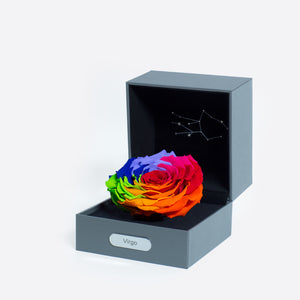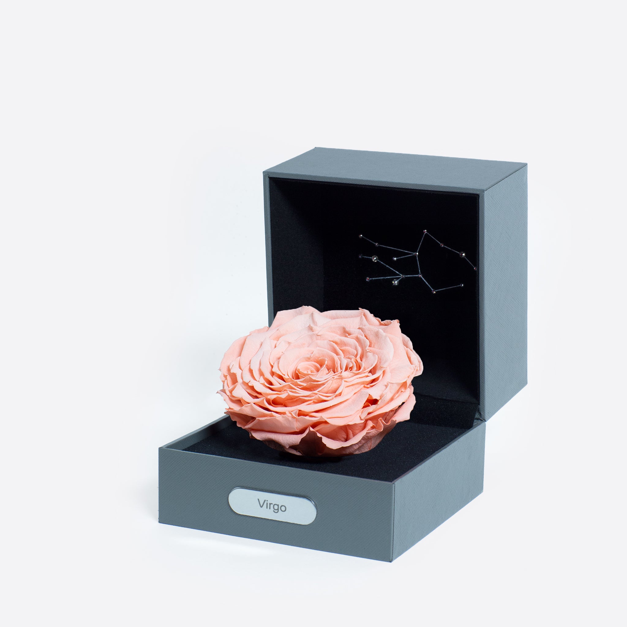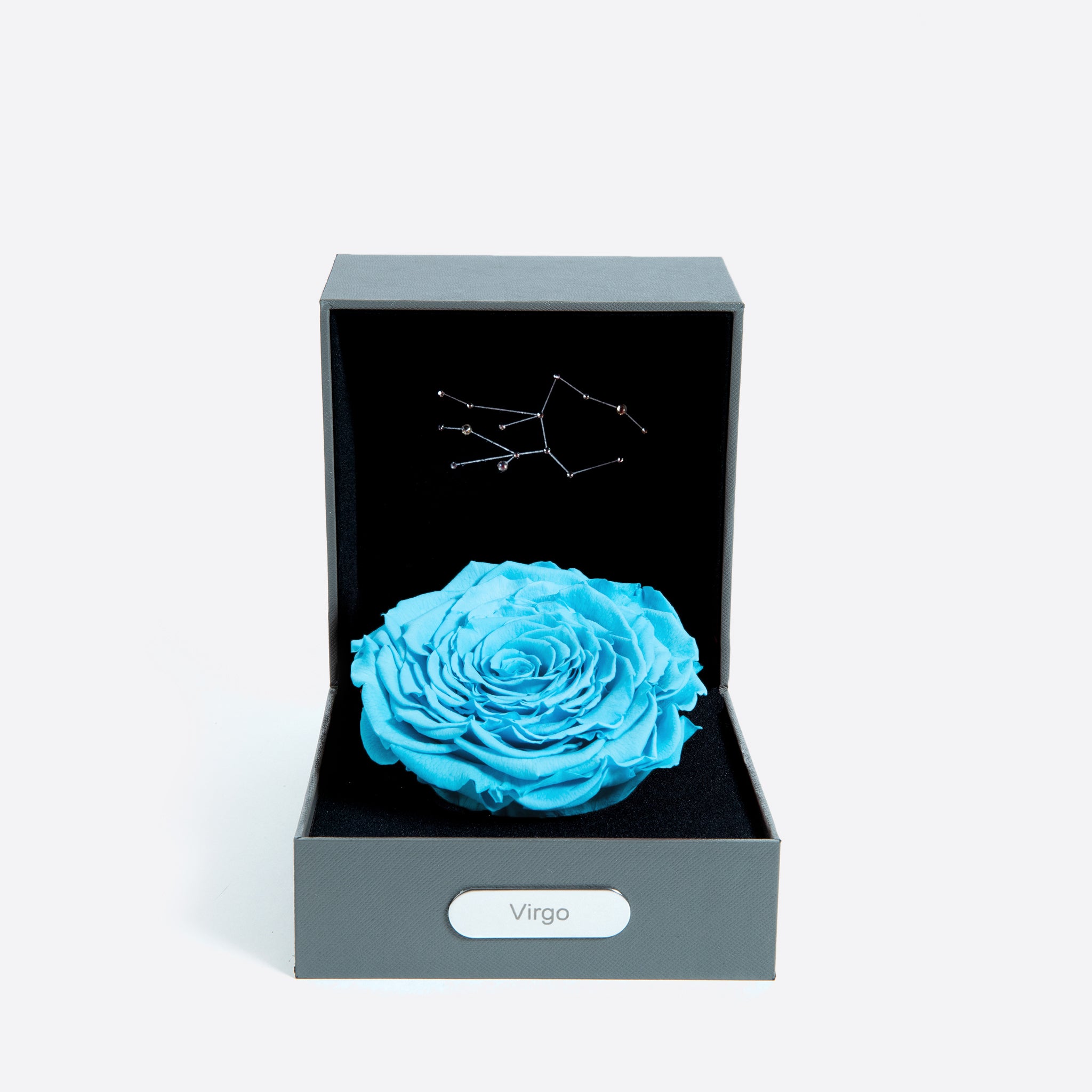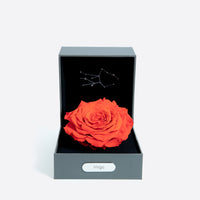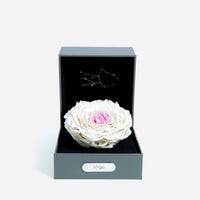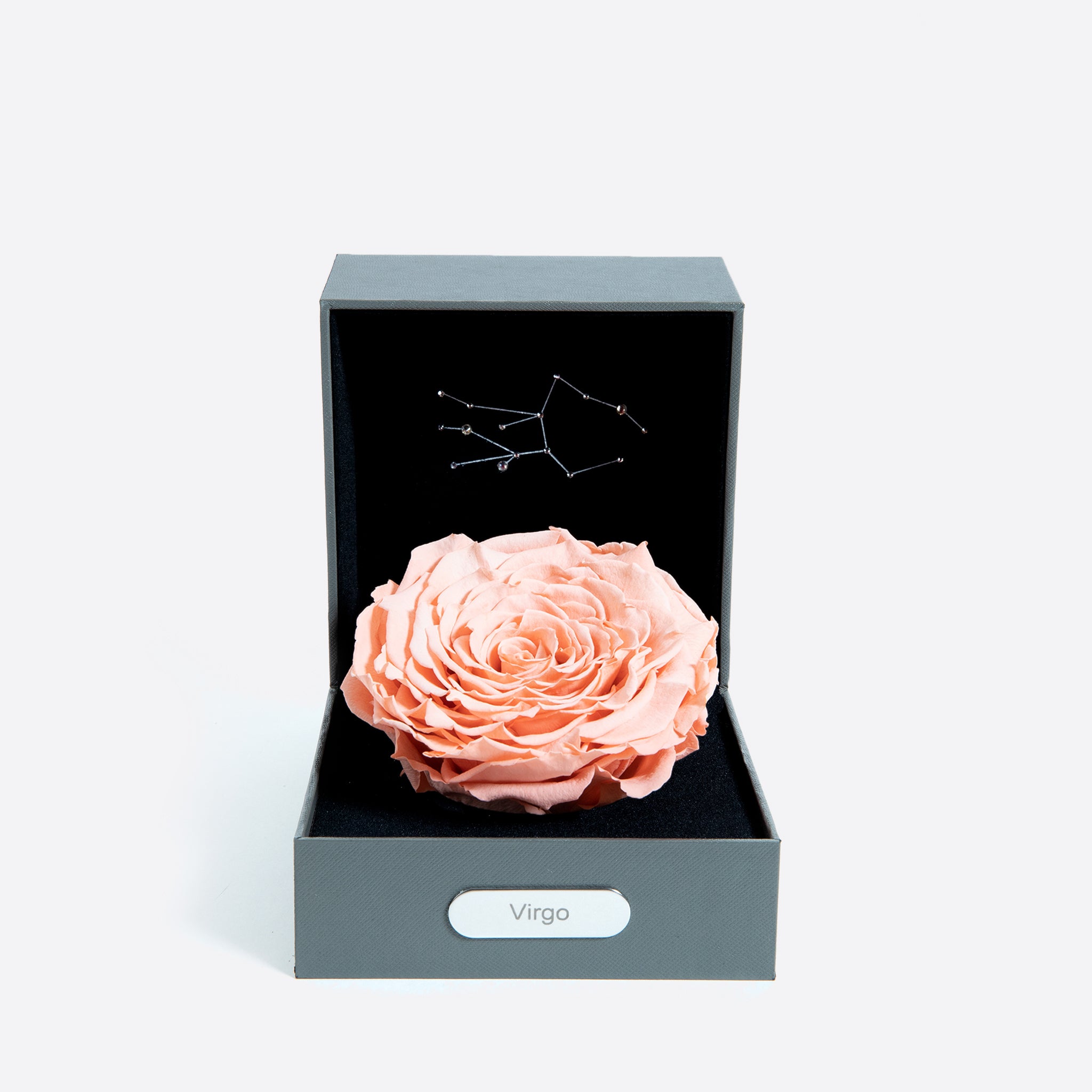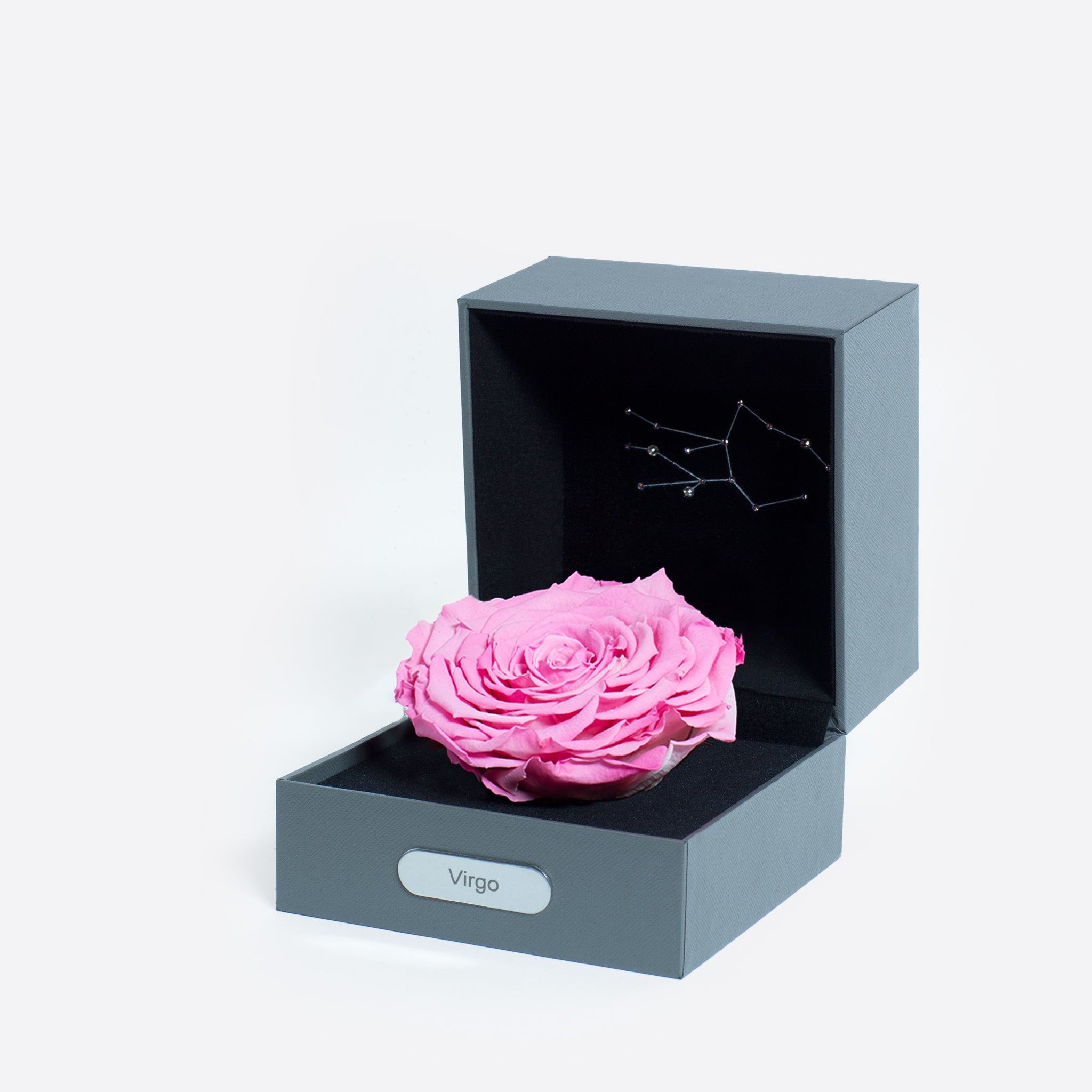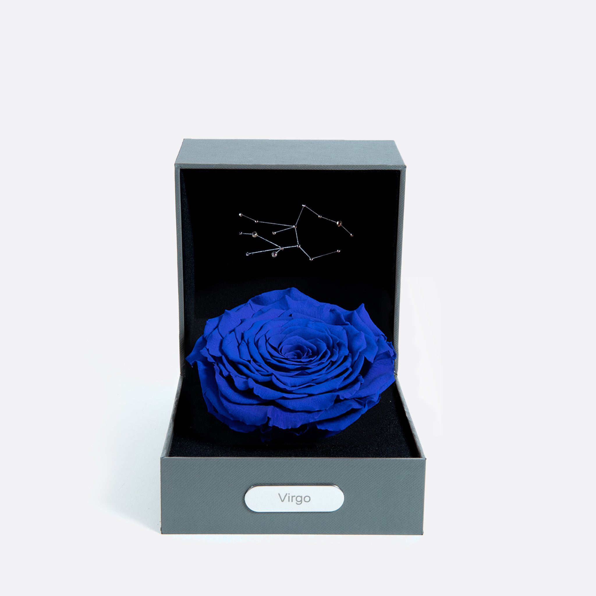 Celebrate your sweetie’s devotion with this stunning gift box containing a single, enormous Everlasting Rose bud. Each flower has been carefully arranged so that the petals are fully opened and on display. The arrangement is set against a black background to mimic a “night sky” with a sparkling constellation of the Virgo sign done in faux diamonds.