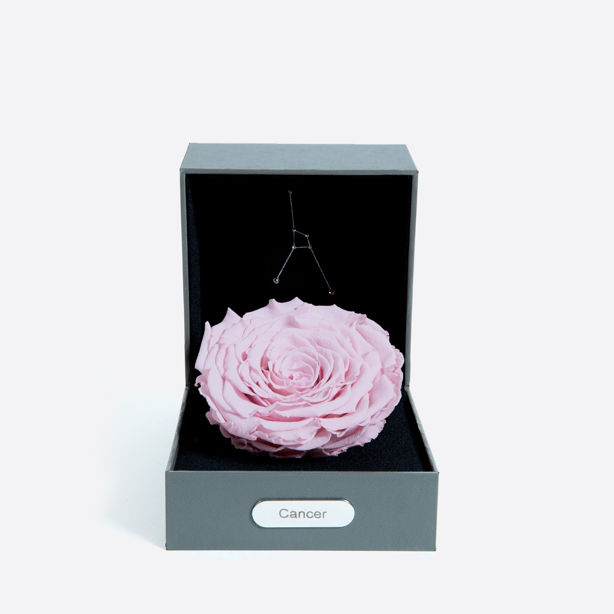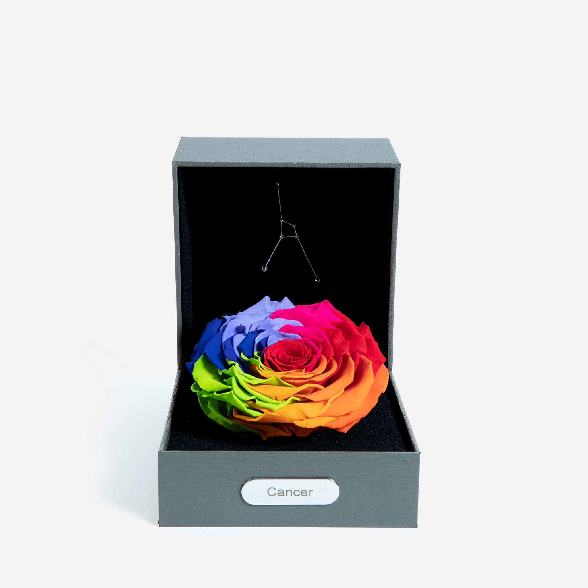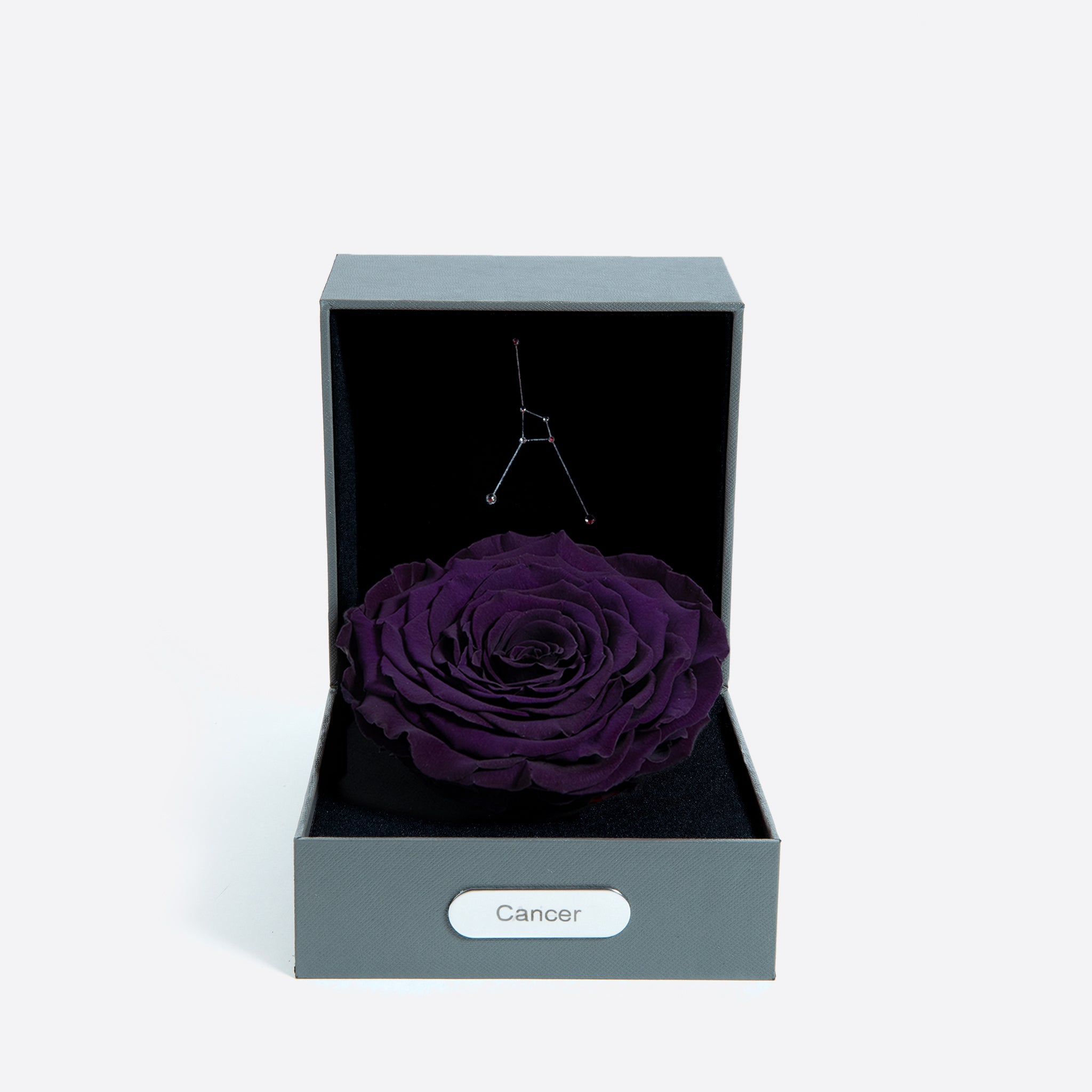 Celebrate your sweetie’s sentimental side with this stunning gift box containing a single, enormous Everlasting Rose bud. Each flower has been carefully arranged so that the petals are fully opened and on display. The arrangement is set against a black background to mimic a “night sky” with a sparkling constellation of the Cancer sign done in faux diamonds.