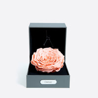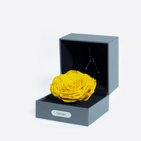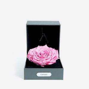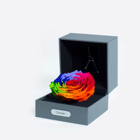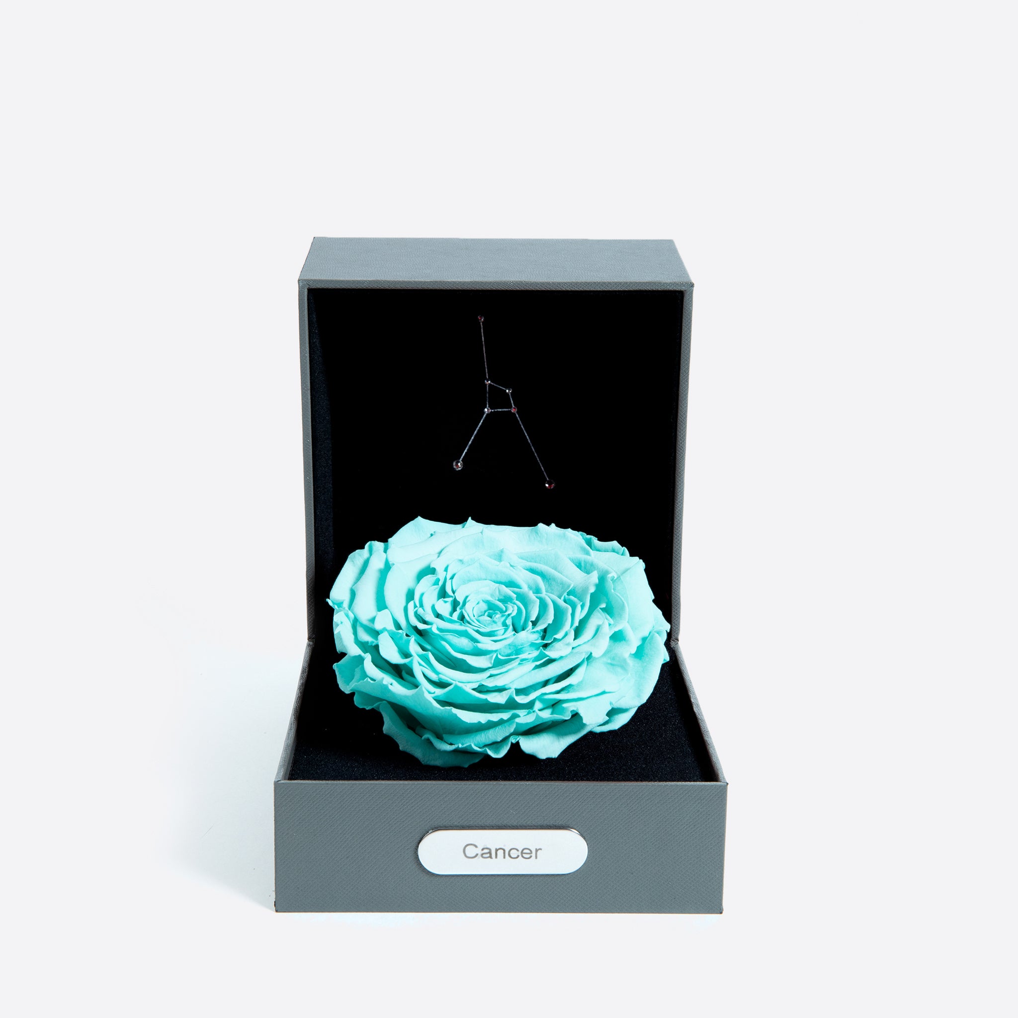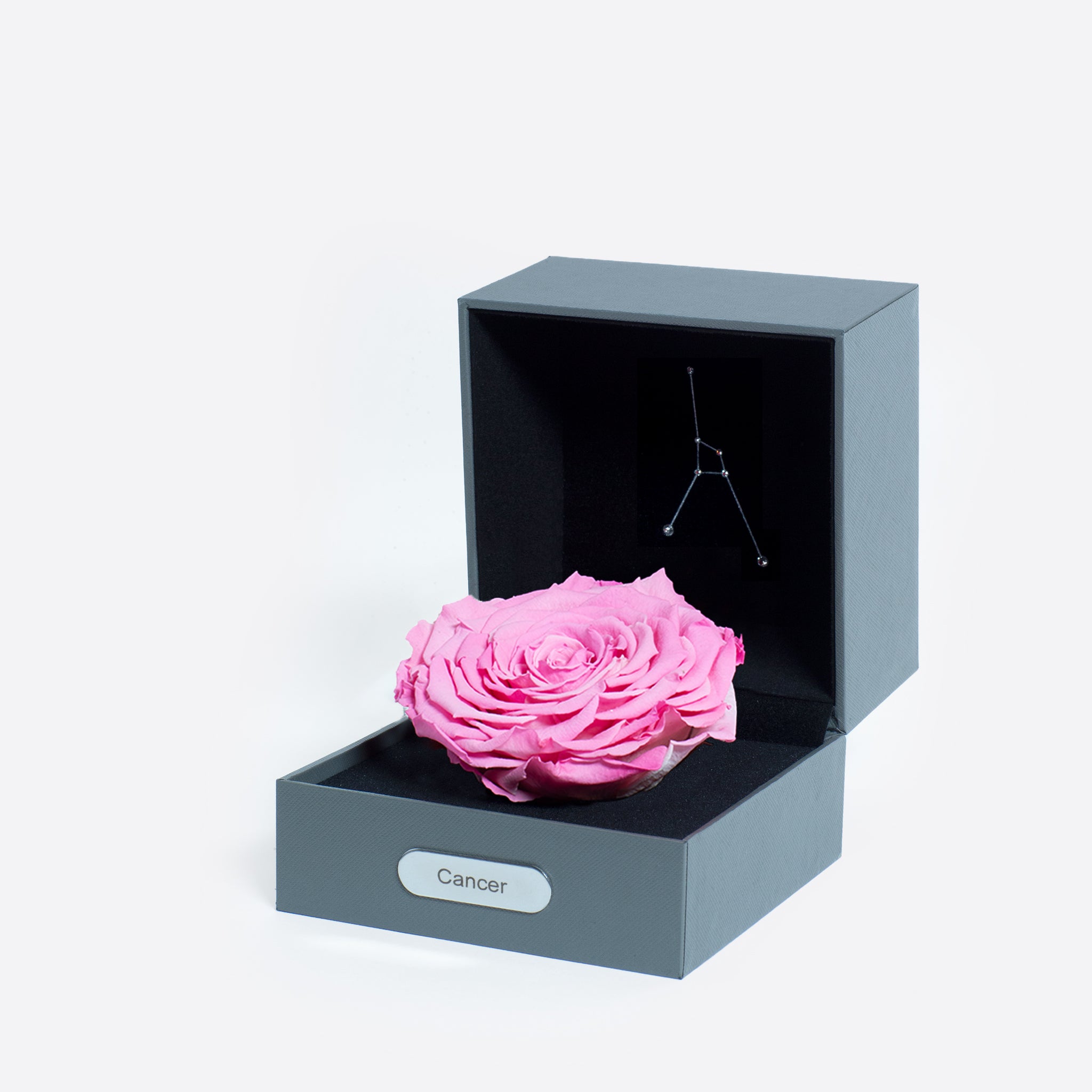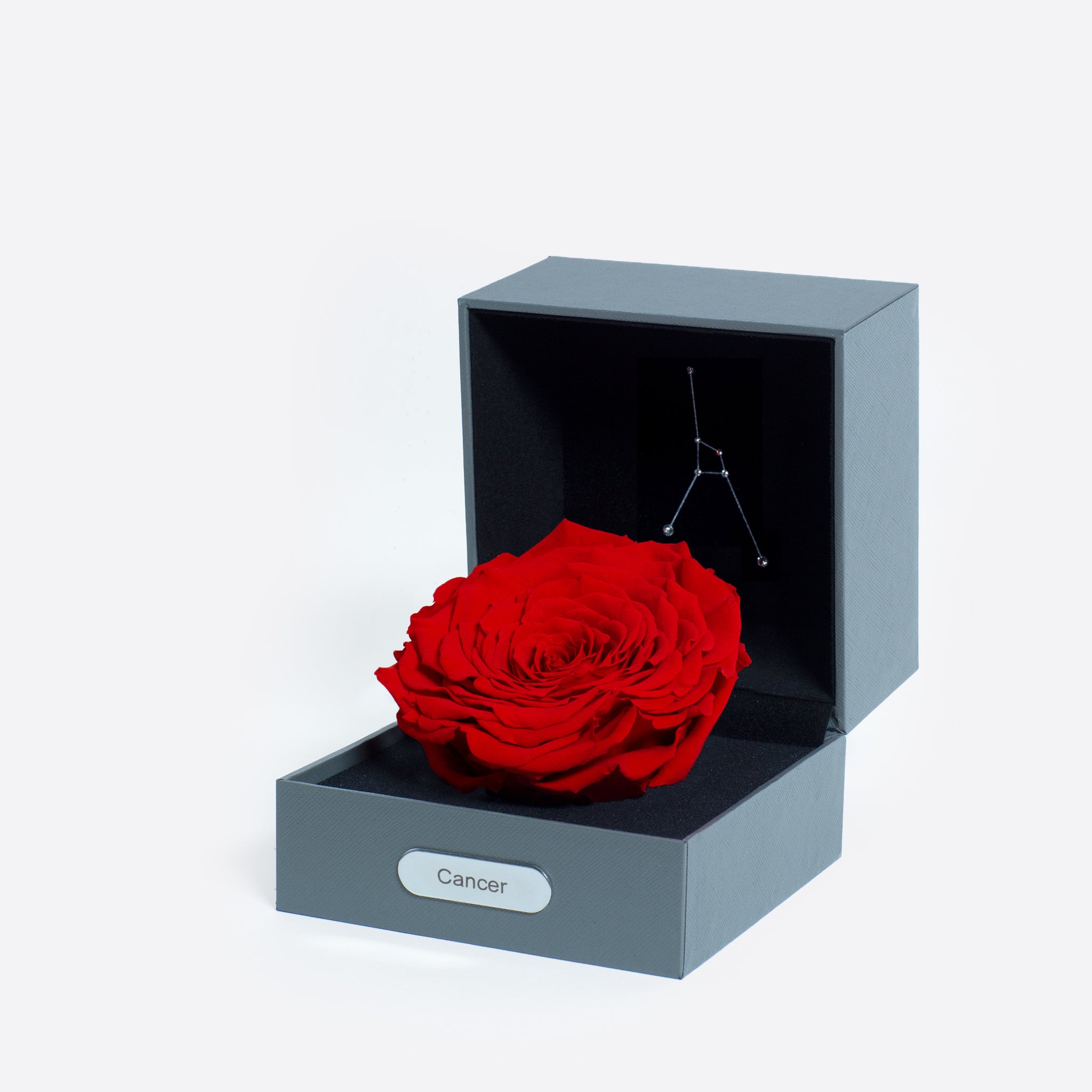 Celebrate your sweetie’s sentimental side with this stunning gift box containing a single, enormous Everlasting Rose bud. Each flower has been carefully arranged so that the petals are fully opened and on display. The arrangement is set against a black background to mimic a “night sky” with a sparkling constellation of the Cancer sign done in faux diamonds.