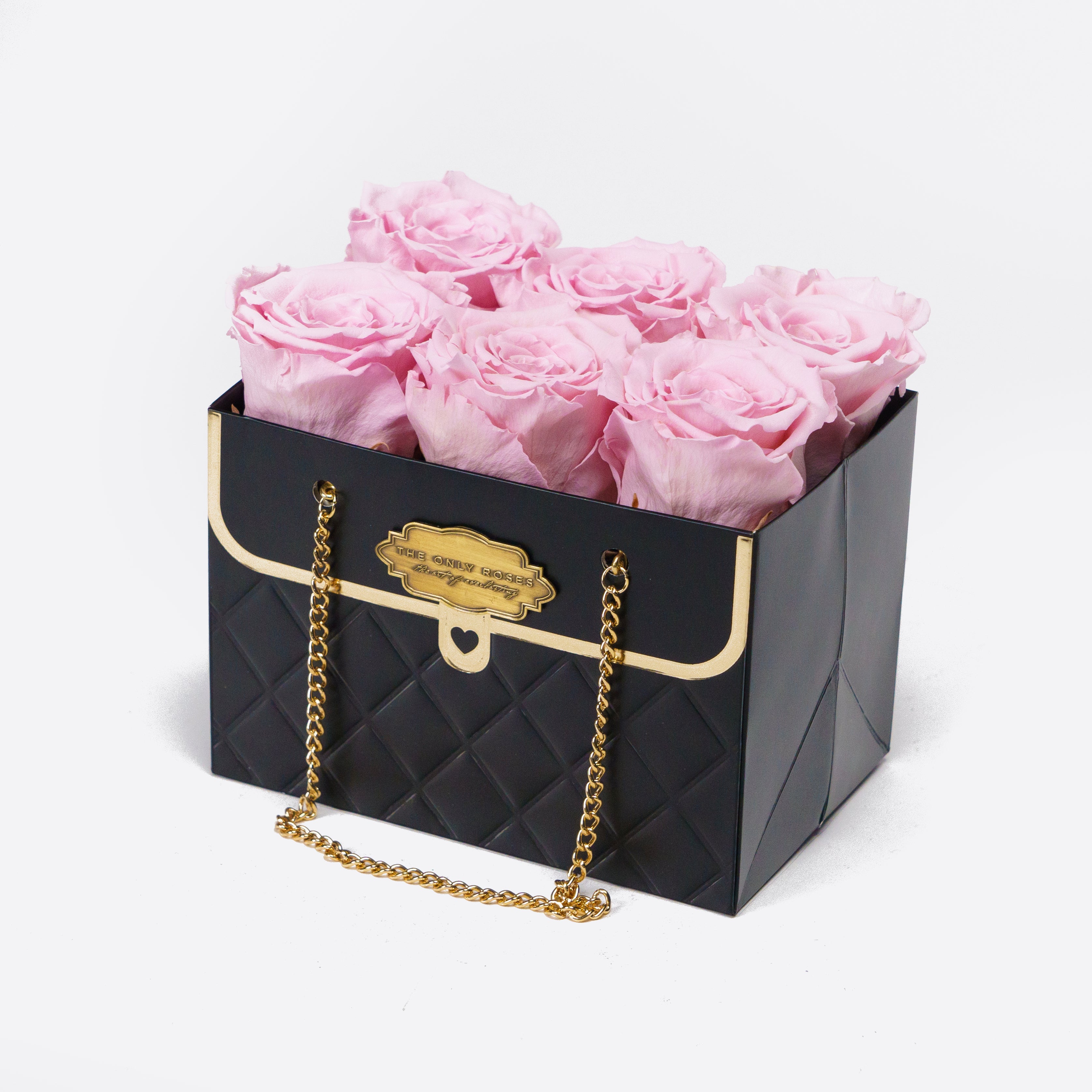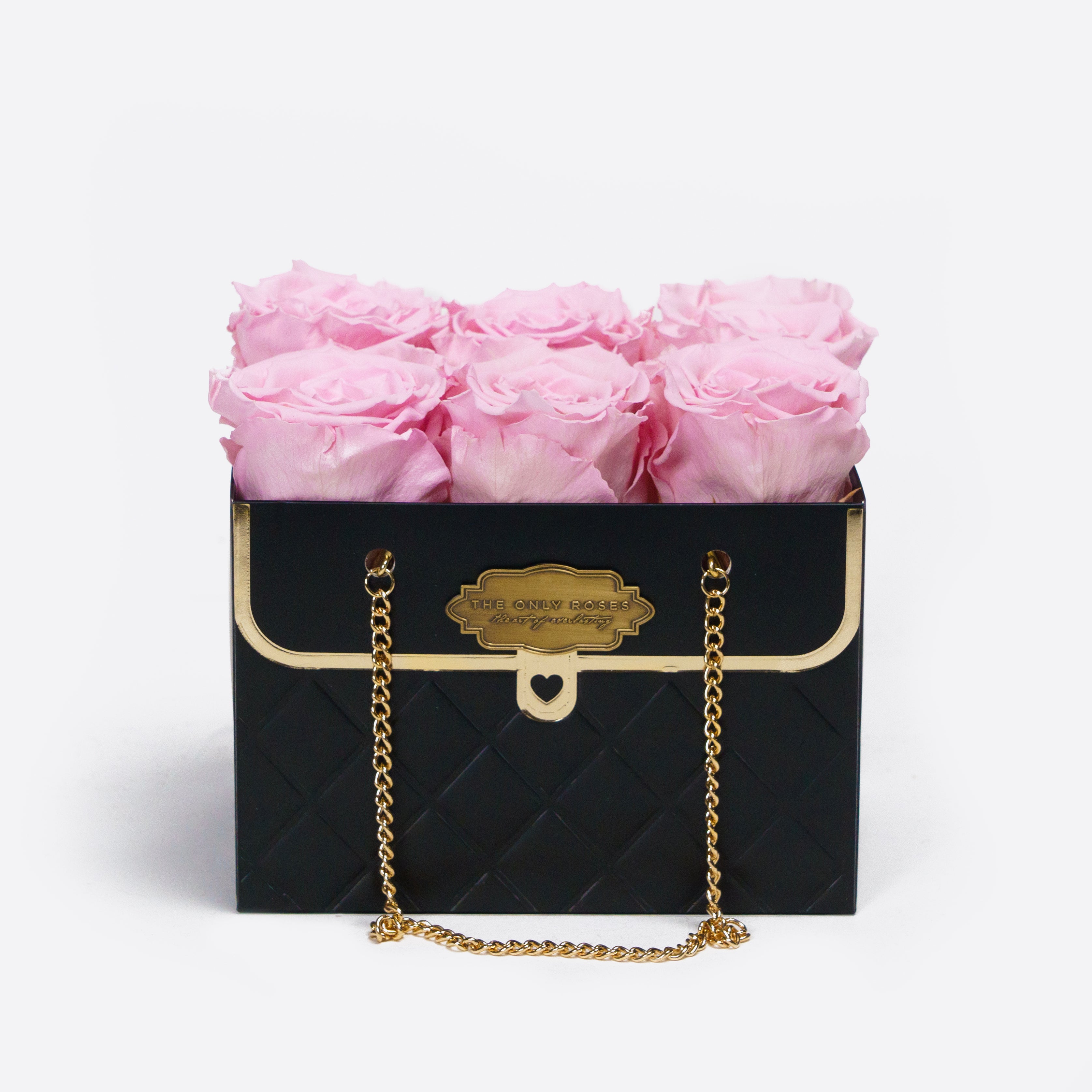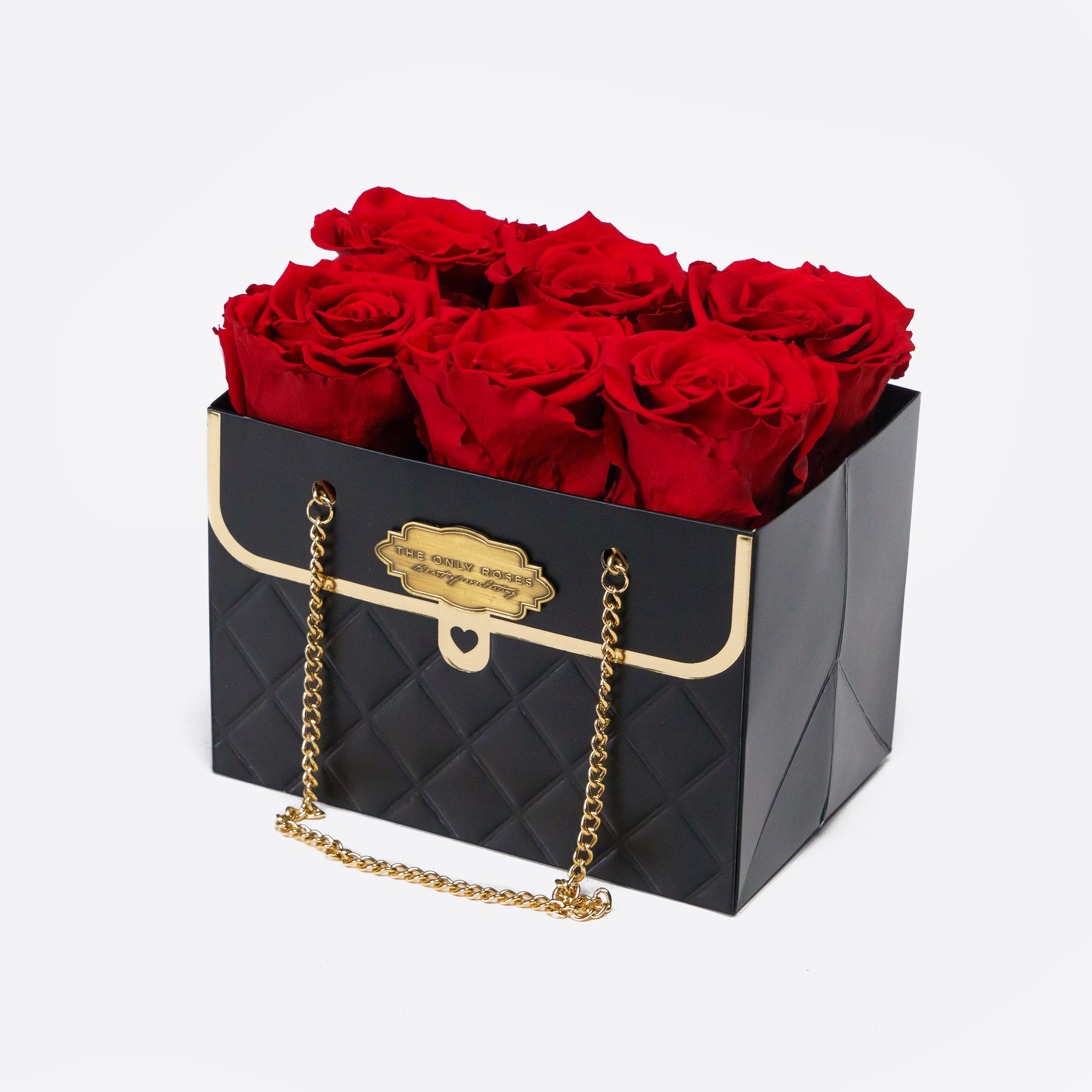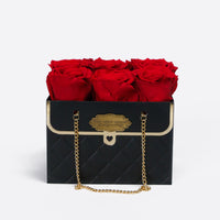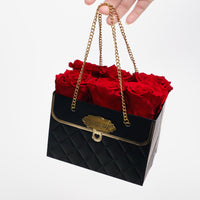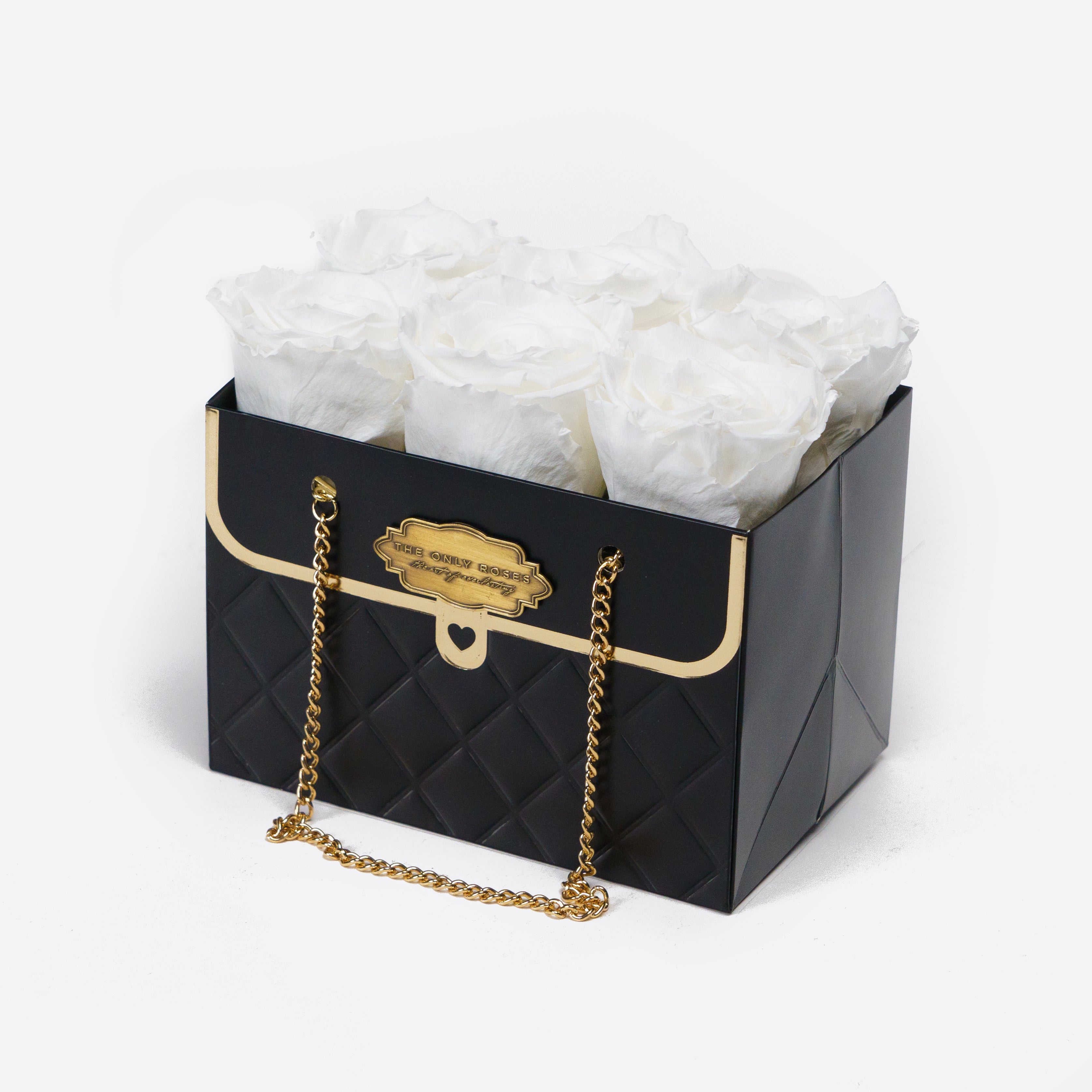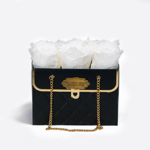 Introducing our beautiful rose purse! This unique accessory is perfect for any special occasion or for that special someone in your life. The purse, made with luxury faux leather paper, comes in either classic white or sleek black and features a luxurious gold chain handle. Inside the purse are a variety of everlasting roses from Ecuador, each lasting between 3 to 5 years. The roses come in three colors: white, red, and blush, all delicately placed inside the purse as if they were spilling out of it. This stunning piece is both chic and romantic and will make a great gift for that special someone.