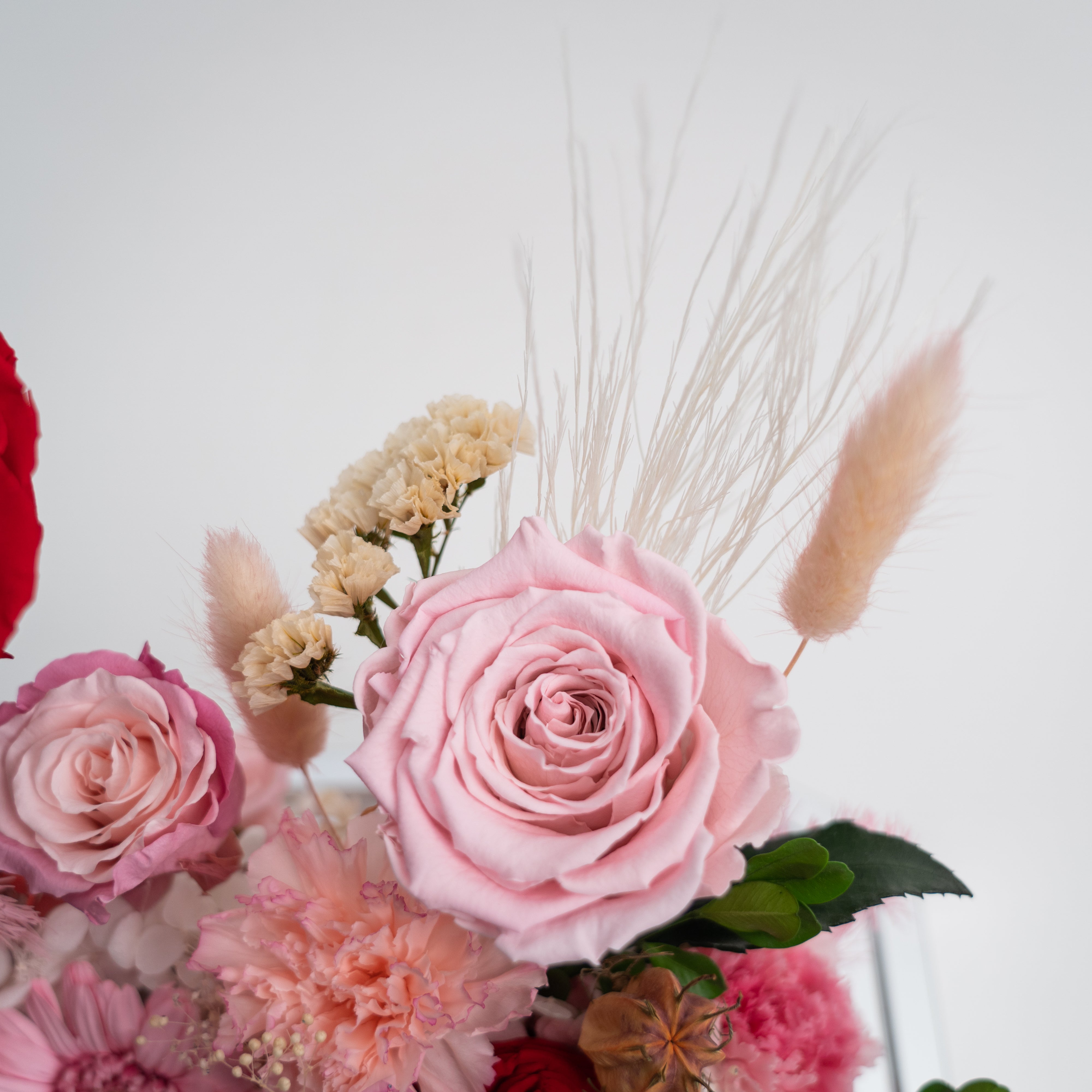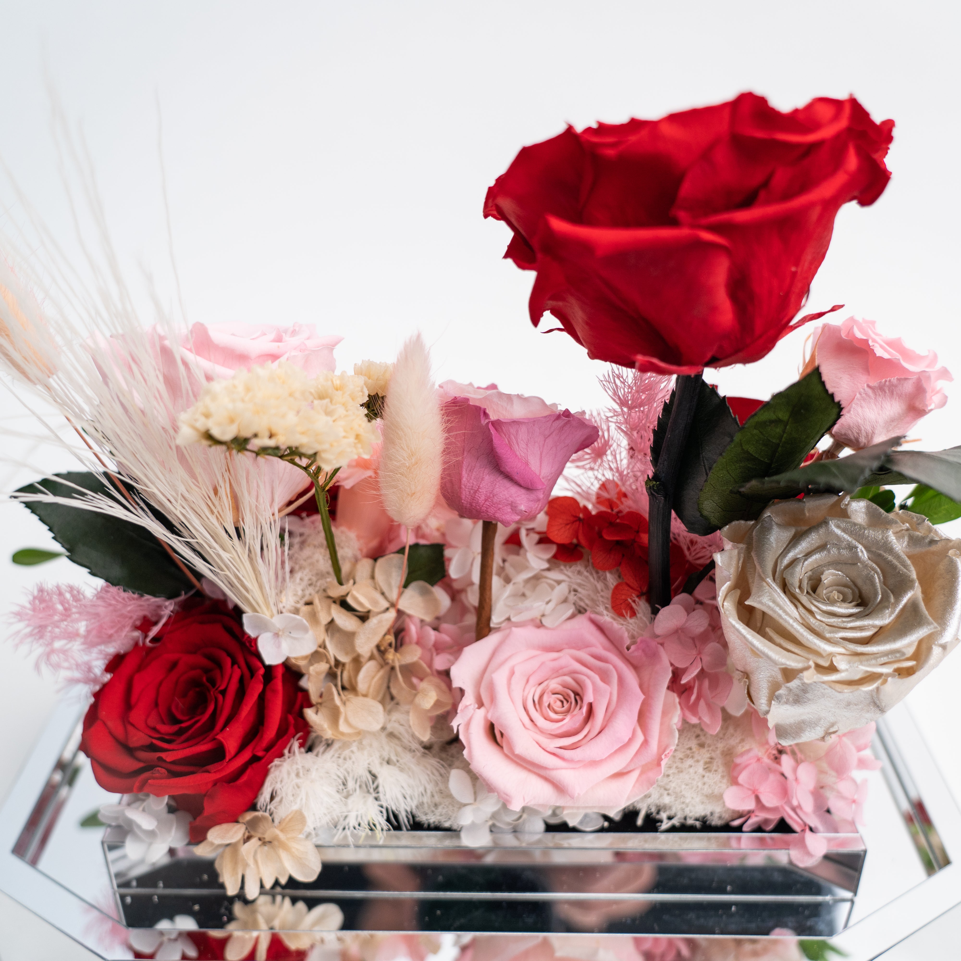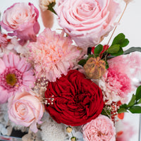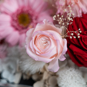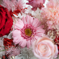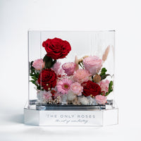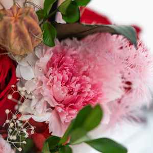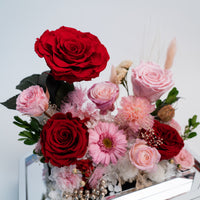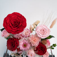 Introducing our stunning preserved floral arrangement featuring a mix of red blooms that will bring warmth and beauty to any space. Handcrafted by our skilled artisans, this arrangement is carefully designed to maintain its natural appearance and lasting beauty. With its rich red hues and delicate textures, this arrangement is perfect for adding a touch of elegance to your home or office. Whether as a thoughtful gift or a special treat for yourself, this mix floral preserved arrangement is sure to delight and impress.