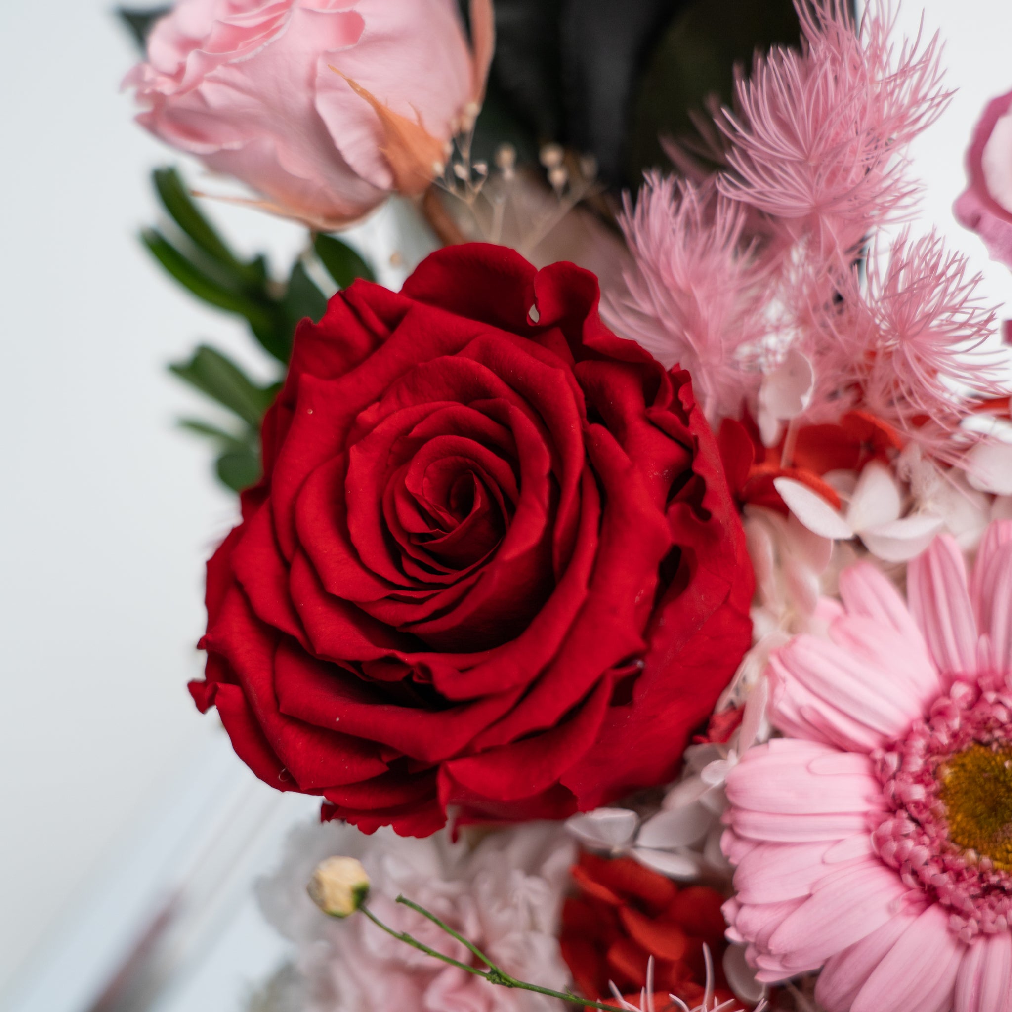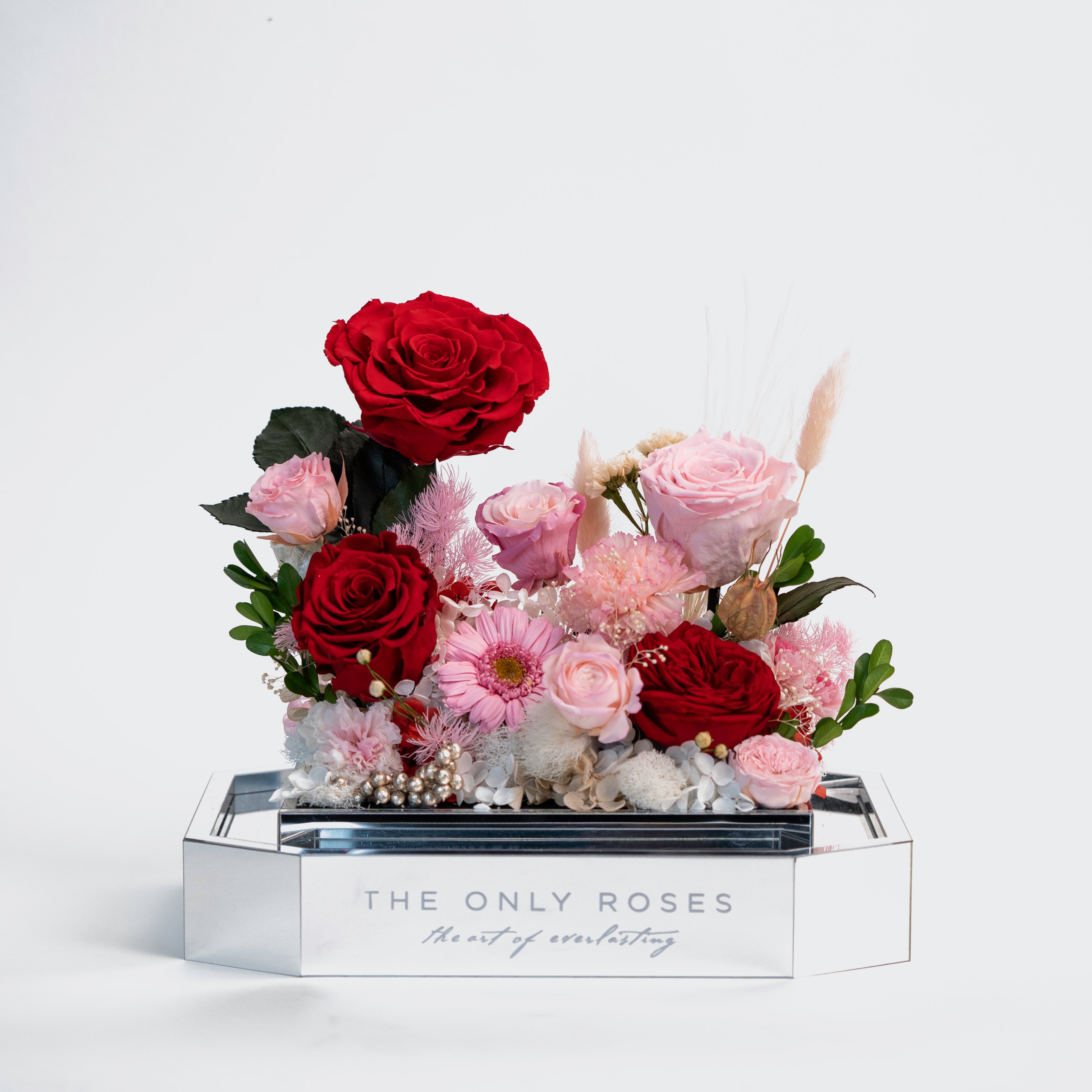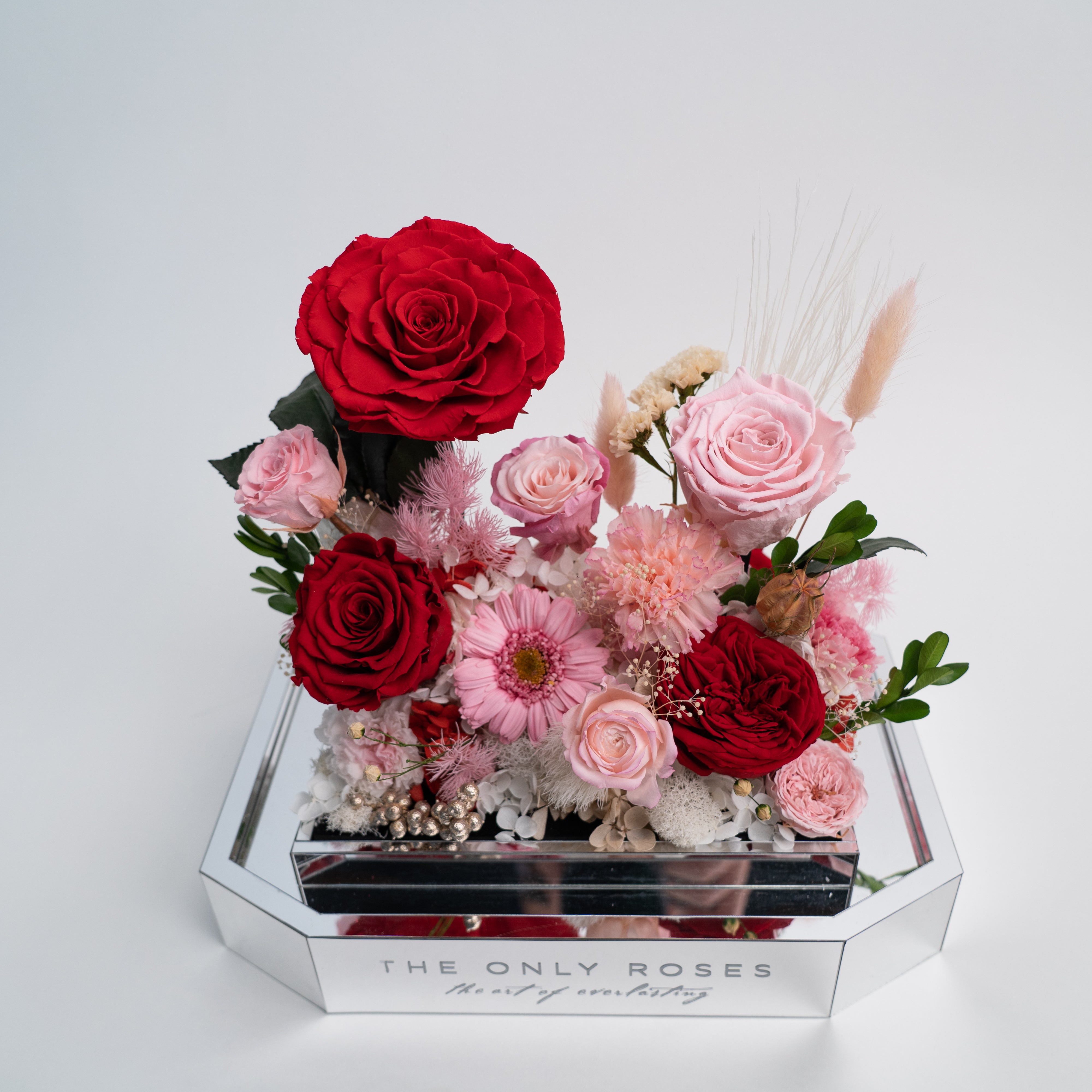 Introducing our stunning preserved floral arrangement featuring a mix of red blooms that will bring warmth and beauty to any space. Handcrafted by our skilled artisans, this arrangement is carefully designed to maintain its natural appearance and lasting beauty. With its rich red hues and delicate textures, this arrangement is perfect for adding a touch of elegance to your home or office. Whether as a thoughtful gift or a special treat for yourself, this mix floral preserved arrangement is sure to delight and impress.