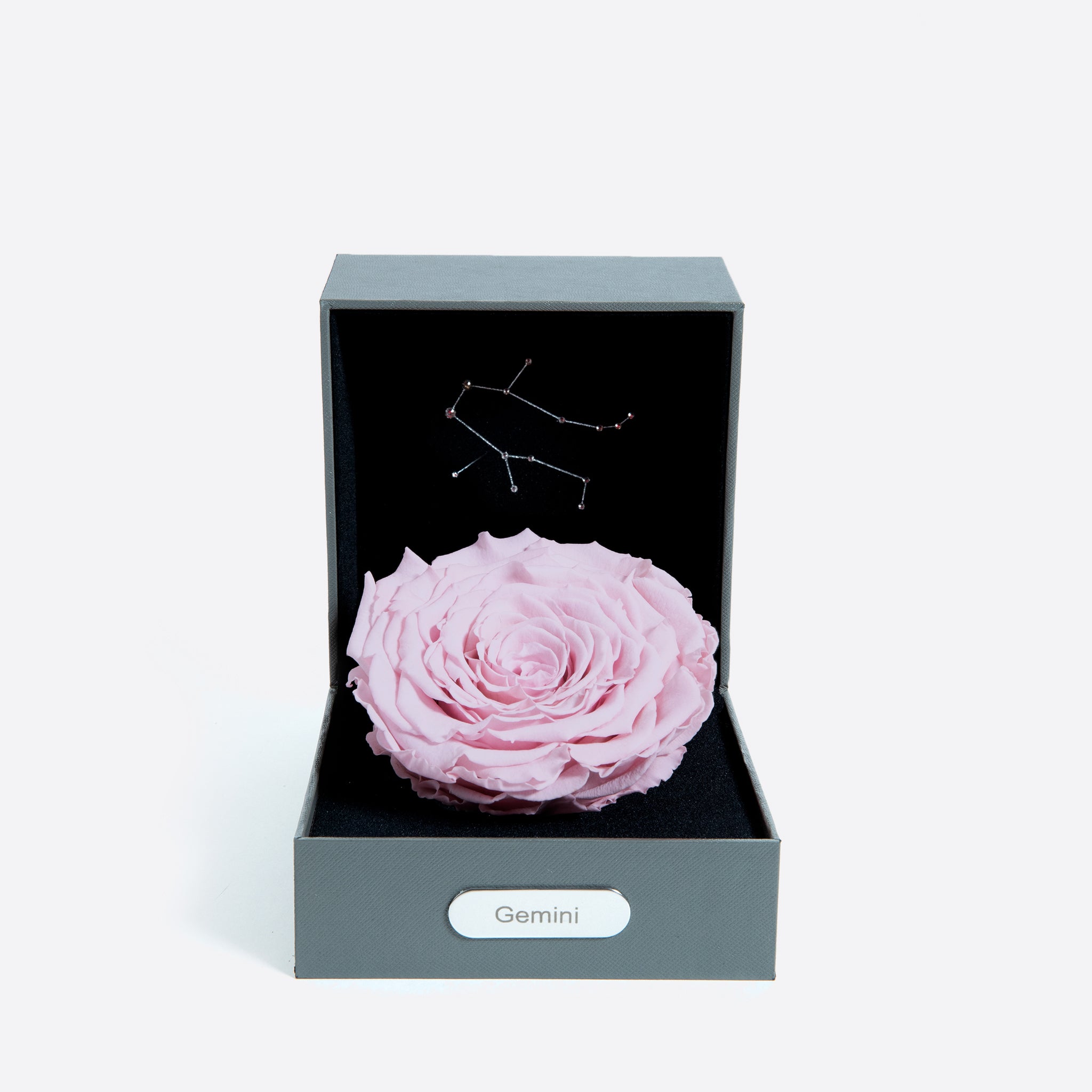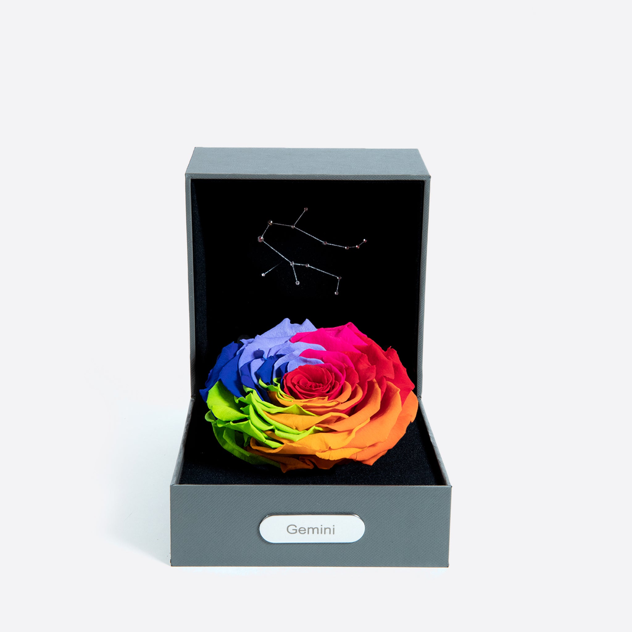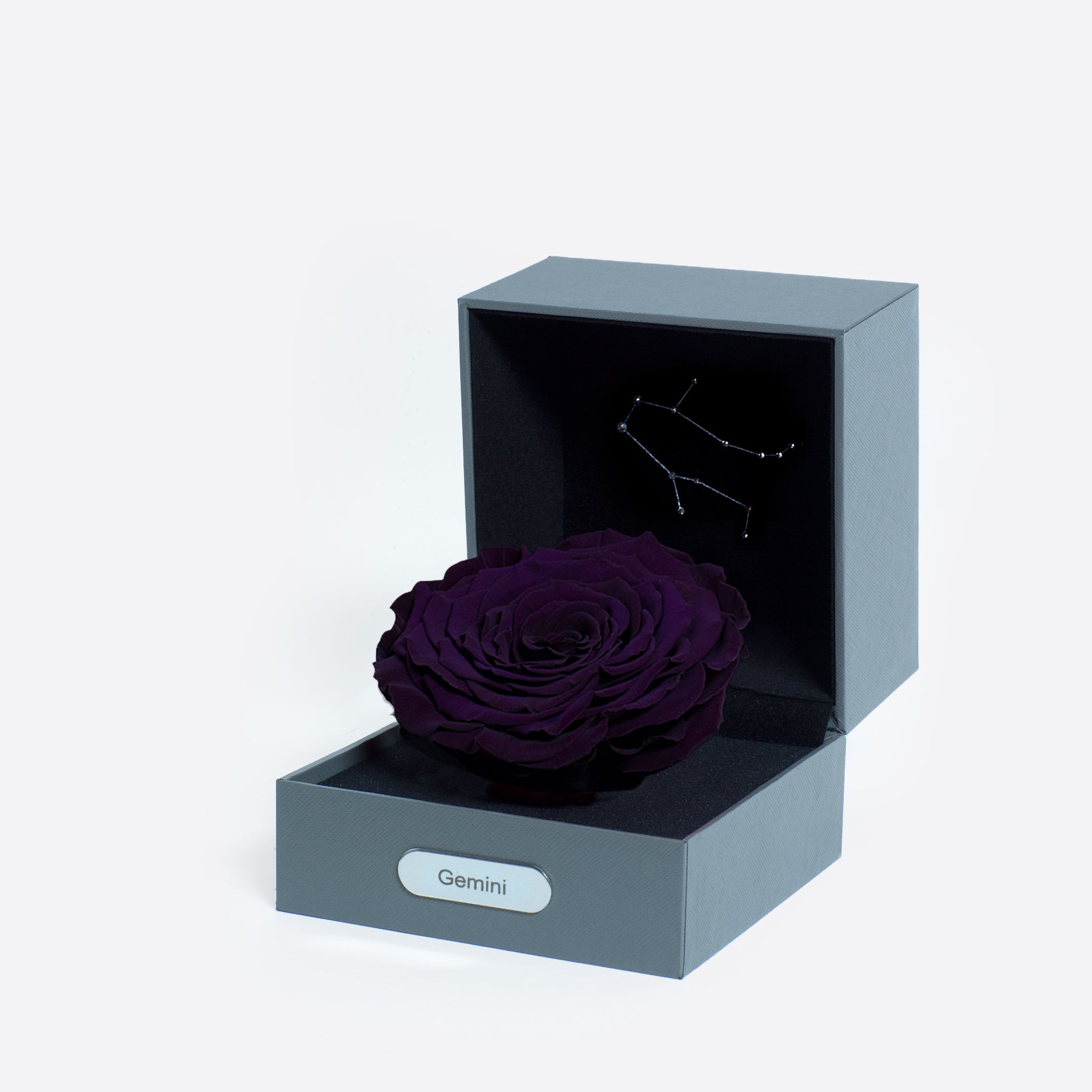 Celebrate your sweetie’s passion with this stunning gift box containing a single, enormous Everlasting Rose bud. Each flower has been carefully arranged so that the petals are fully opened and on display. The arrangement is set against a black background to mimic a “night sky” with a sparkling constellation of the Gemini sign done in faux diamonds.