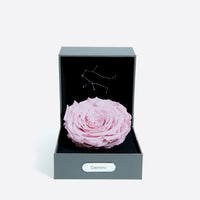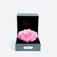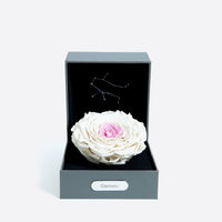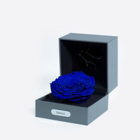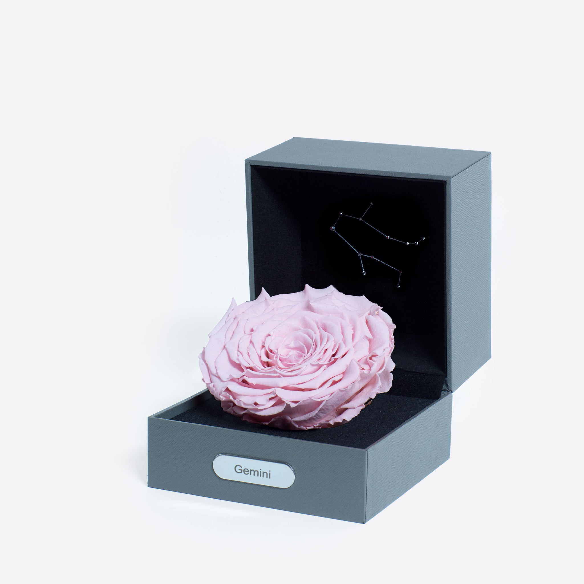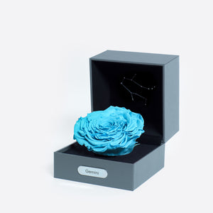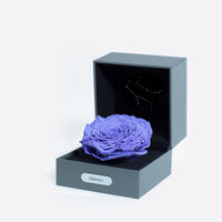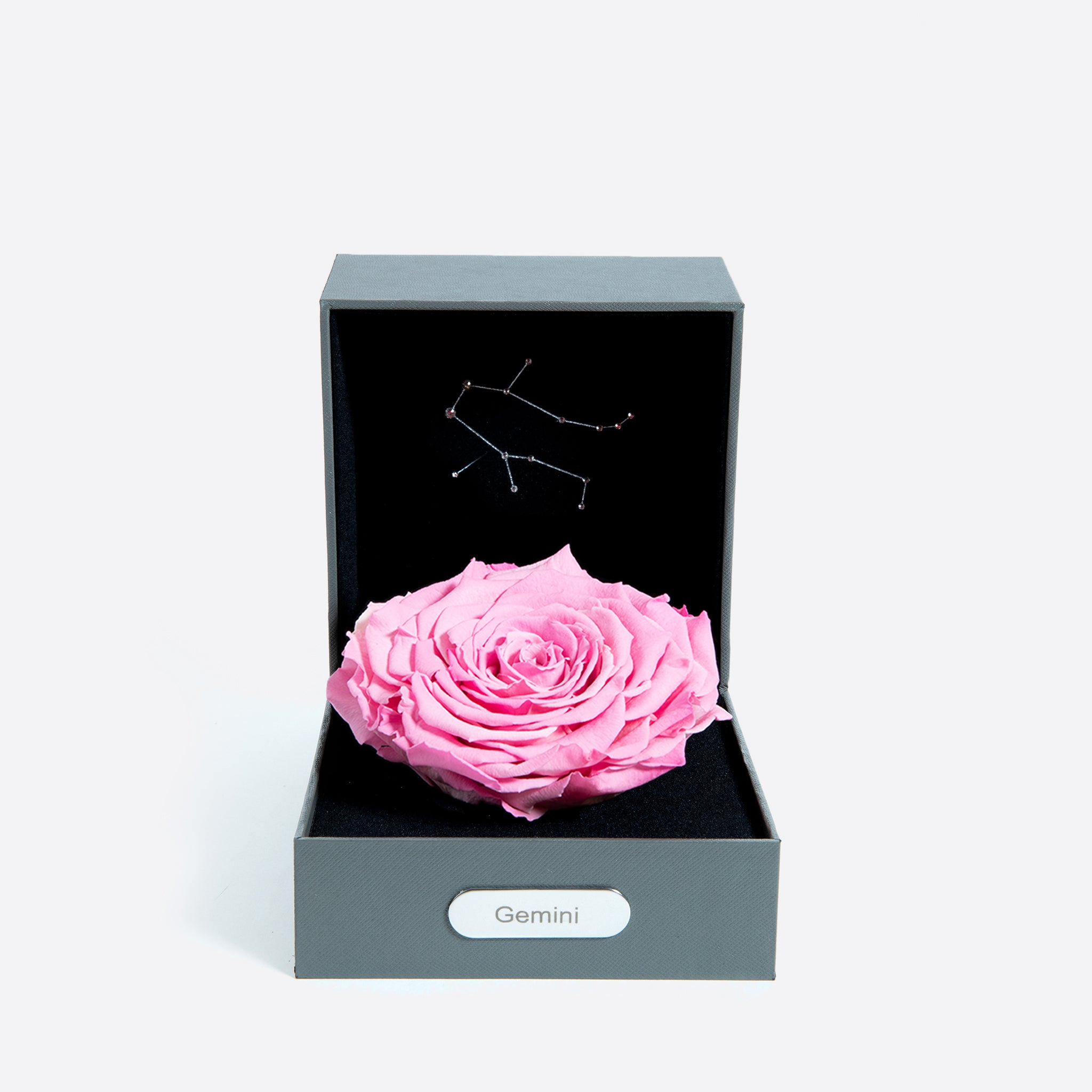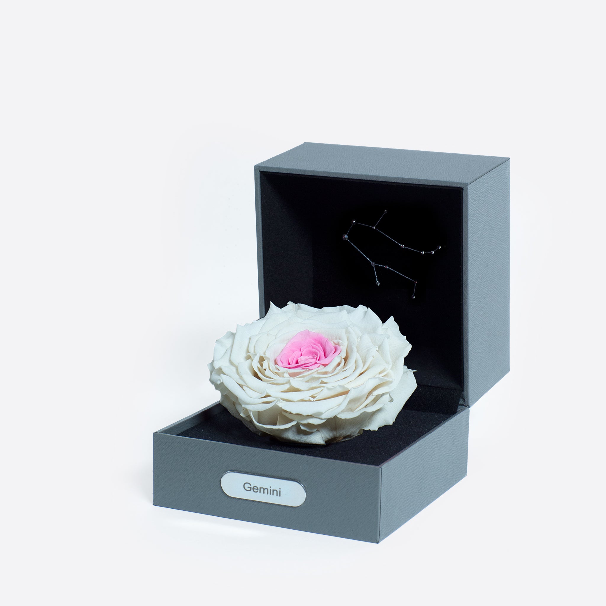 Celebrate your sweetie’s passion with this stunning gift box containing a single, enormous Everlasting Rose bud. Each flower has been carefully arranged so that the petals are fully opened and on display. The arrangement is set against a black background to mimic a “night sky” with a sparkling constellation of the Gemini sign done in faux diamonds.