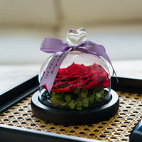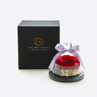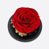 Inside this exquisite dome sits a single, enormous preserved rose bud. The embossed glass top, featuring an adorable heart-shaped handle, comes with a cute little bow and rests on a beautiful wood base. We purposely wait for the rose bud to mature so that the petals are fully opened and then we preserve them when they are at their biggest and brightest. Of course, like all of our roses, this one is guaranteed to keep its fresh-picked appearance for at least a year, if not longer.