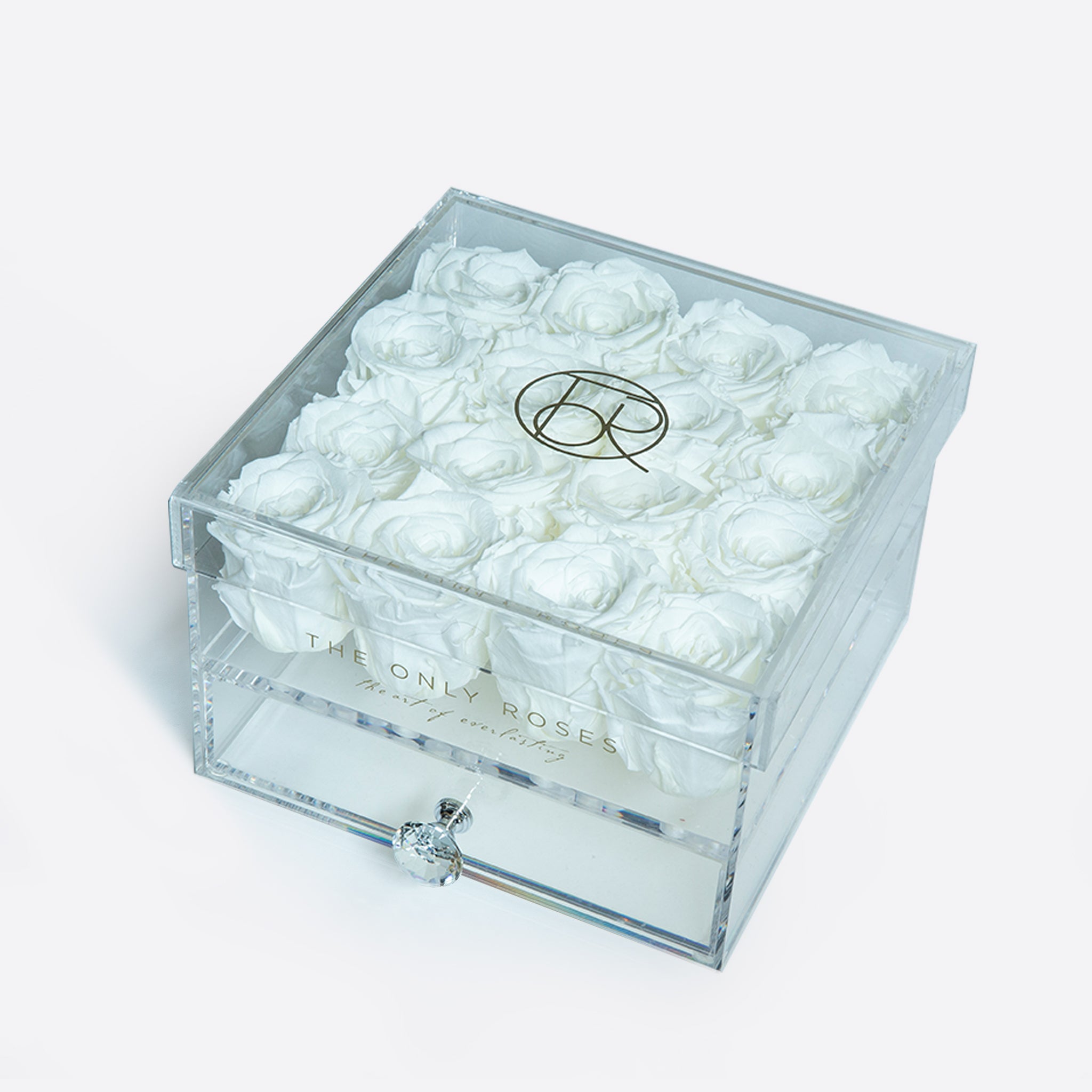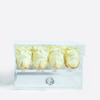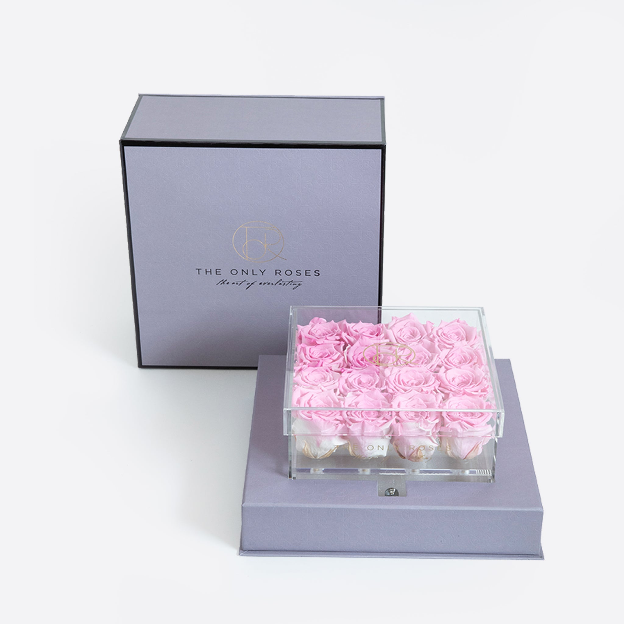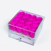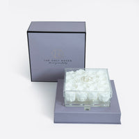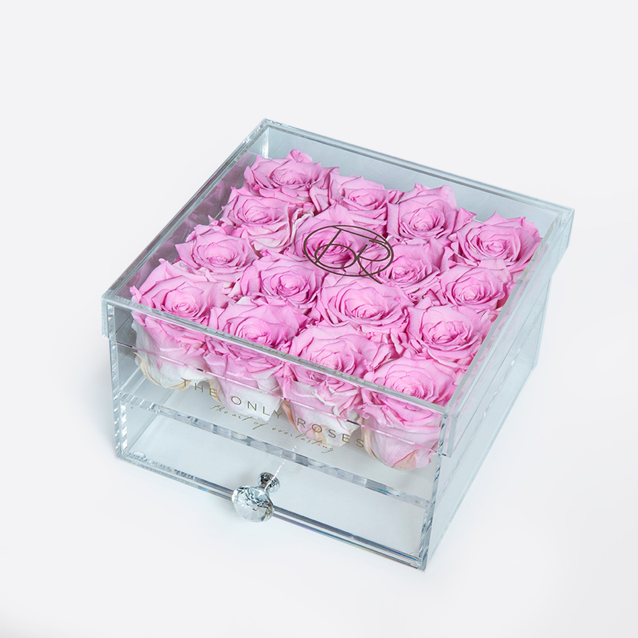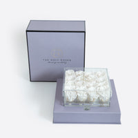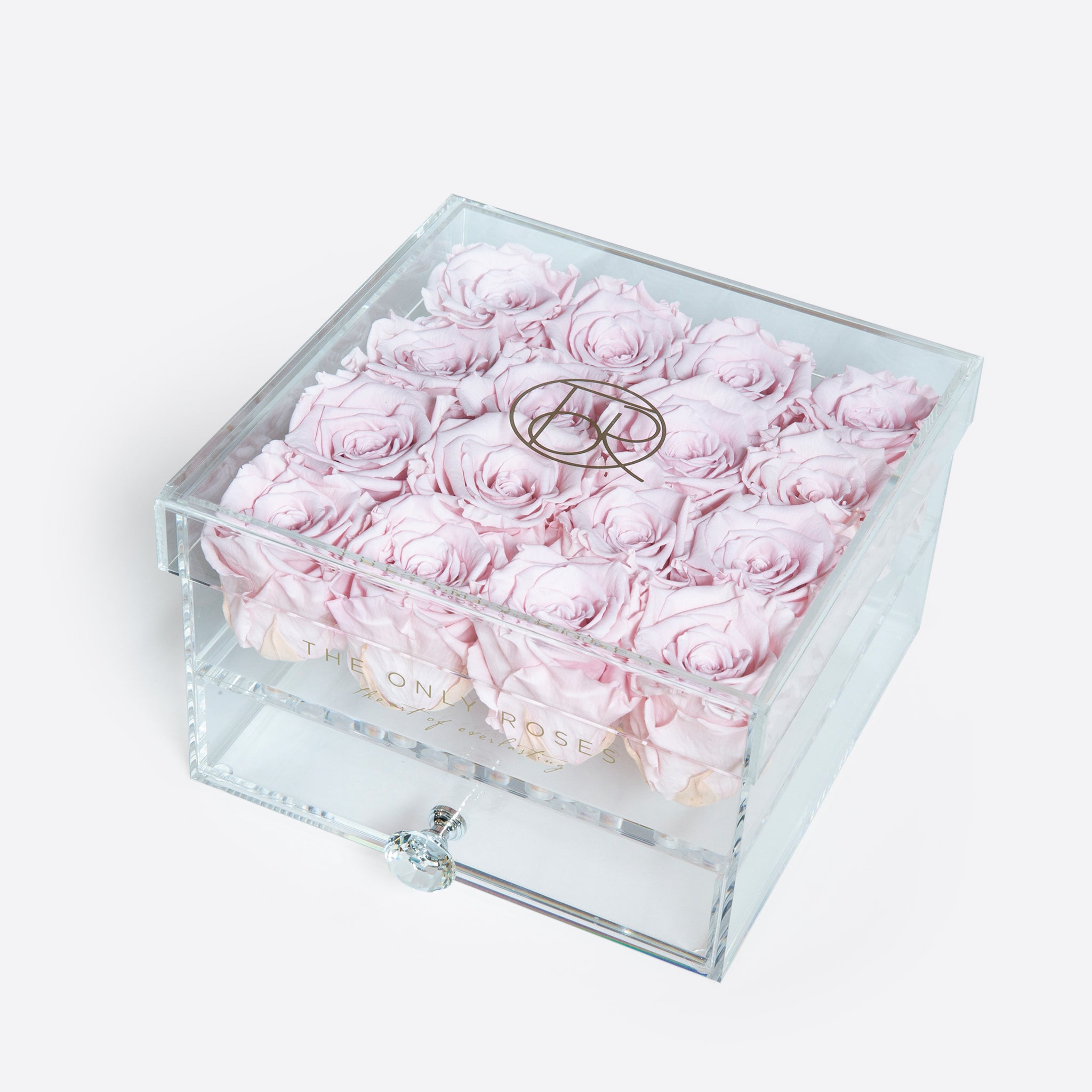 Our Medium Square Rose Acrylic Box shows off our preserved Everlasting Roses in the most dramatic fashion — suspended in a see-through box that allows for a 360-degree view of each perfectly picked flower. With the rose buds so clearly and beautifully presented, you’ll never need to open the box, therefore preserving them for as long as possible. We like to think of these as sleeping beauties, encased in their own little castle.
