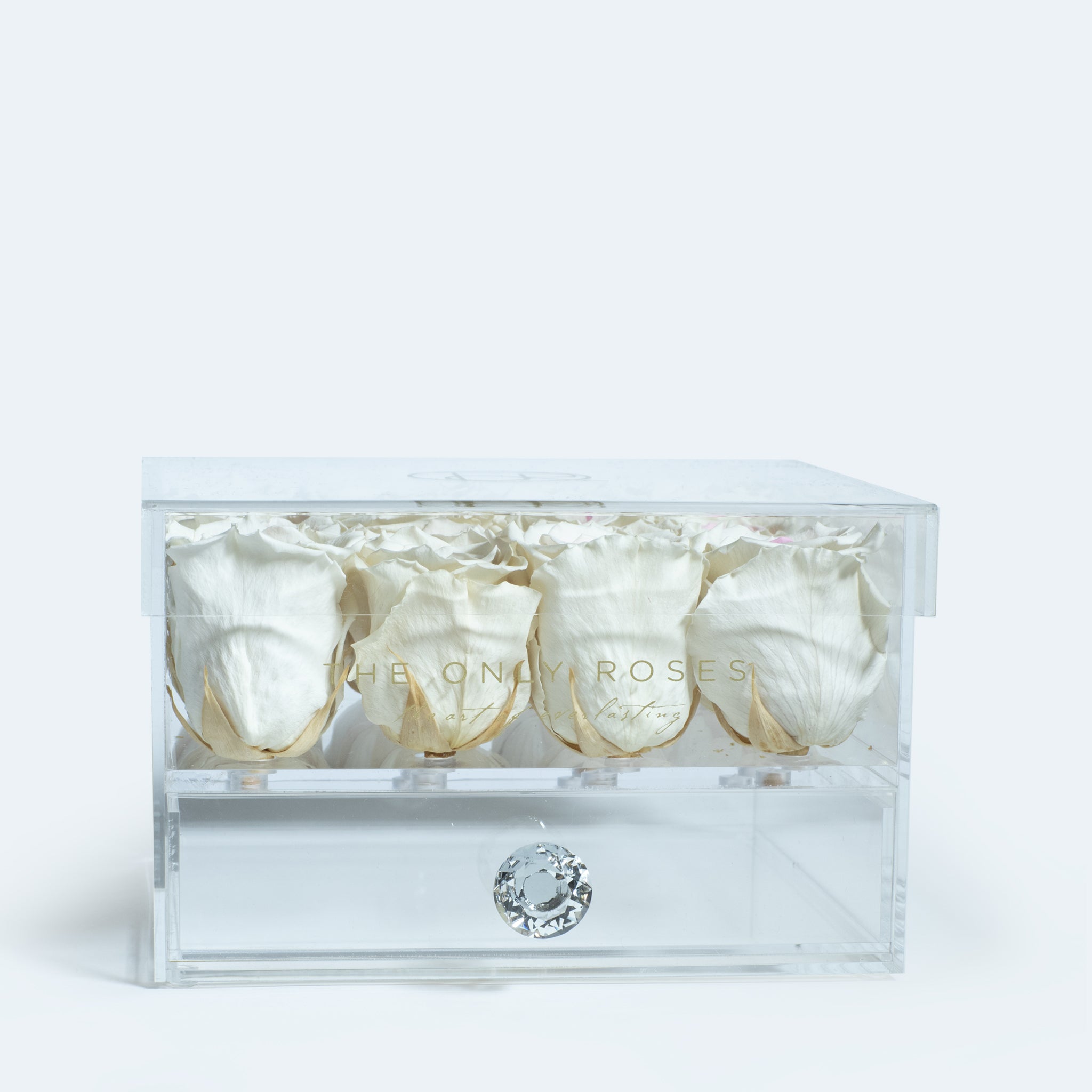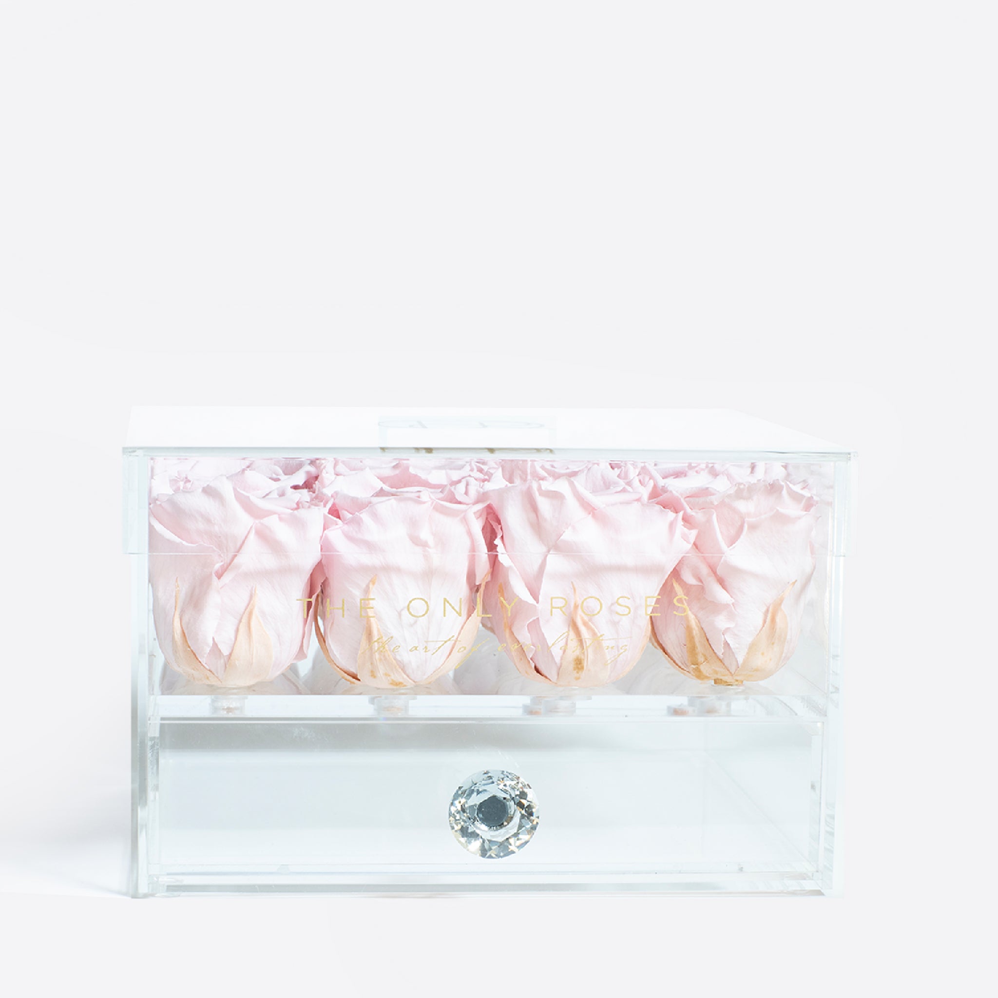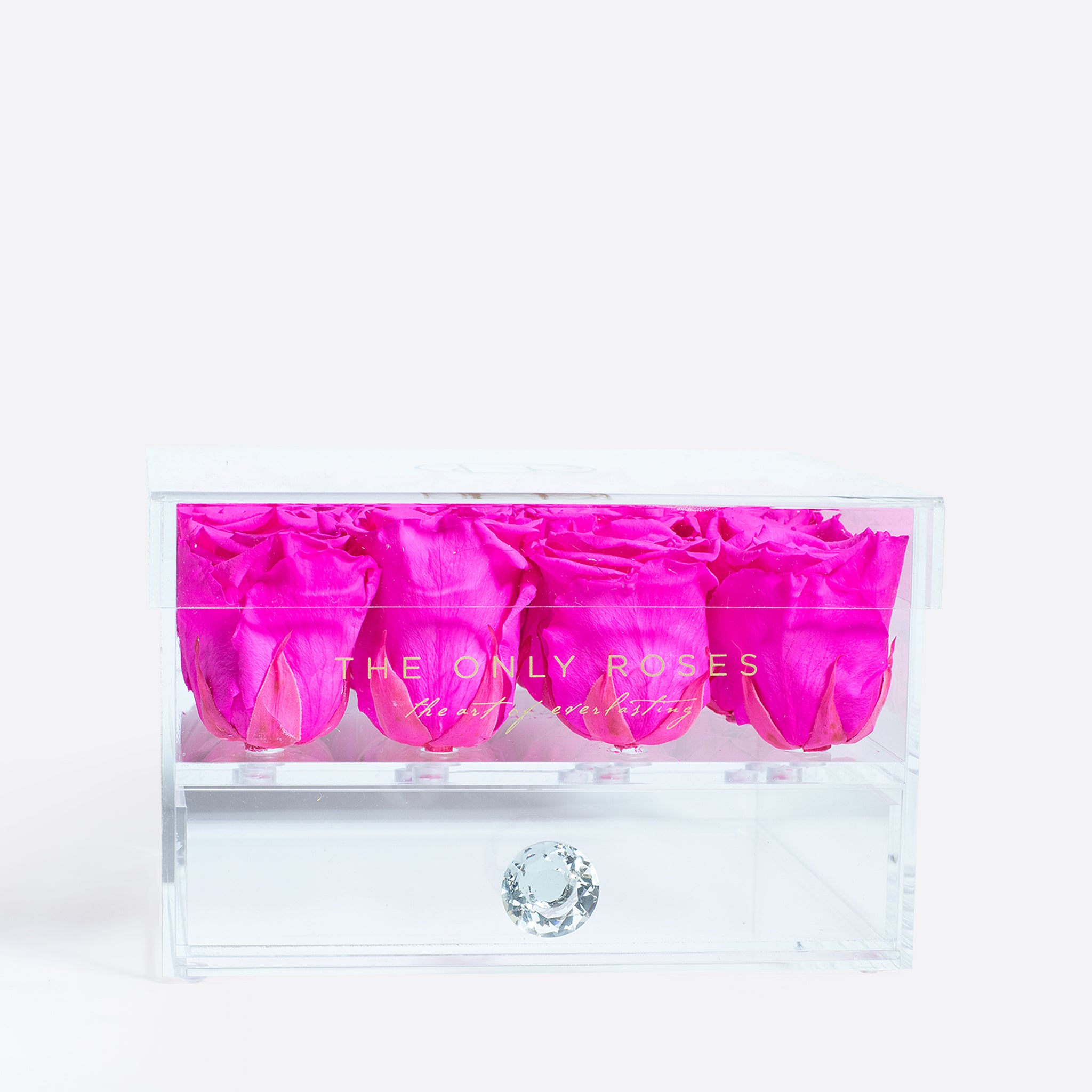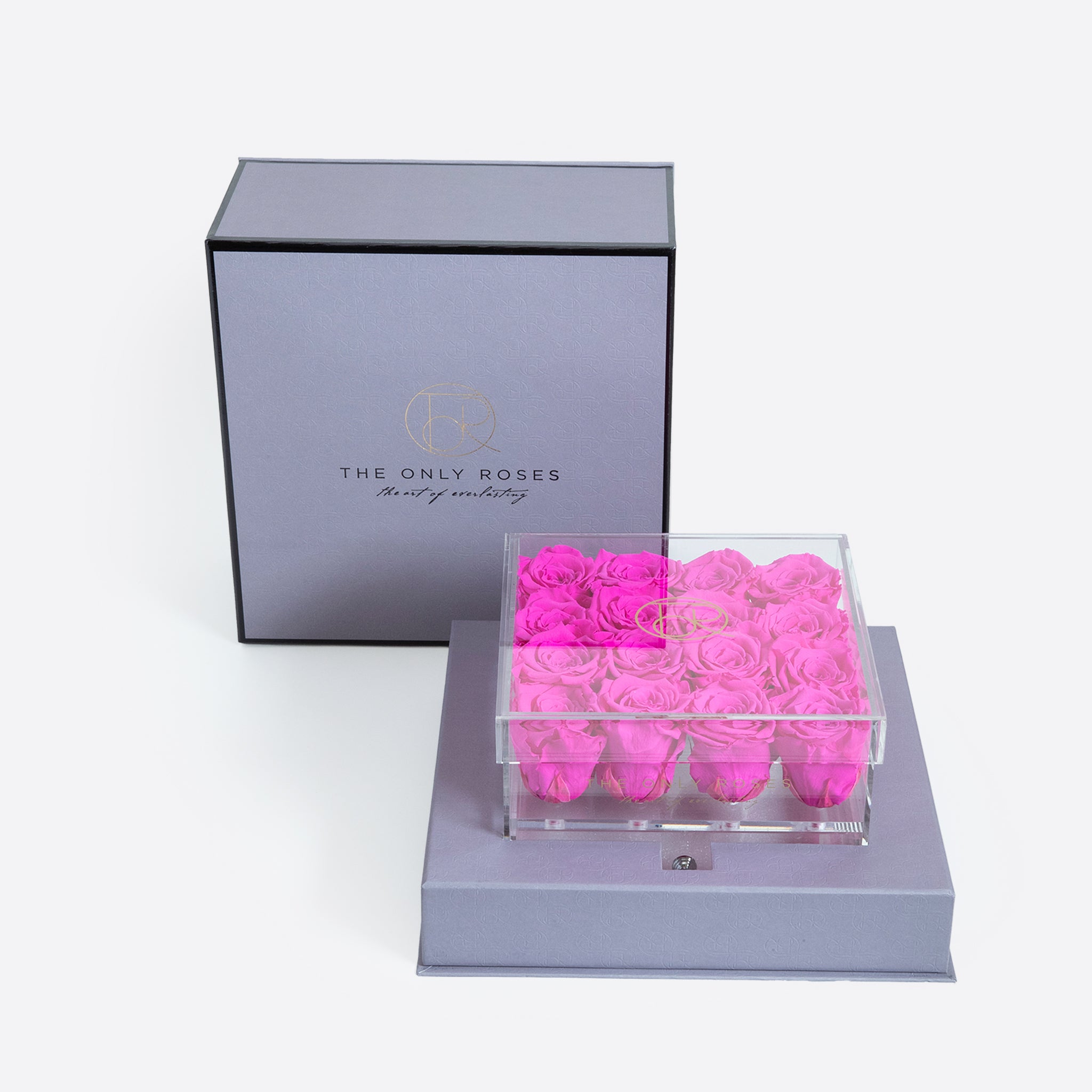 Our Medium Square Rose Acrylic Box shows off our preserved Everlasting Roses in the most dramatic fashion — suspended in a see-through box that allows for a 360-degree view of each perfectly picked flower. With the rose buds so clearly and beautifully presented, you’ll never need to open the box, therefore preserving them for as long as possible. We like to think of these as sleeping beauties, encased in their own little castle.