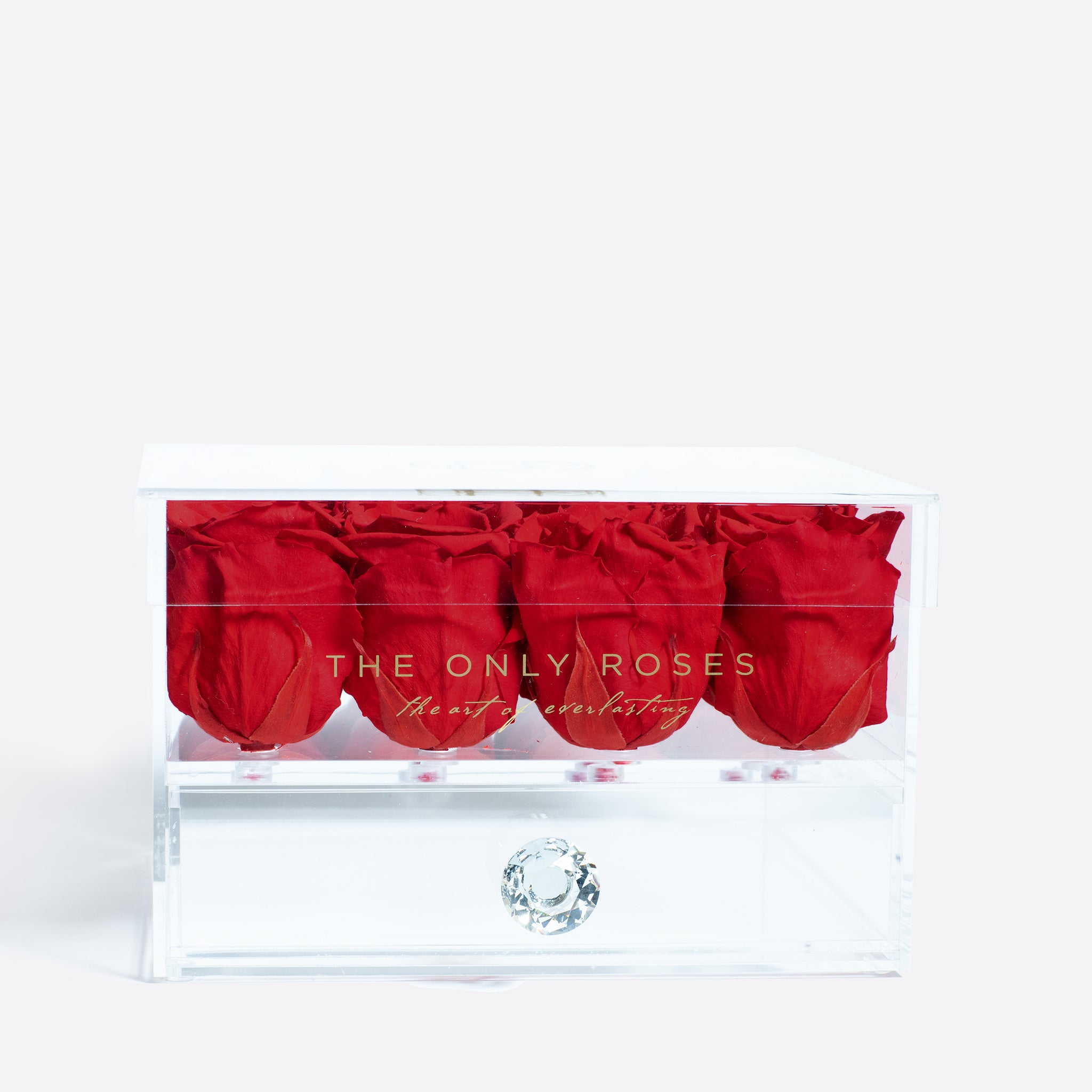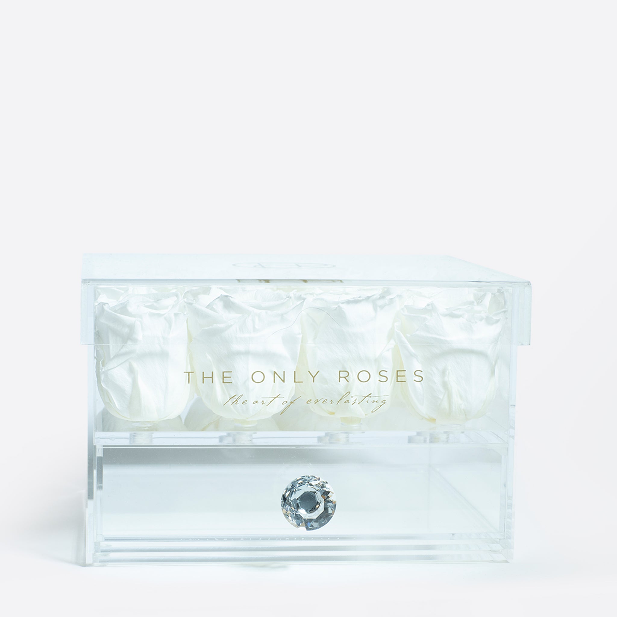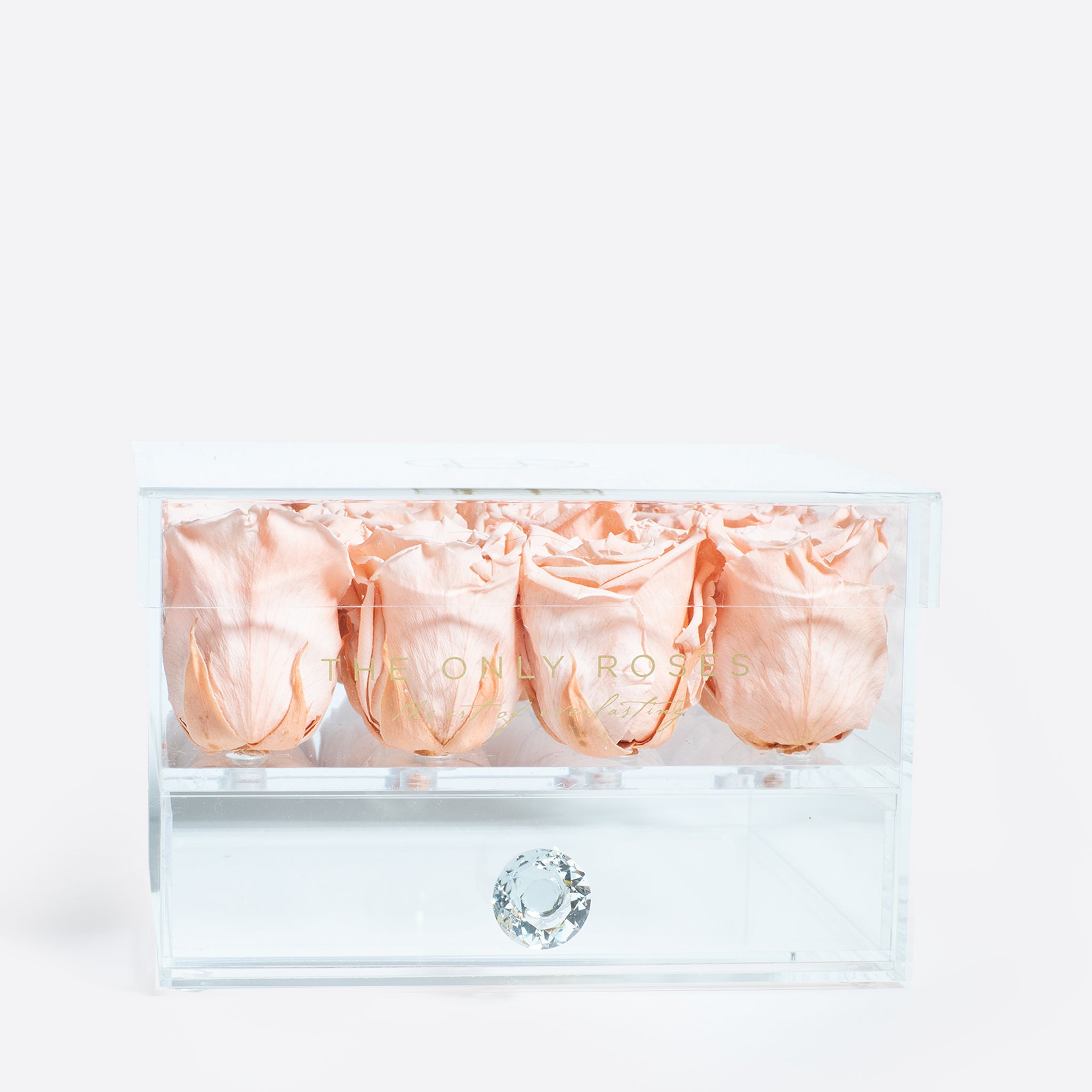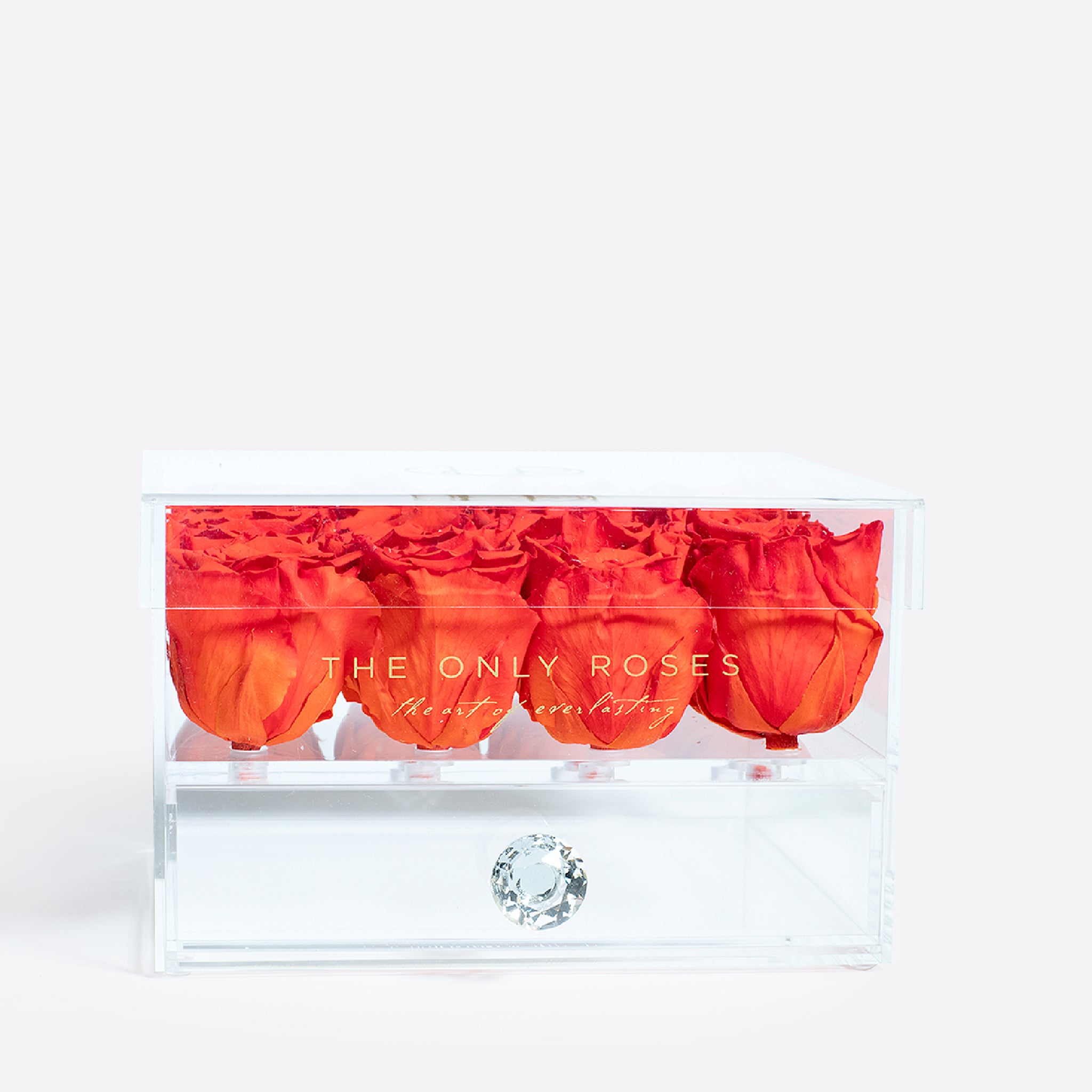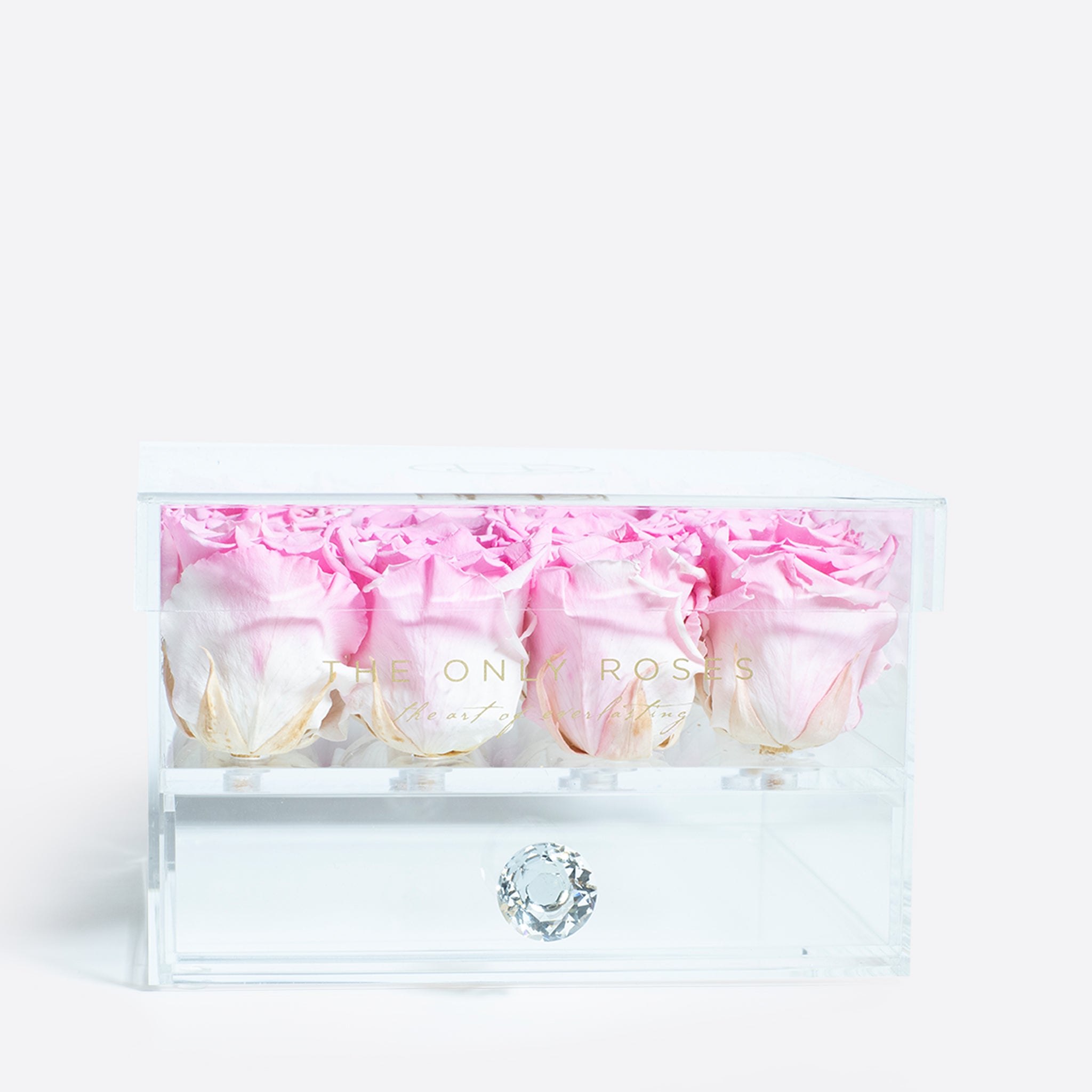 Our Medium Square Rose Acrylic Box shows off our preserved Everlasting Roses in the most dramatic fashion — suspended in a see-through box that allows for a 360-degree view of each perfectly picked flower. With the rose buds so clearly and beautifully presented, you’ll never need to open the box, therefore preserving them for as long as possible. We like to think of these as sleeping beauties, encased in their own little castle.