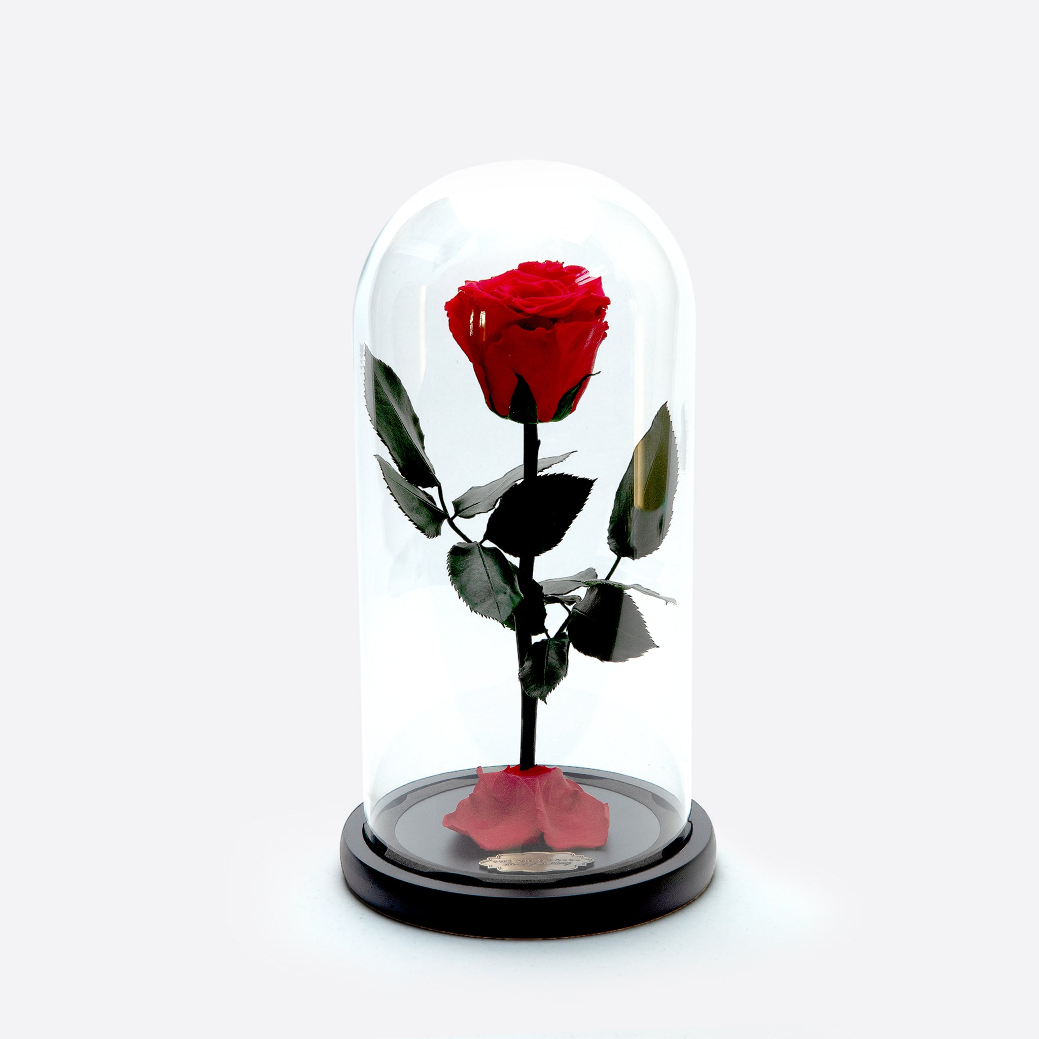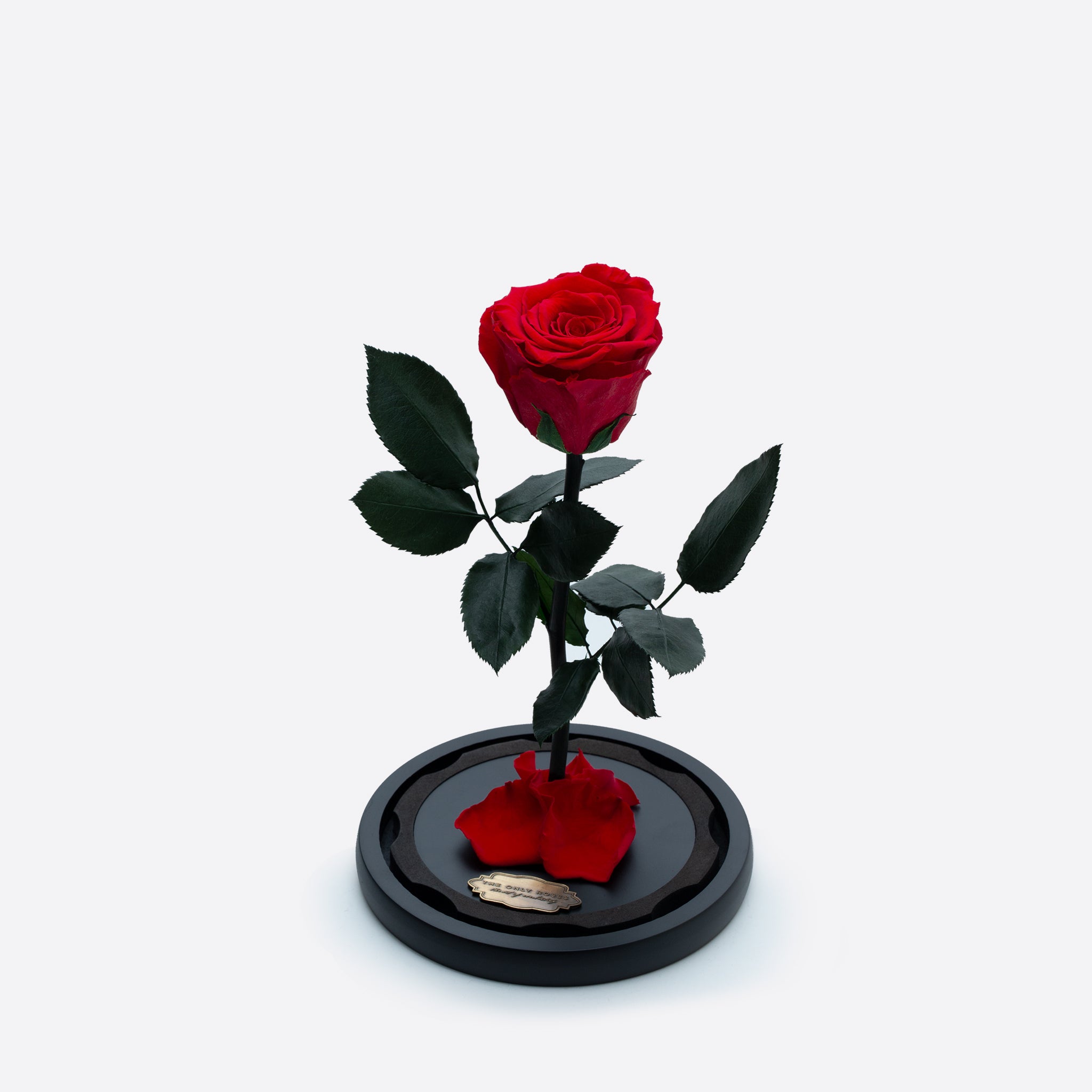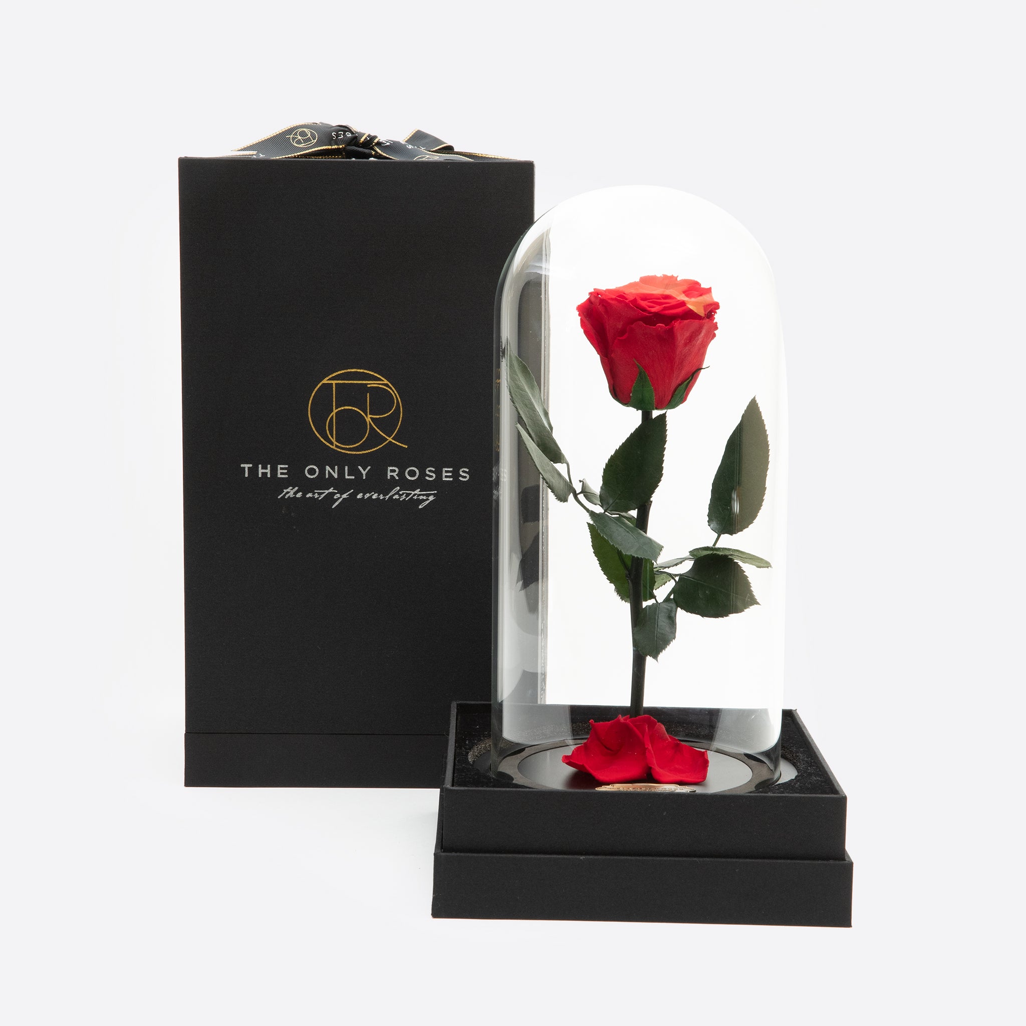The classic love story comes to life inside this exquisite glass dome, which contains a single preserved rose rosebud and several loose rose petals. We preserve these rosebuds when they are at their biggest and brightest — and they’ll stay this way for a year or longer! The entire package arrives in a sophisticated grey box, elegantly tied together with ribbon and bow. This storybook gift will surely make your sweetie feel like the “beauty” in their own fairy tale.