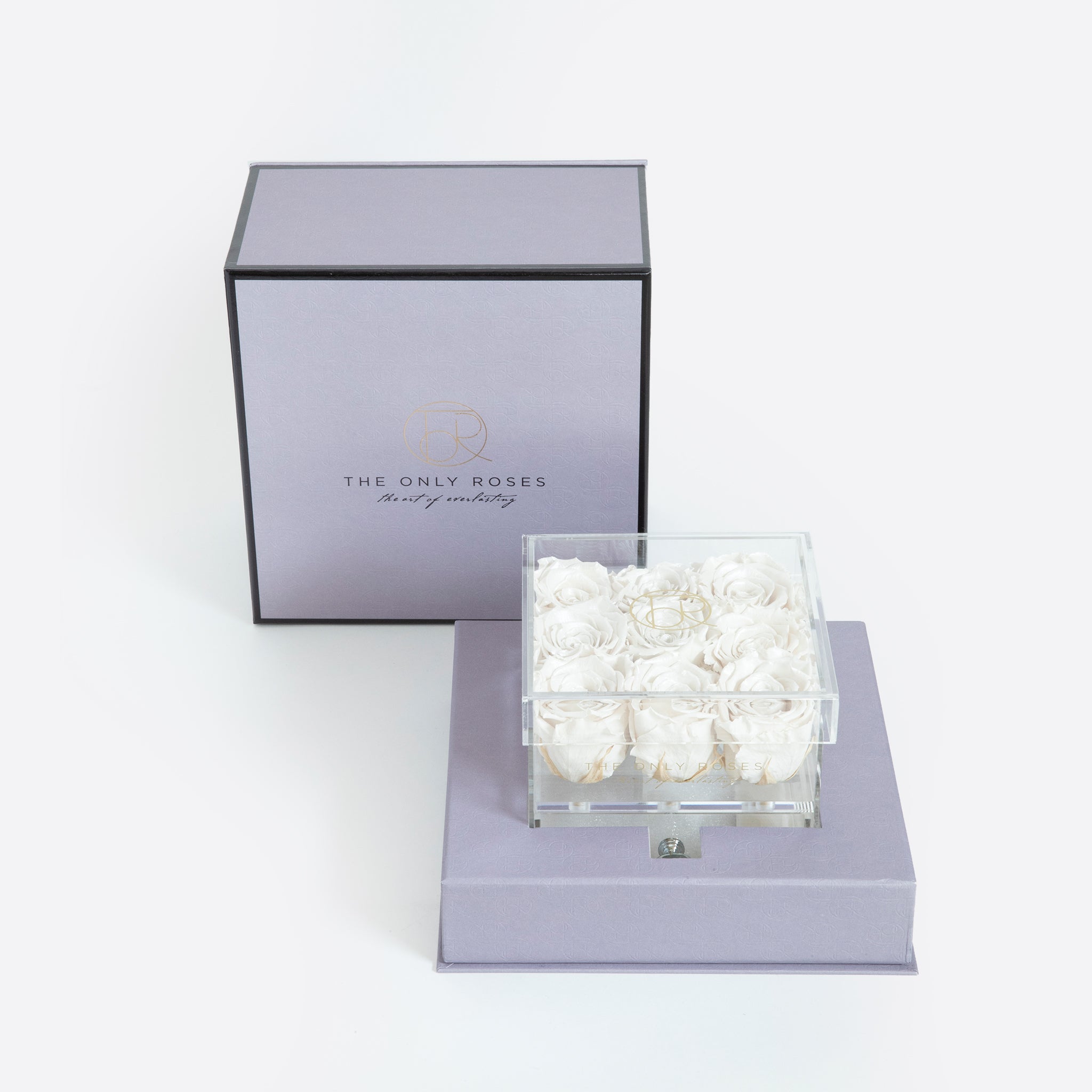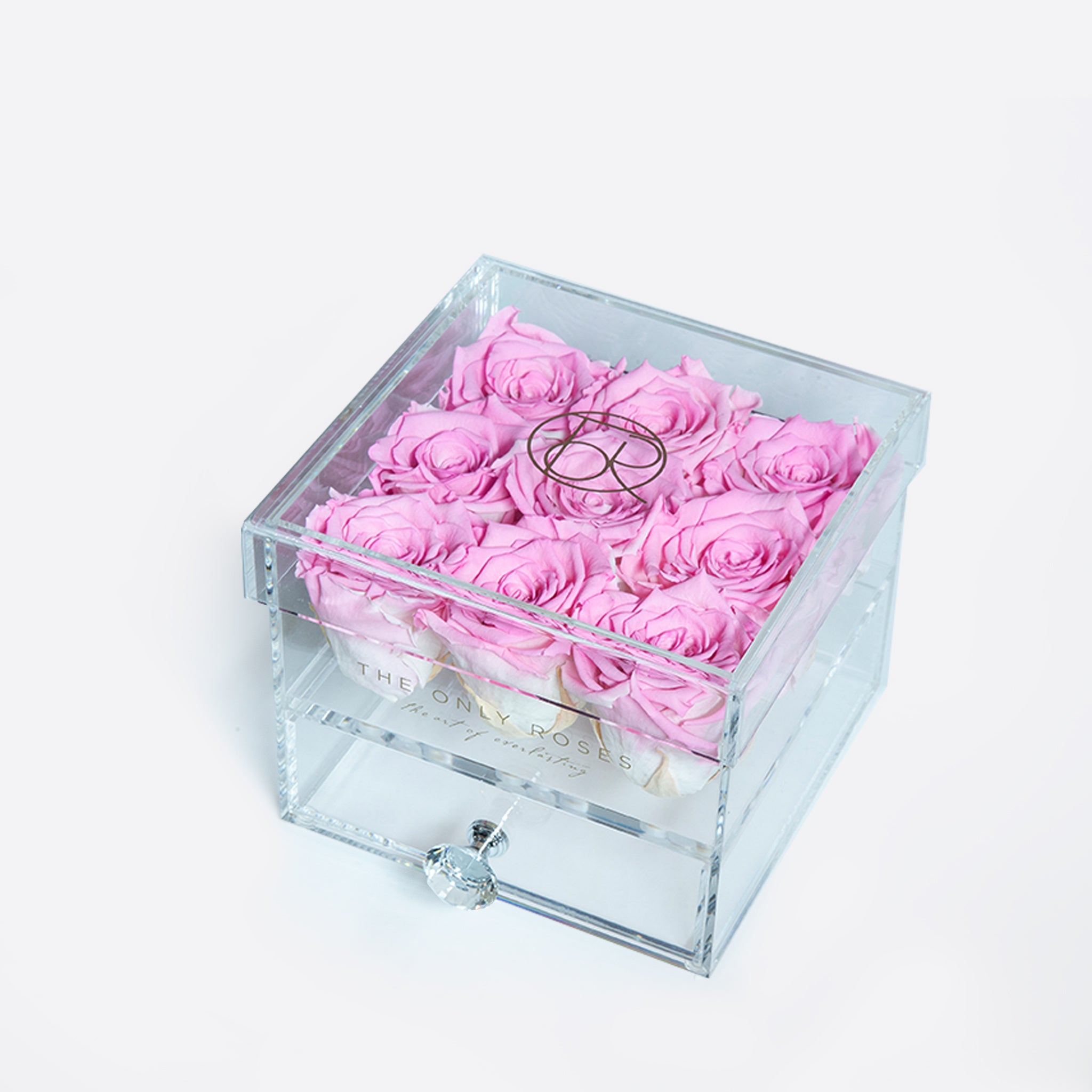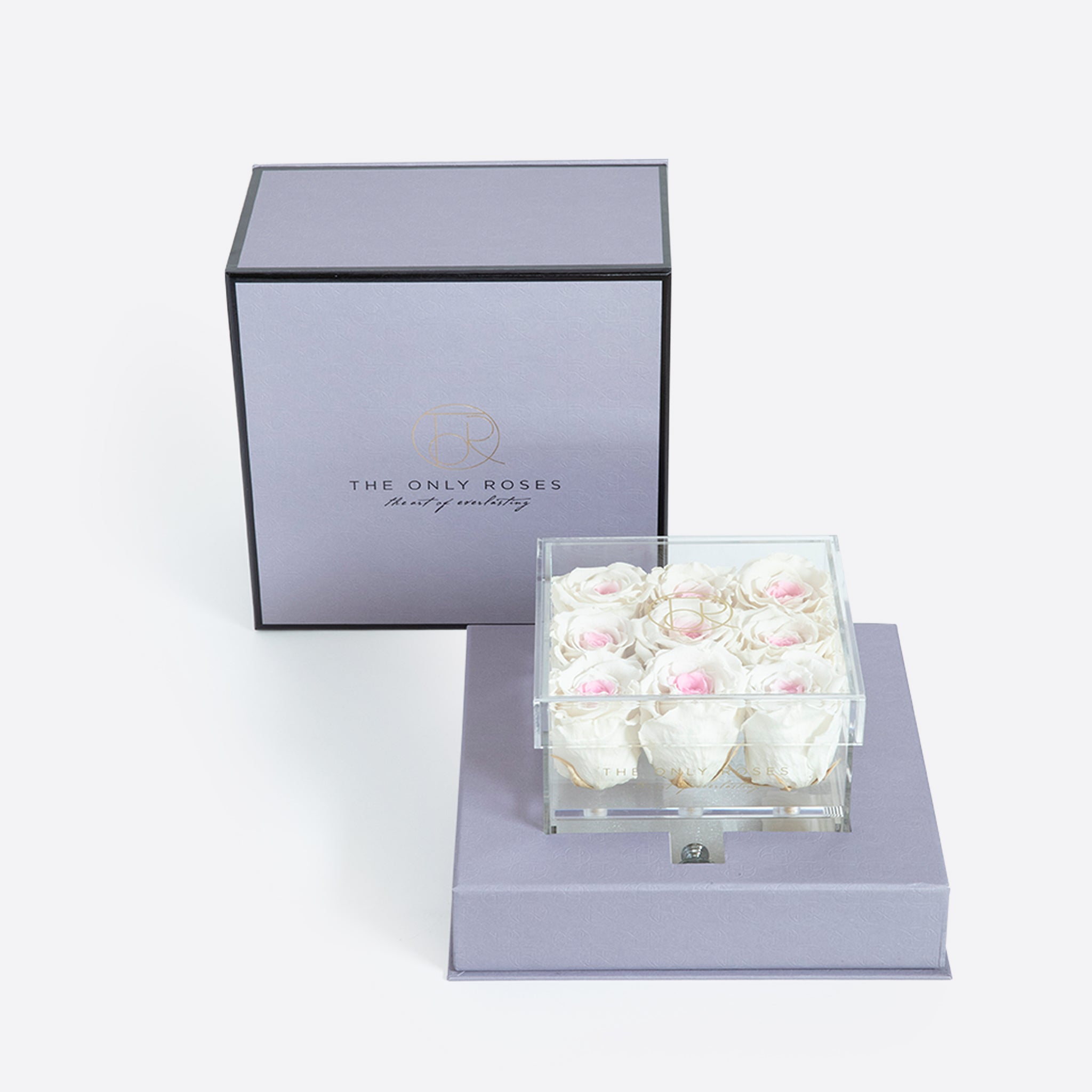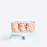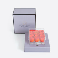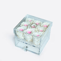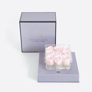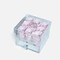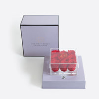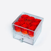 Our Small Square Rose Acrylic Box shows off our preserved Everlasting Roses in the most dramatic fashion — suspended in a see-through box that allows for a 360-degree view of each perfectly picked flower. With the rosebuds so clearly and beautifully presented, you’ll never need to open the box, therefore preserving them for as long as possible. We like to think of these as sleeping beauties, encased in their own little castle.