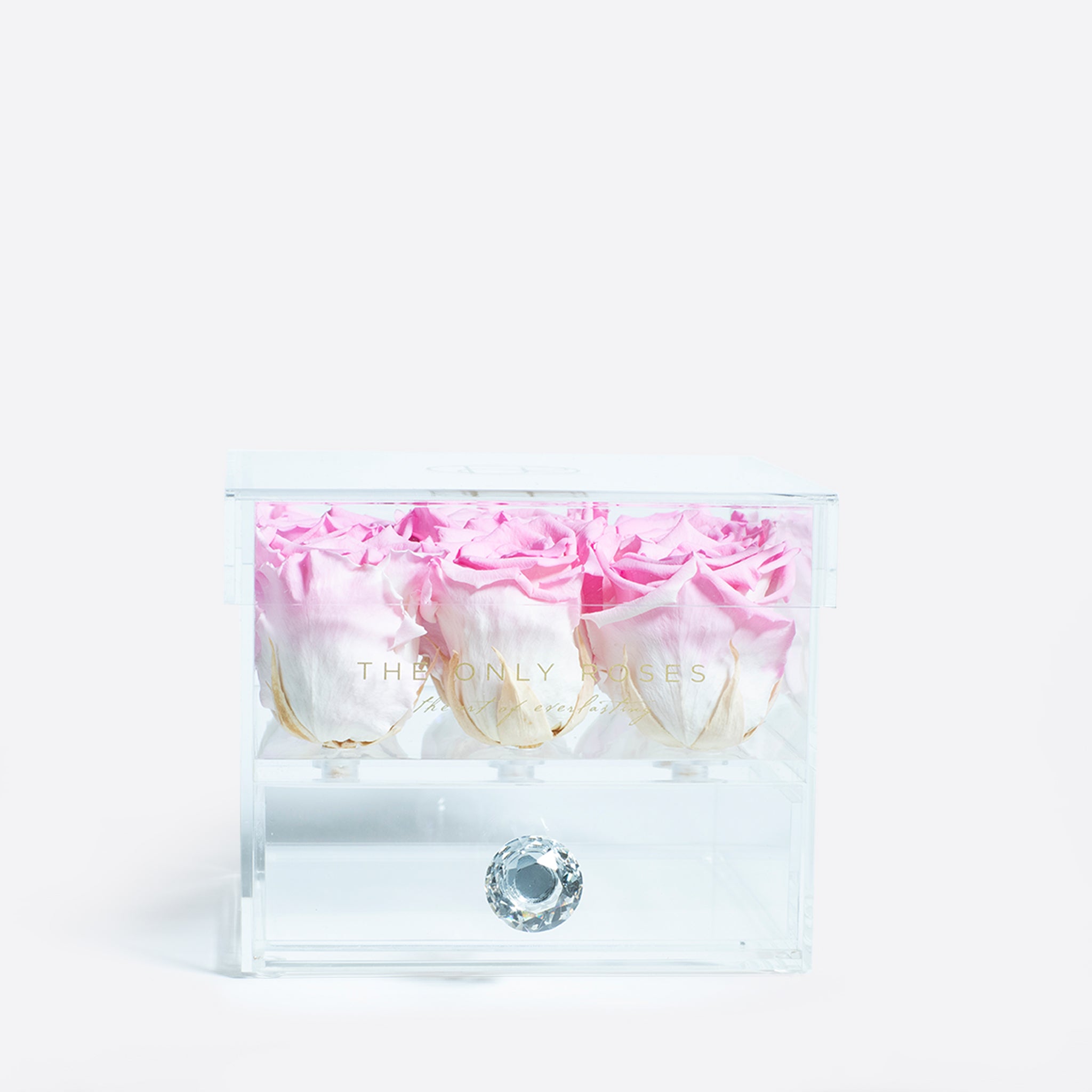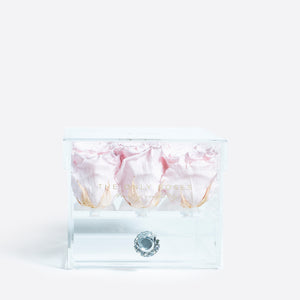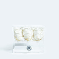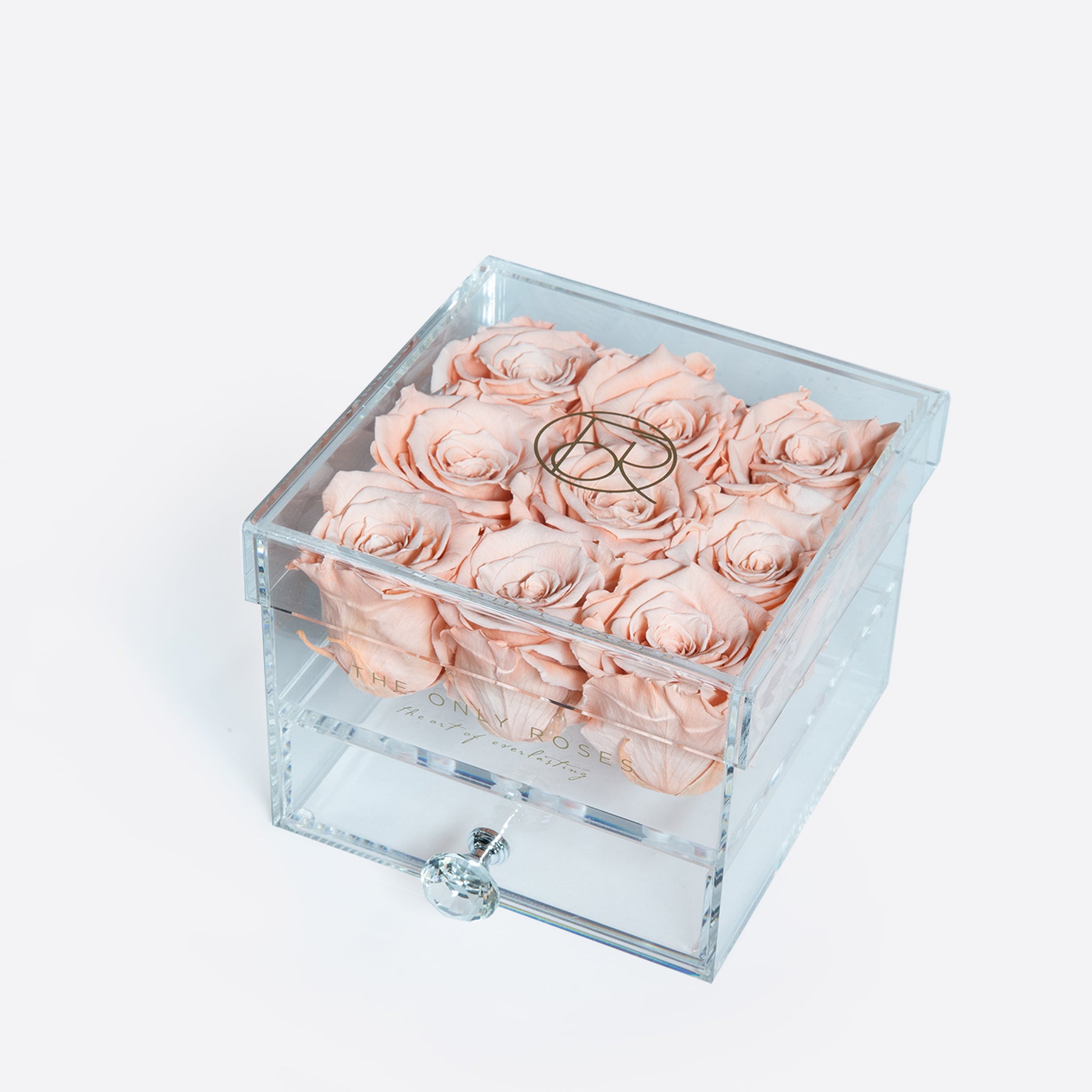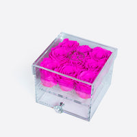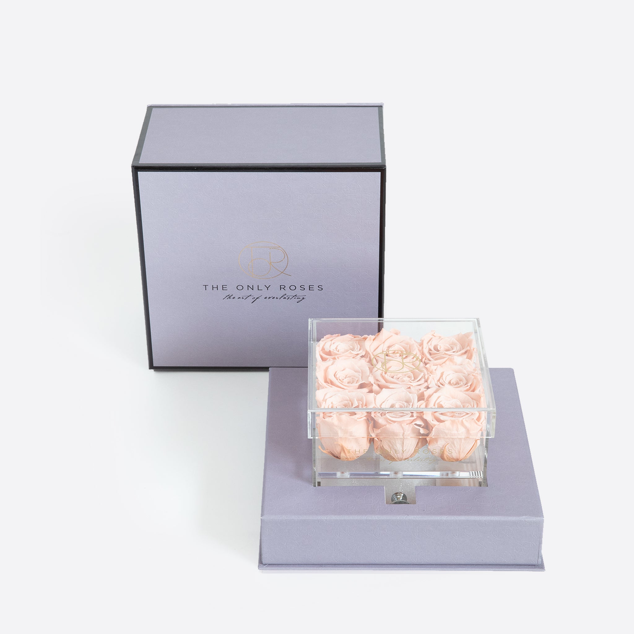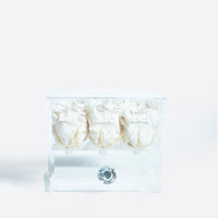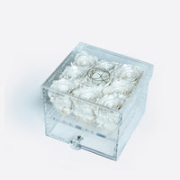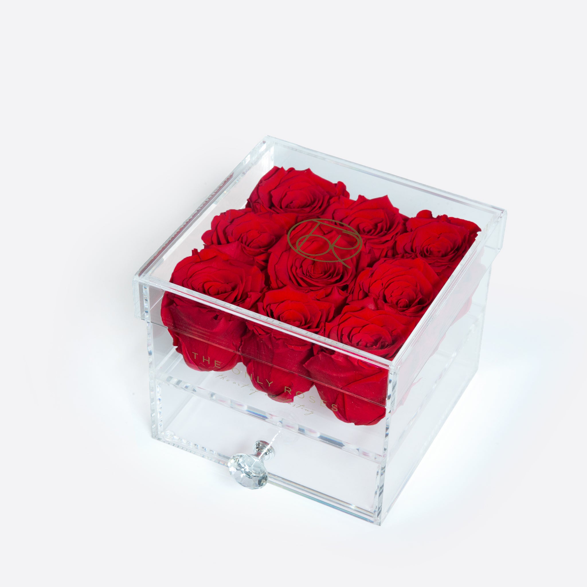 Our Small Square Rose Acrylic Box shows off our preserved Everlasting Roses in the most dramatic fashion — suspended in a see-through box that allows for a 360-degree view of each perfectly picked flower. With the rosebuds so clearly and beautifully presented, you’ll never need to open the box, therefore preserving them for as long as possible. We like to think of these as sleeping beauties, encased in their own little castle.