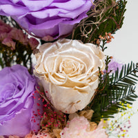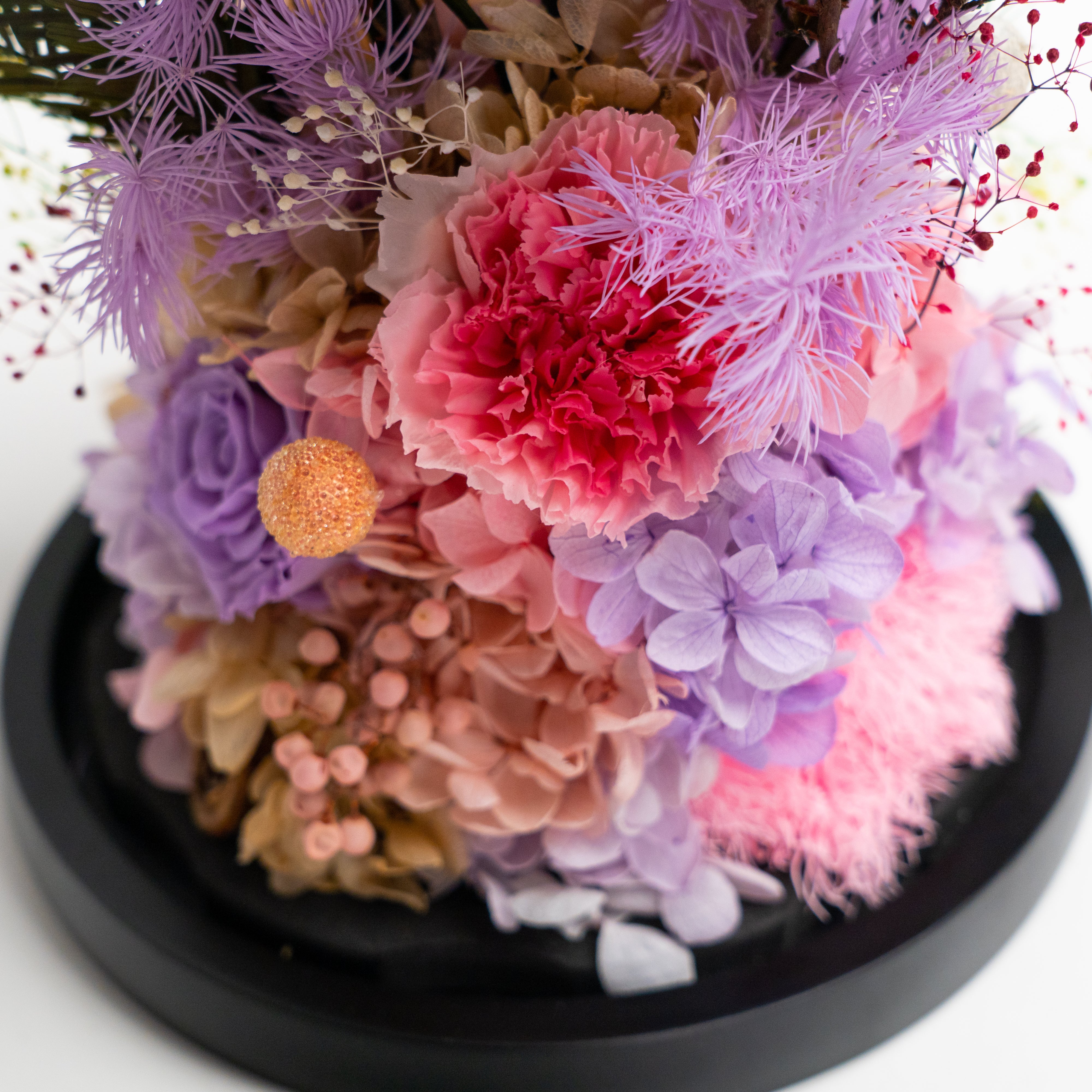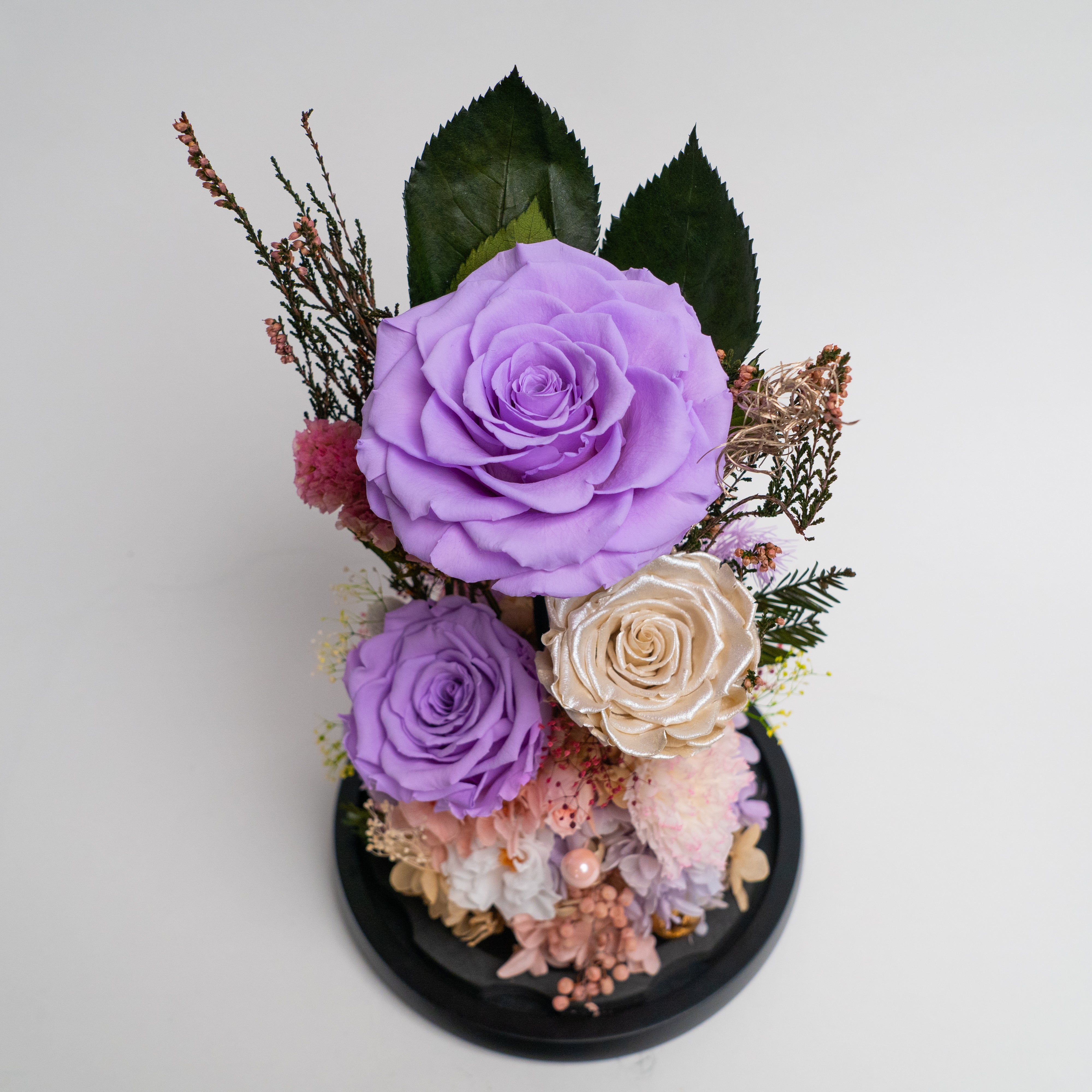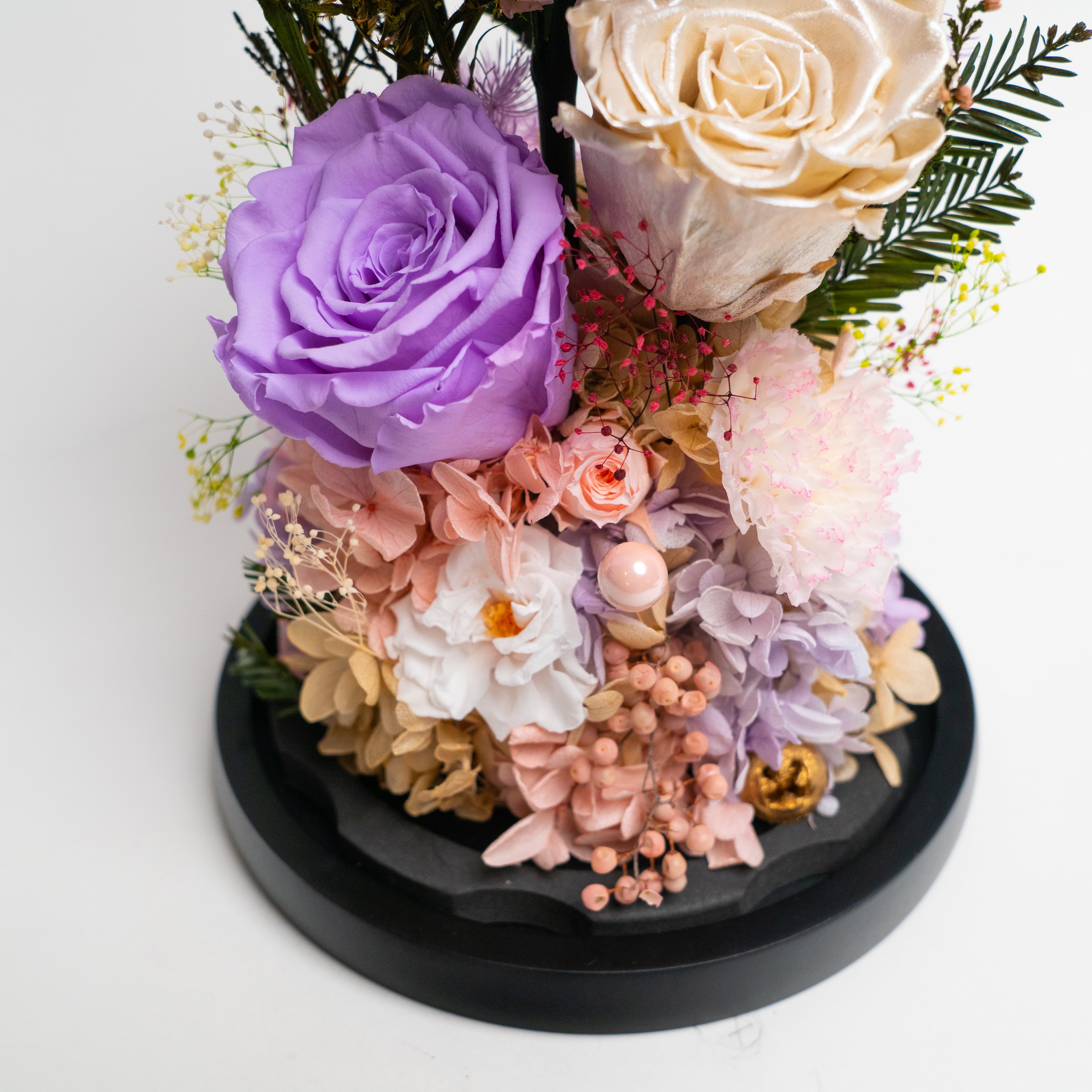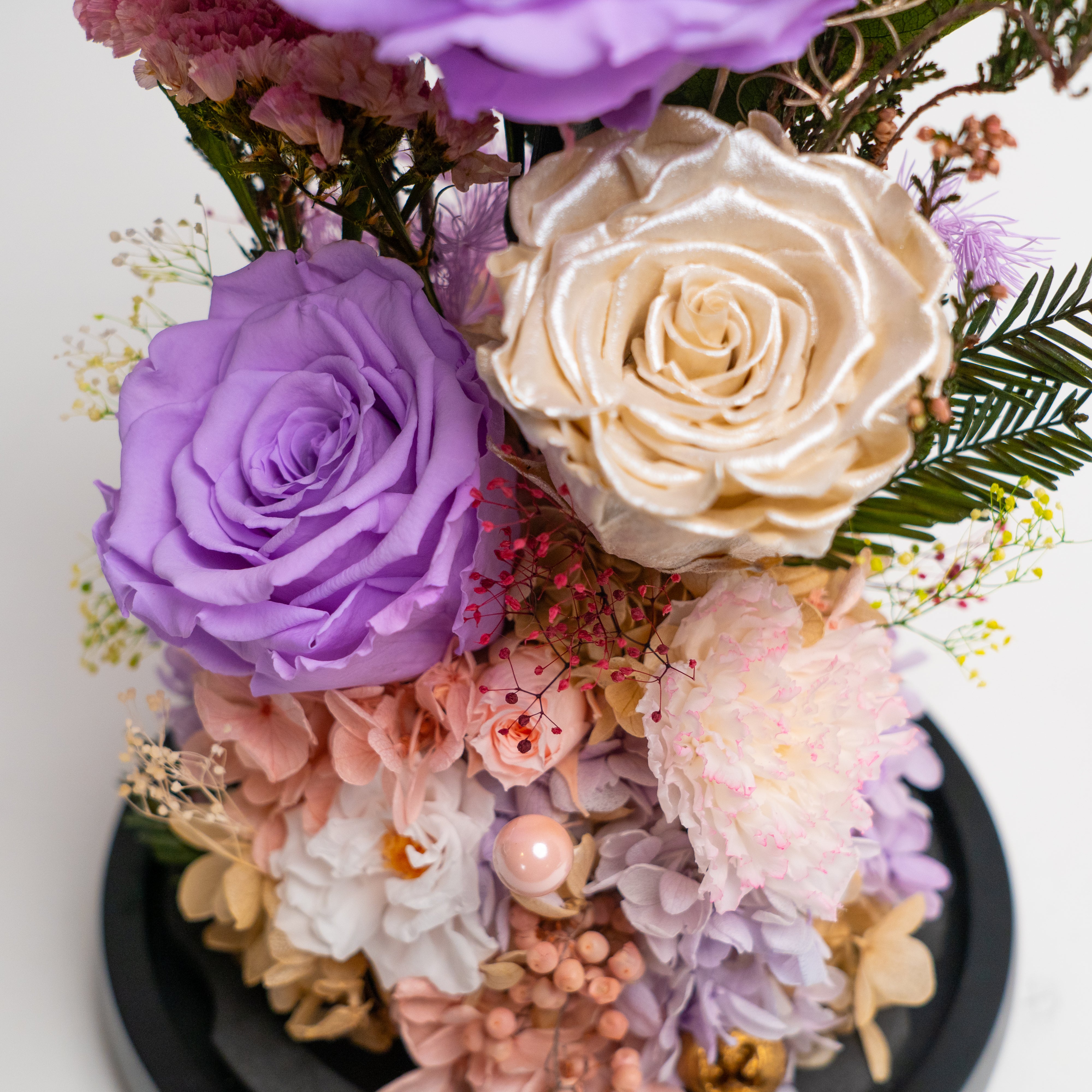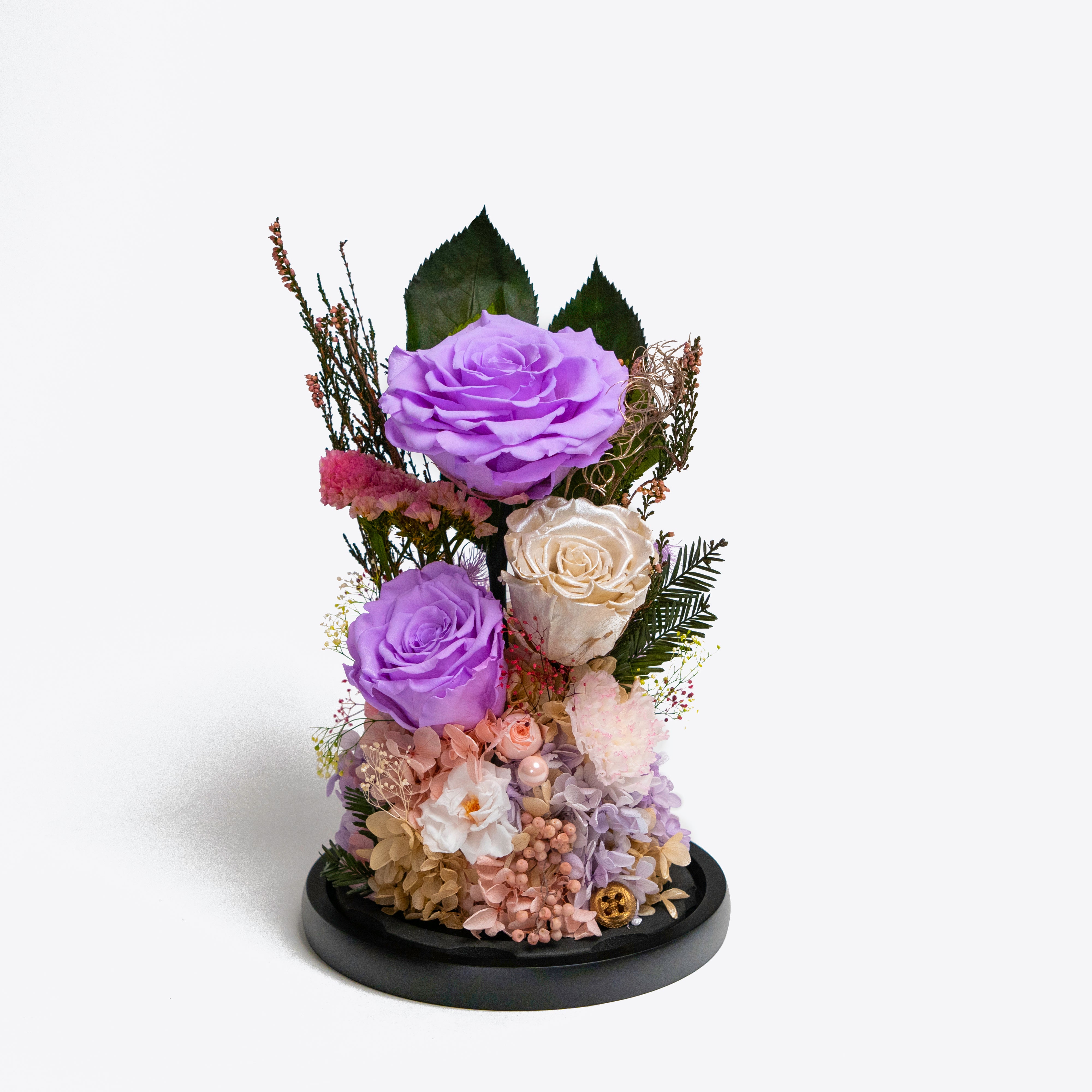 Crafted to perfection, this preserved mix of floral design is presented in a glass dome, which adds to its allure and creates a mesmerizing display. The dome also protects the flowers from dust and other elements, ensuring that they remain as beautiful as the day they were arranged.