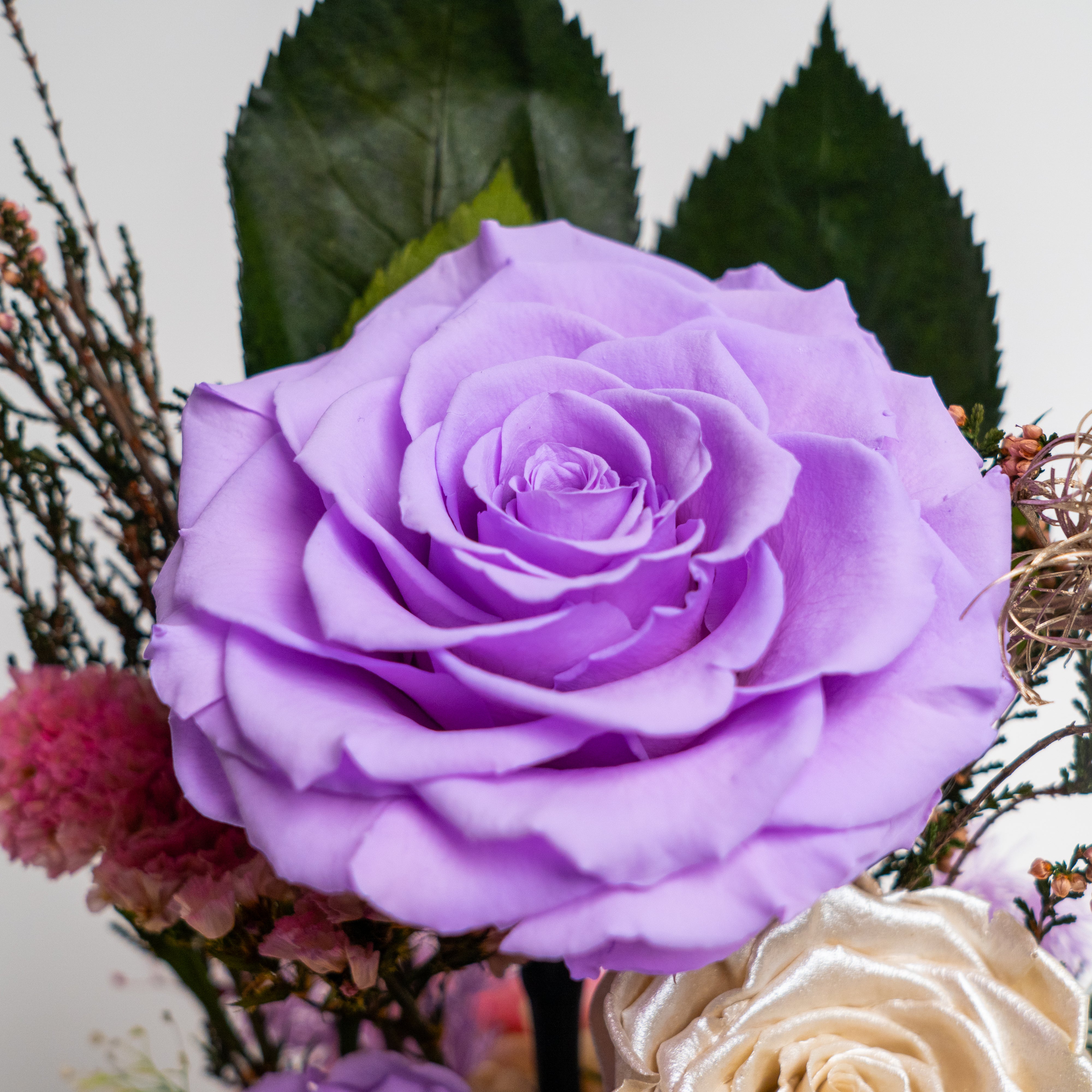 Each flower has been carefully preserved to ensure that it retains its natural beauty and elegance. The result is an arrangement that not only looks exquisite but also lasts for a long time, making it the perfect choice for those who want to enjoy the beauty of flowers without having to worry about their short lifespan.